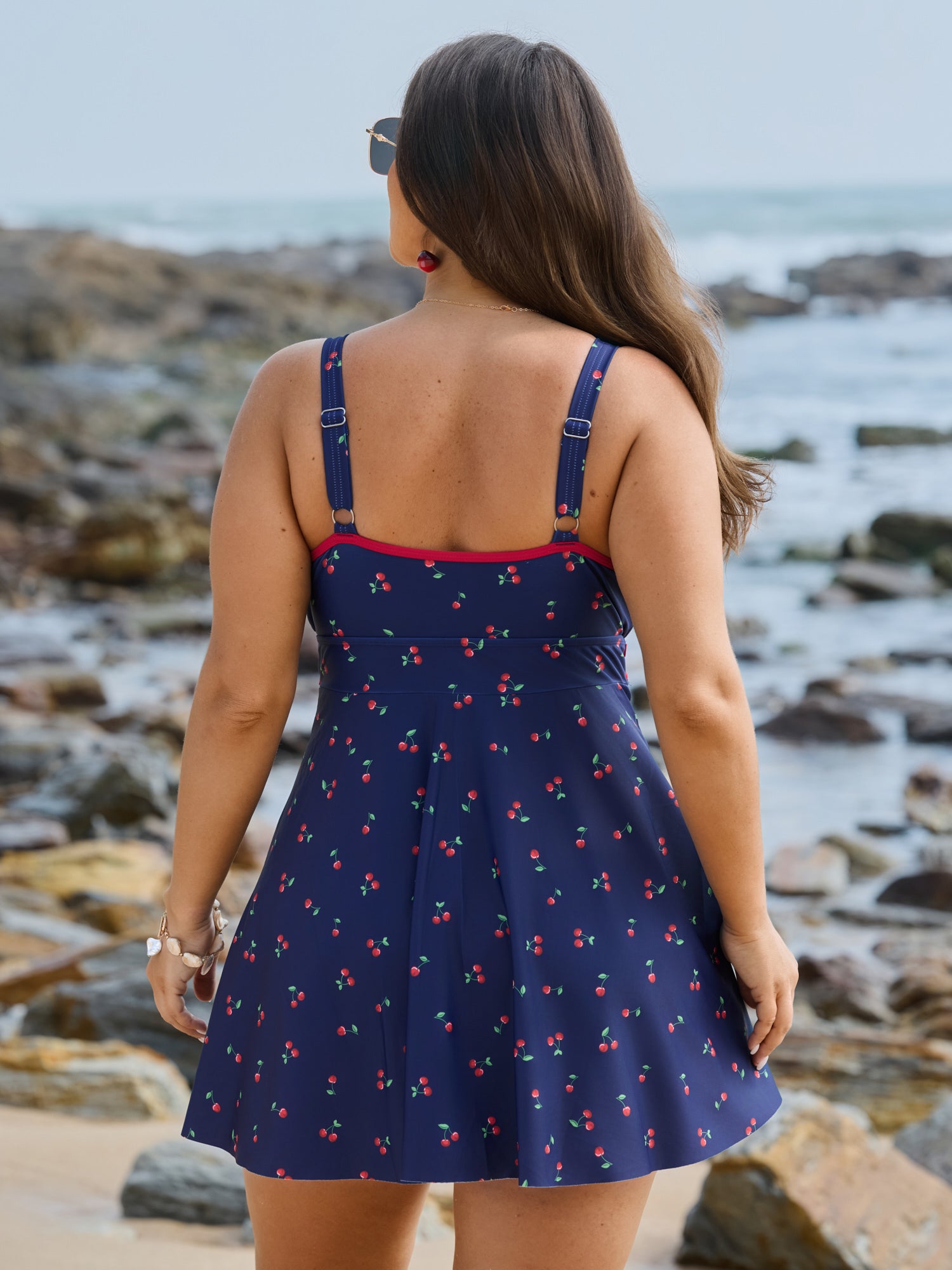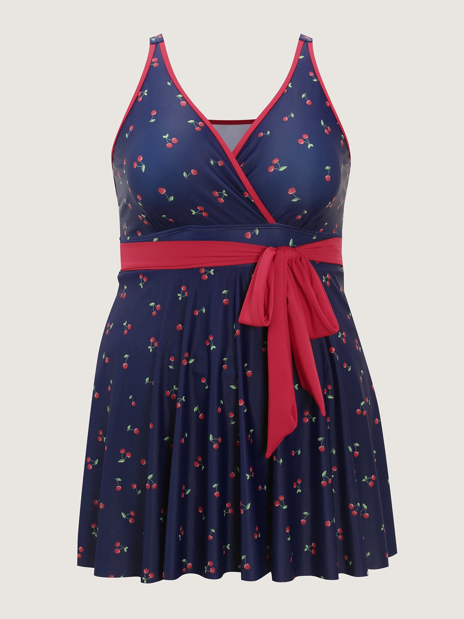 Shop Cherry Print Belted Color Contrast Swim Dress now and redefine your style with confidence at BloomChic. Tailored for mid and plus-size women. This trendy Swimwear Women, sizes 10-30. Color:Navy;Style:Resort;Neckline:Overlap Collar;Sleeve Type:Sleeveless;Pattern Type:Fruit;Prints:Fruit and vegetable print;Details:Tie knot, Contrast;Pocket:No-pocket;Belt:Belt;Chest pad:Removable Padding;Lining:Lining;Closure Type:Non;Structural function:Adaptive-Fit,Cinched & Flared;One-piece or split swim dresses:Built-in bottoms
