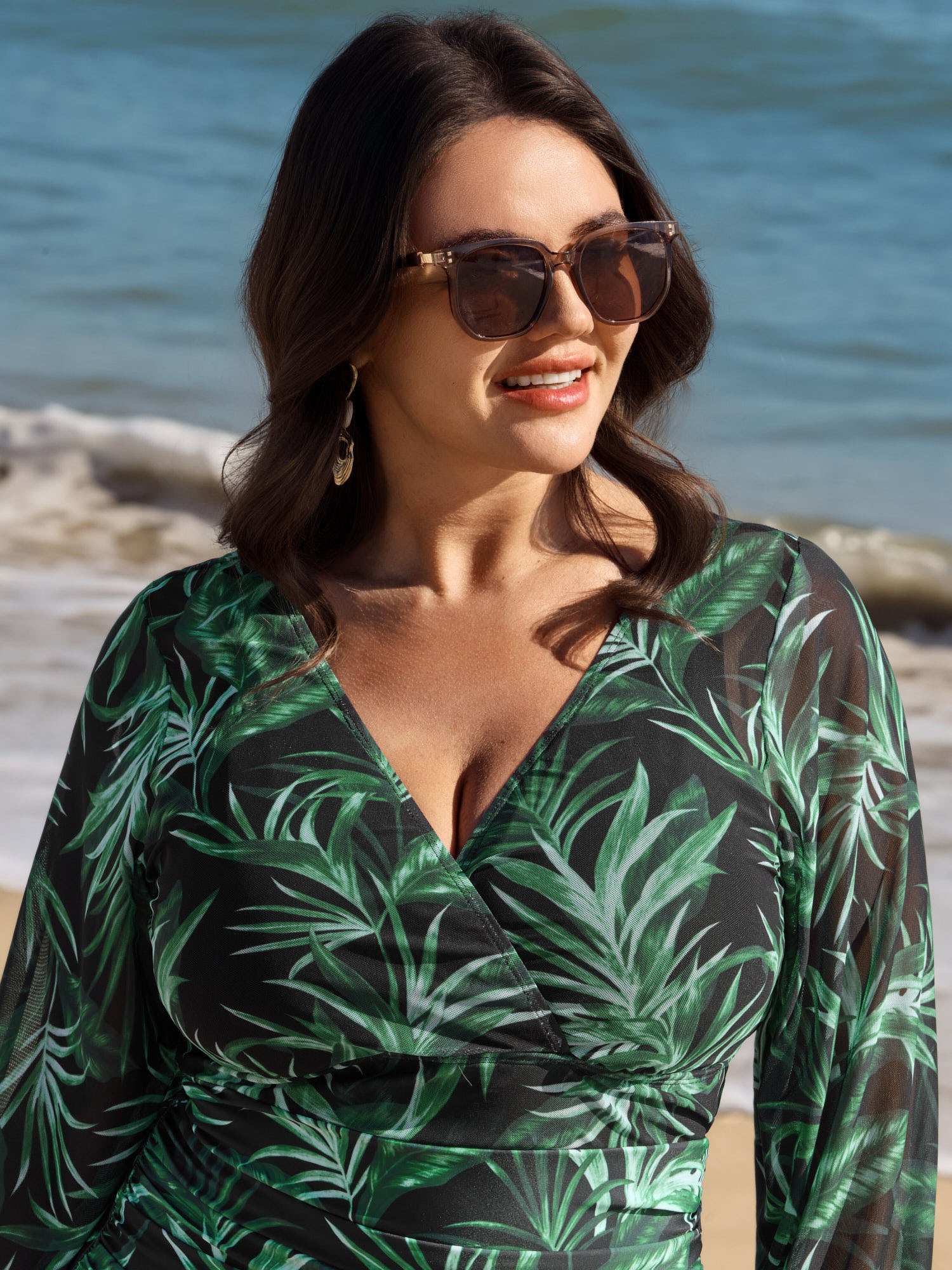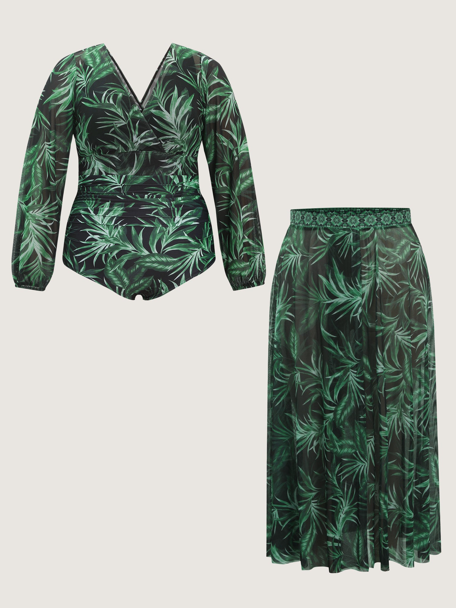 Shop Tropical Plant Print One-Piece Swimsuit Set now and redefine your style with confidence at BloomChic. Tailored for mid and plus-size women. This trendy Swimwear Women, sizes 10-30. Color:Black;Style:Resort;Coverage:Full;Neckline:Overlap Collar;Sleeve Type:Regular Sleeve;Prints:Tropical;Pocket:No-pocket;Belt:No-belt;Chest pad:Removable Padding;Lining:Lining;Closure Type:Non;Structural function:Tummy-Sculpt,Adaptive-Fit;Swimsuit types:Sarong & One-Piece Set