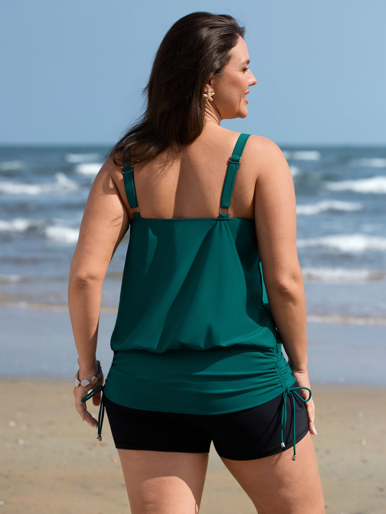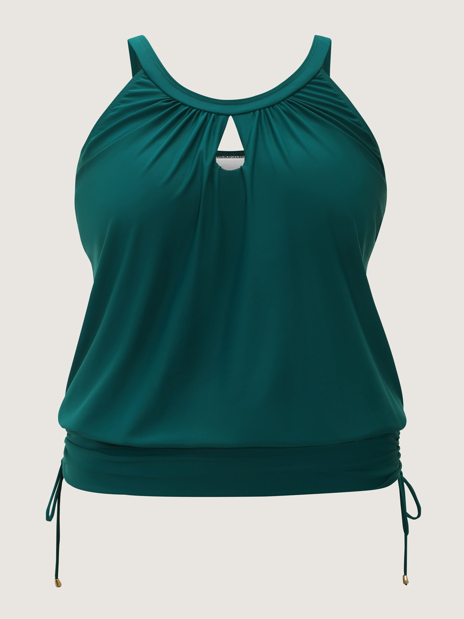 Shop Water Drop Cut-Out Ruched Swim Top now and redefine your style with confidence at BloomChic. Tailored for mid and plus-size women. This trendy Swimwear Women, sizes 10-30. Color:Dark Green;Style_2:Resort;Cup Type:Fixed cups;Coverage:Full;Prints:Non;Details:Drawstring, Cut-Out;Pocket:No-pocket;Belt:No-belt;Chest pad:Non-removable padding;Structural function:Bust-Lift,Adaptive-Fit;Swimsuit types:Tankini