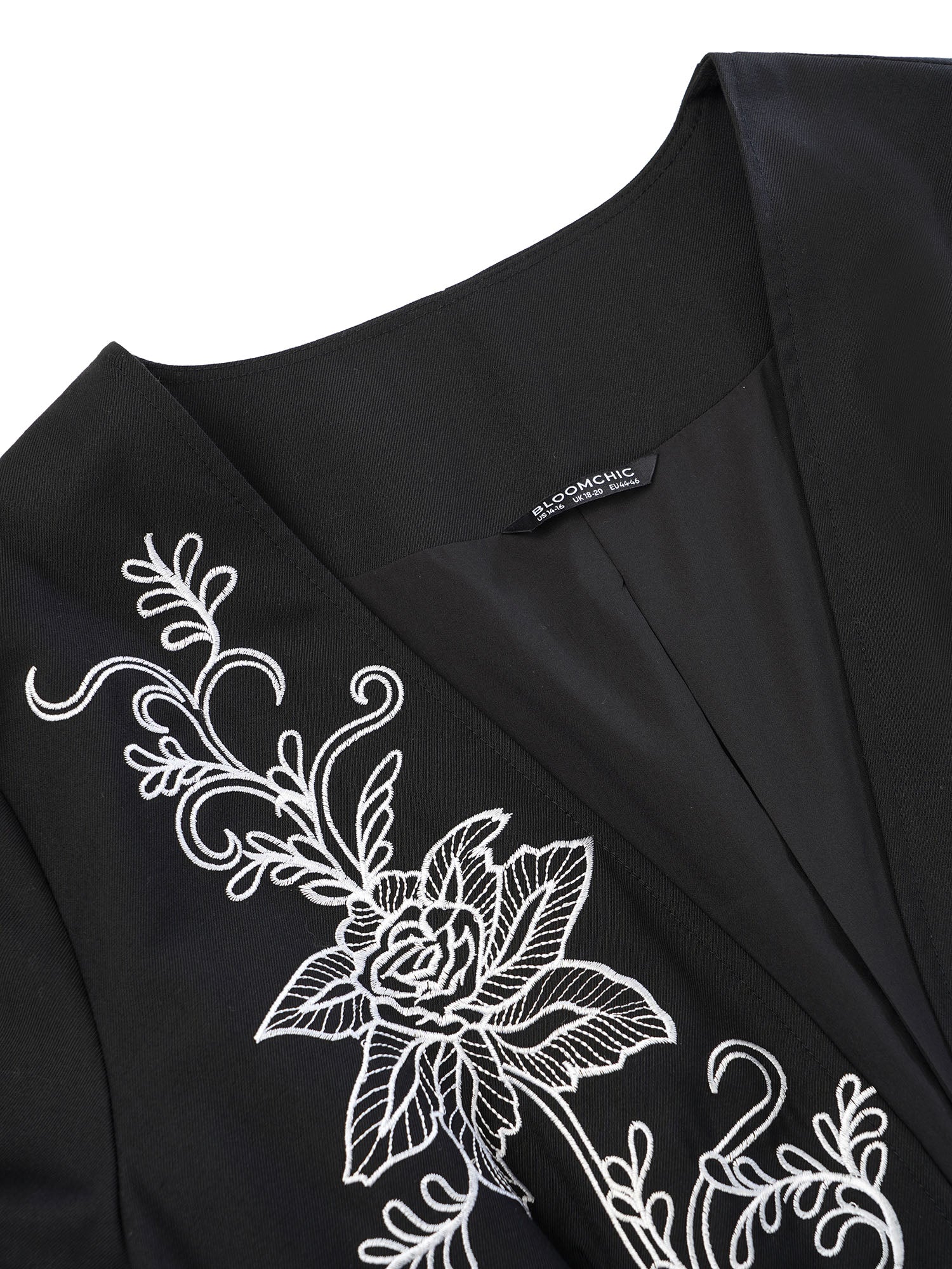 Shop Floral Embroidered Hook Buckle Pocket Blazer now and redefine your style with confidence at BloomChic. Tailored for mid and plus-size women. This trendy Outerwear Women, sizes 10-30. Season:Winter;Color:Black;Style:Elegant;Neckline:Open Front;Sleeve Type:Regular Sleeve;Pattern Type:Floral;Details:Pocket, Contrast, Lined, Embroidered;Pocket:It is perfectly sized to carry a phone.;Belt:No-belt;Lining:Lining
