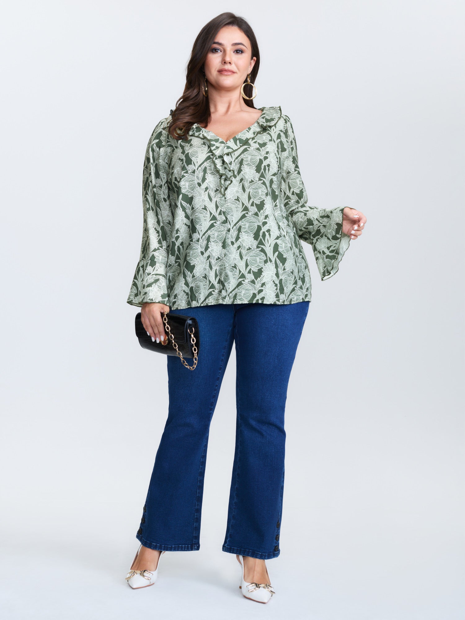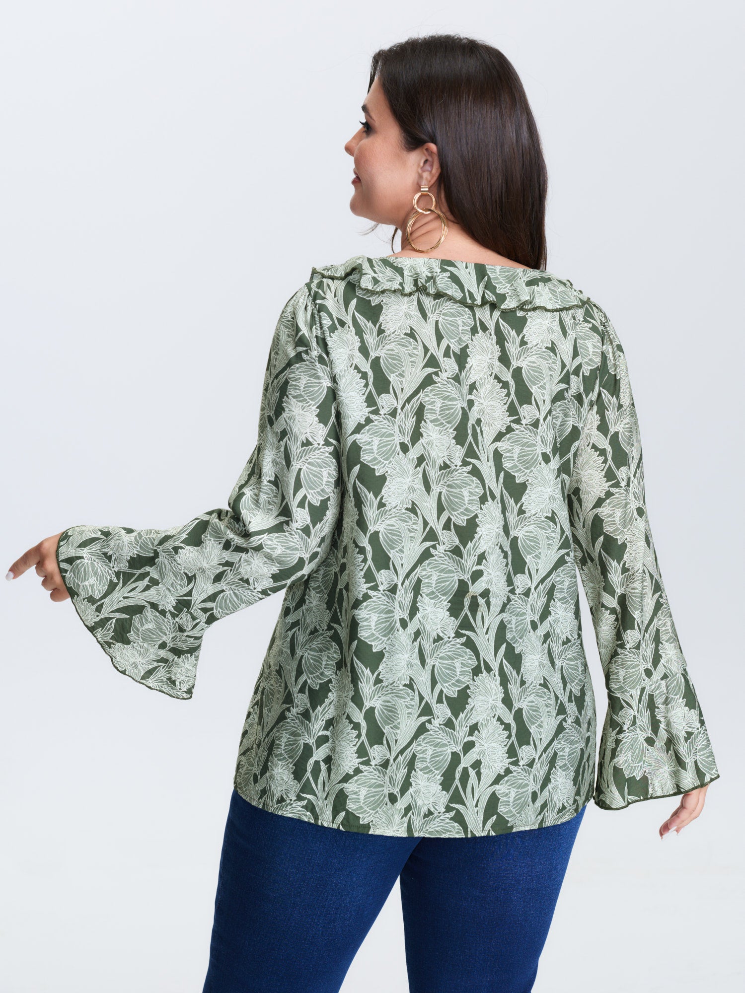 Shop Breezy Floral Print Ruffled Neckline Blouse now and redefine your style with confidence at BloomChic. Tailored for mid and plus-size women. This trendy Tops Women, sizes 10-30. Color:Army Green;Style:Romantic;Prints:Ditsy floral;Neckline:V-neck;Sleeve Type:Bell Sleeve;Details:Ruffles, Contrast;Pocket:No-pocket