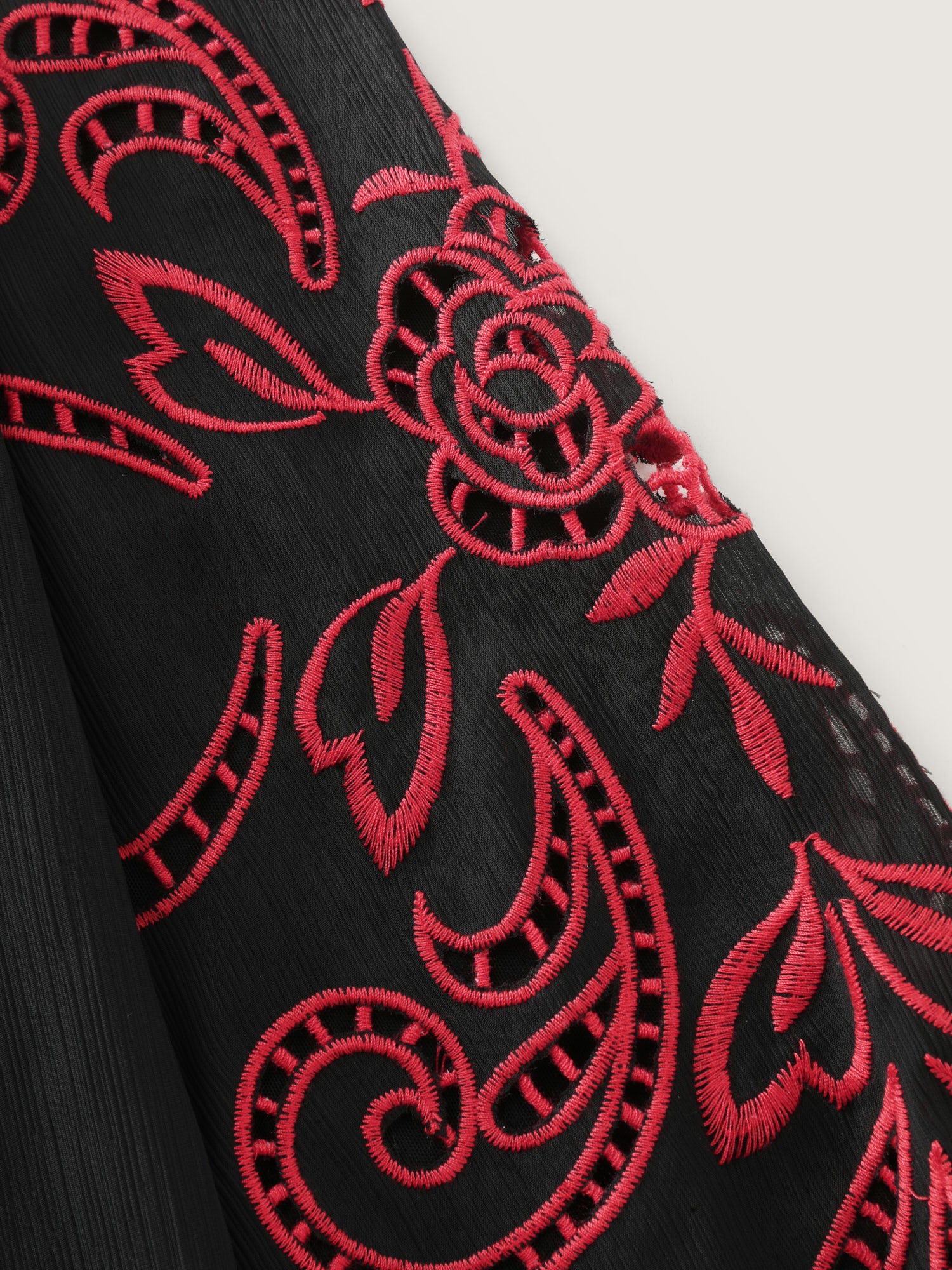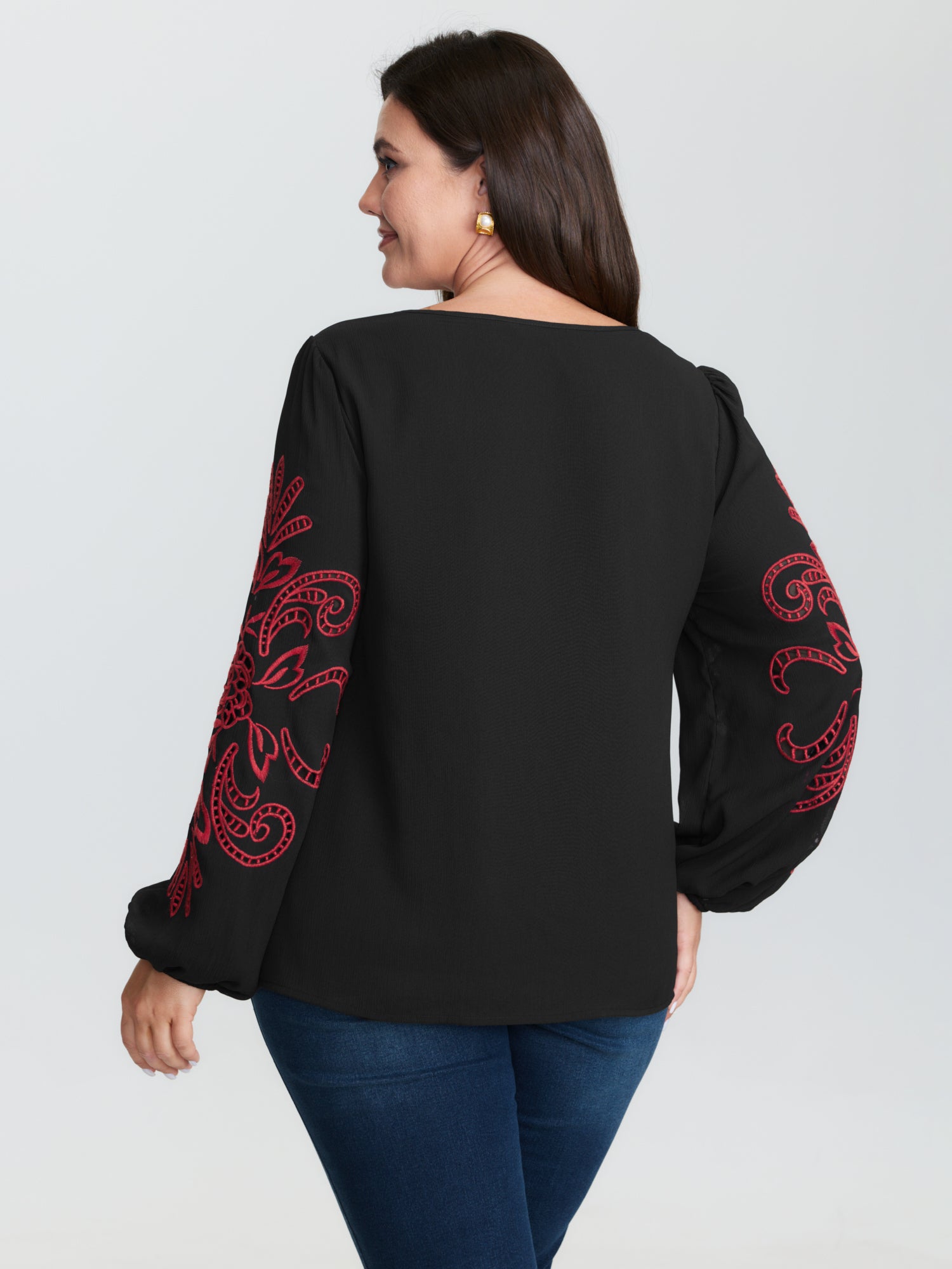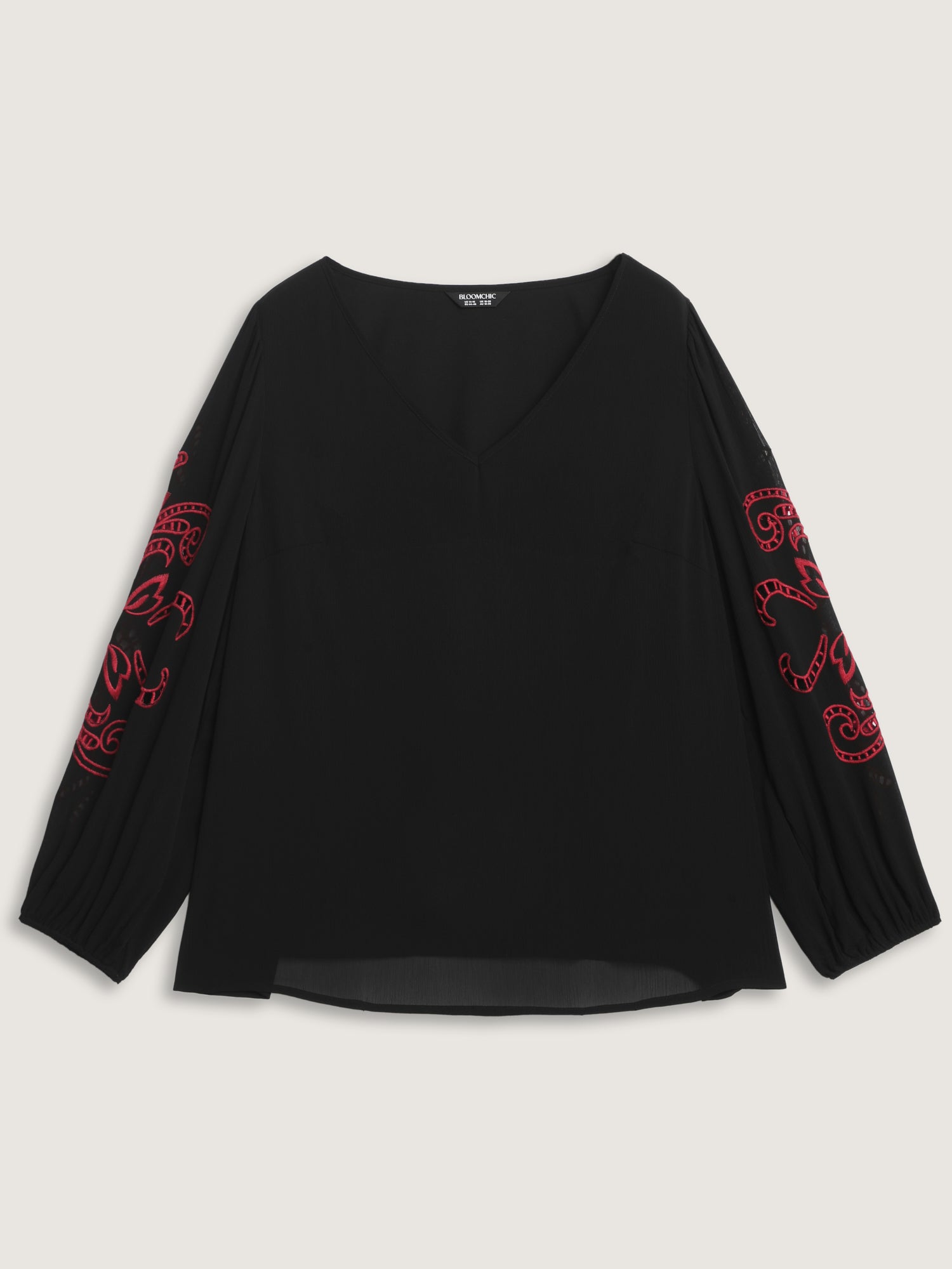 Shop Cut-Out Embroidered Sleeve Blouse now and redefine your style with confidence at BloomChic. Tailored for mid and plus-size women. This trendy Tops Women, sizes 10-30. Color:Black;Style:Timeless;Prints:Synthetic texture;Neckline:V-neck;Sleeve Type:Elastic cuff;Details:Texture, Contrast, See through;Pocket:No-pocket