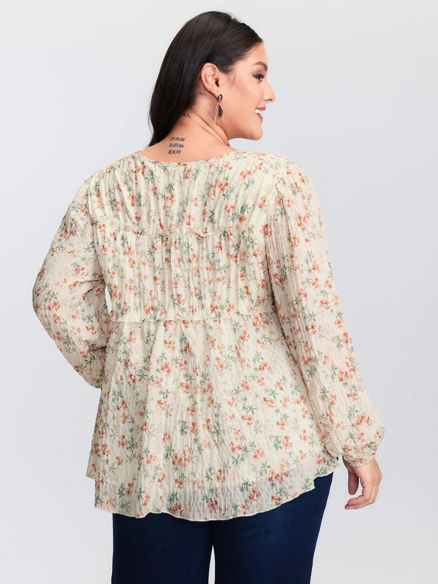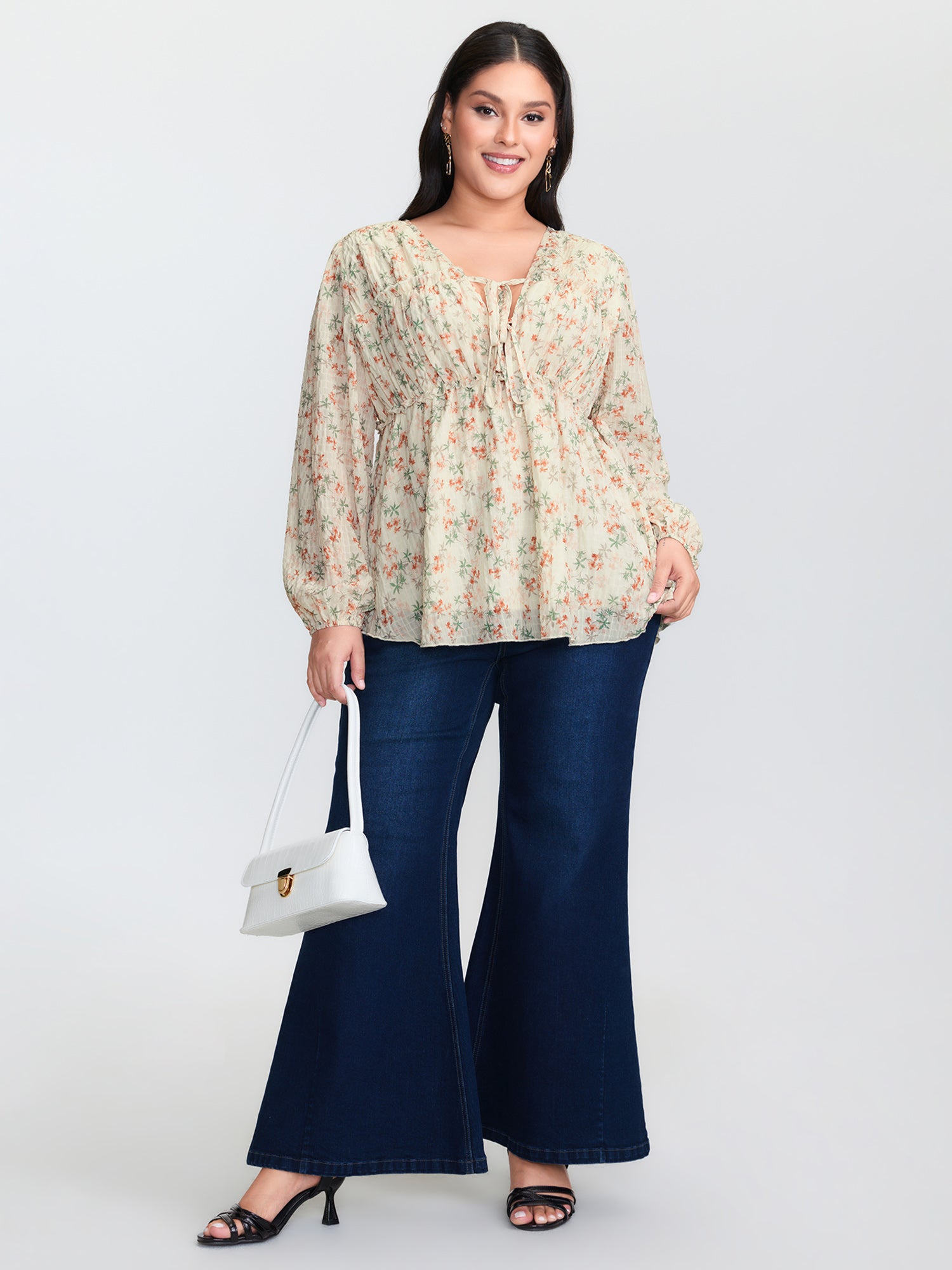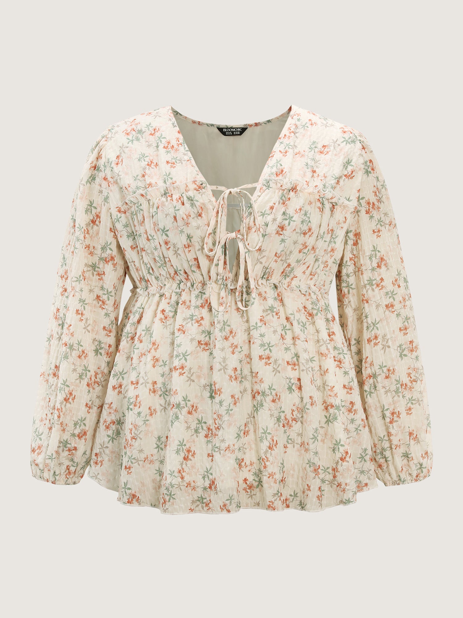 Shop Floral Chiffon Ruffled Tie Front Blouse now and redefine your style with confidence at BloomChic. Tailored for mid and plus-size women. This trendy Tops Women, sizes 10-30. Color:Beige;Style:Timeless;Prints:Ditsy floral;Neckline:Deep V-neck;Sleeve Type:Lantern Sleeve;Details:Tie knot, Ruffles, Gathered;Pocket:No-pocket