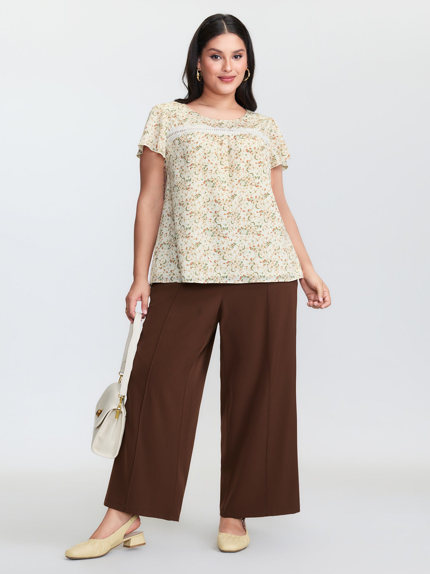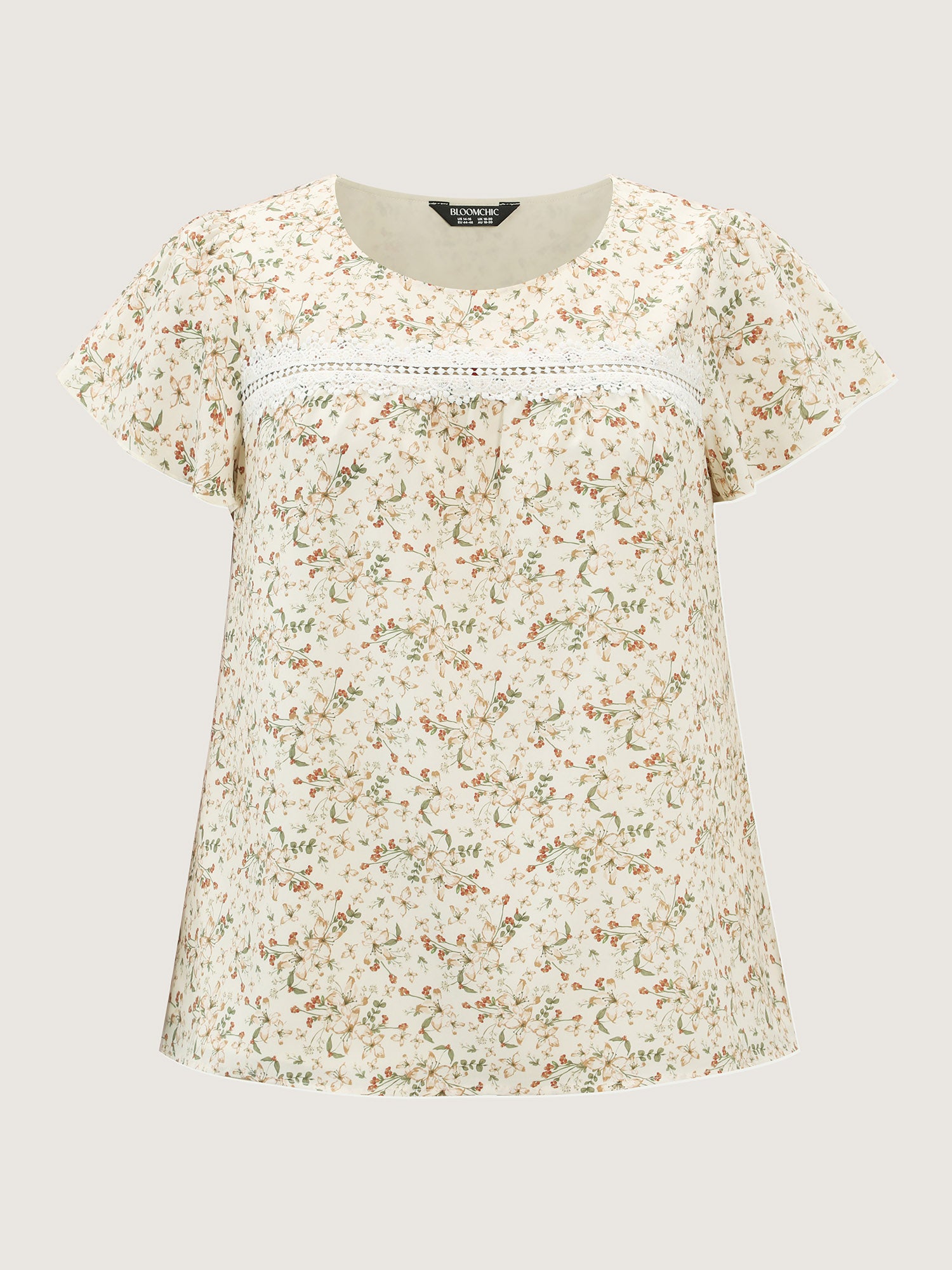 Shop Floral Print Lace Trim Blouse now and redefine your style with confidence at BloomChic. Tailored for mid and plus-size women. This trendy Tops Women, sizes 10-30. Color:Beige;Style_2:Timeless;Prints:Ditsy floral;Neckline:Round Neck;Sleeve Type:Cap sleeve;Details:Cut-Out, Gathered, Contrast, Patchwork;Pocket:No-pocket