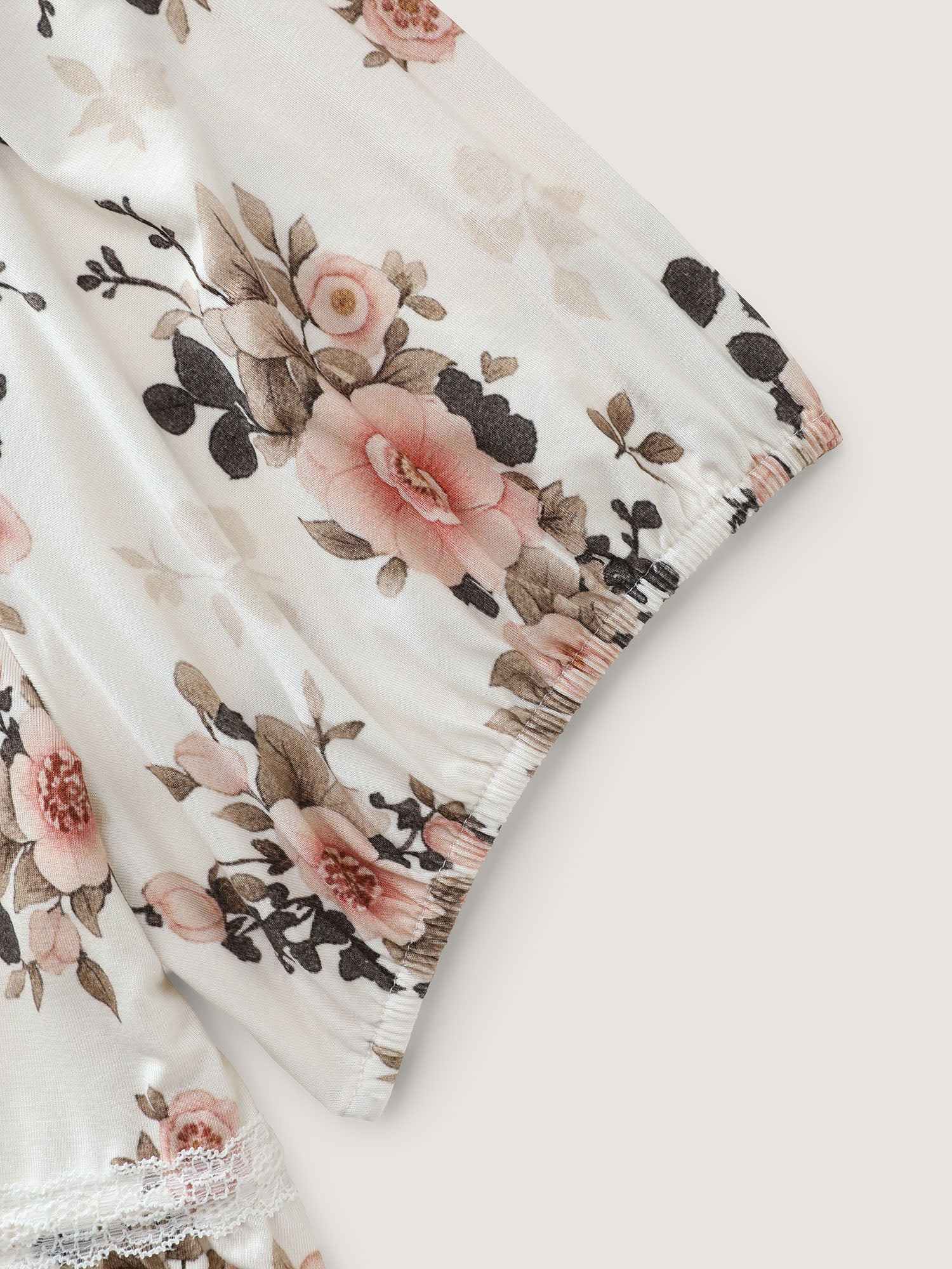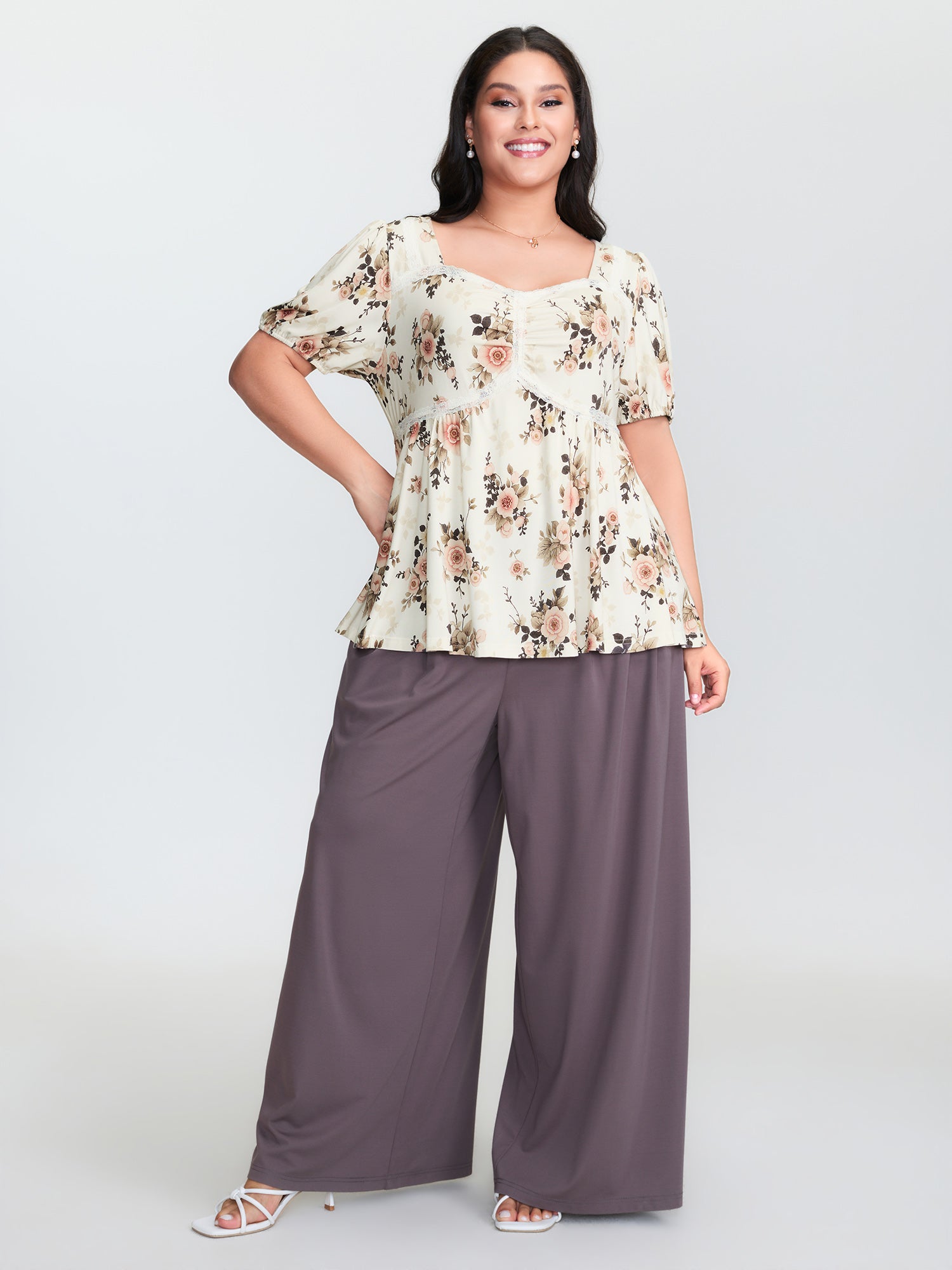 Shop Floral Print Lace Trim Knit Top now and redefine your style with confidence at BloomChic. Tailored for mid and plus-size women. This trendy Tops Women, sizes 10-30. Color:lvory;Style:Romantic;Prints:Floral;Neckline:Heart neckline;Sleeve Type:Puff Sleeve;Details:Patchwork, Contrast, Gathered, Woven ribbon&lace trim;Pocket:No-pocket