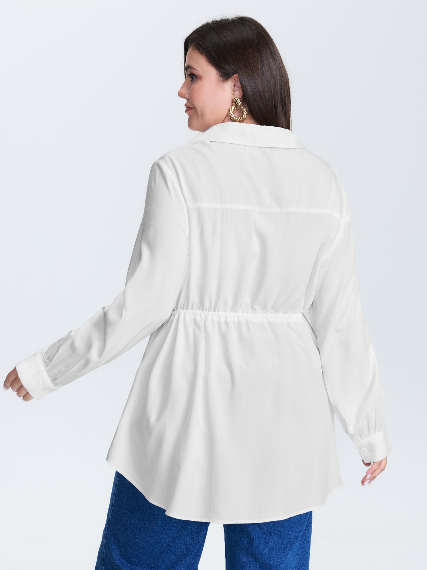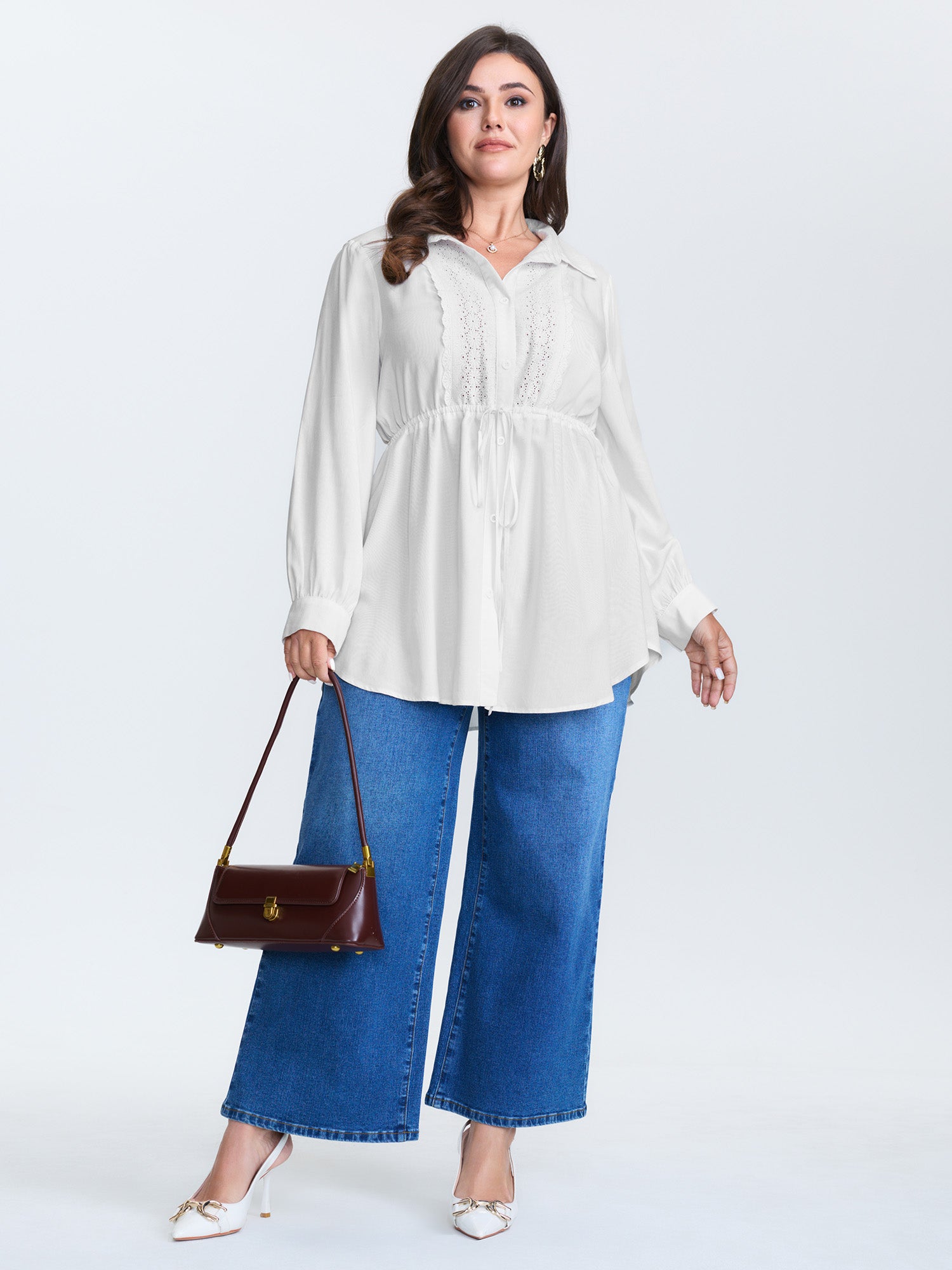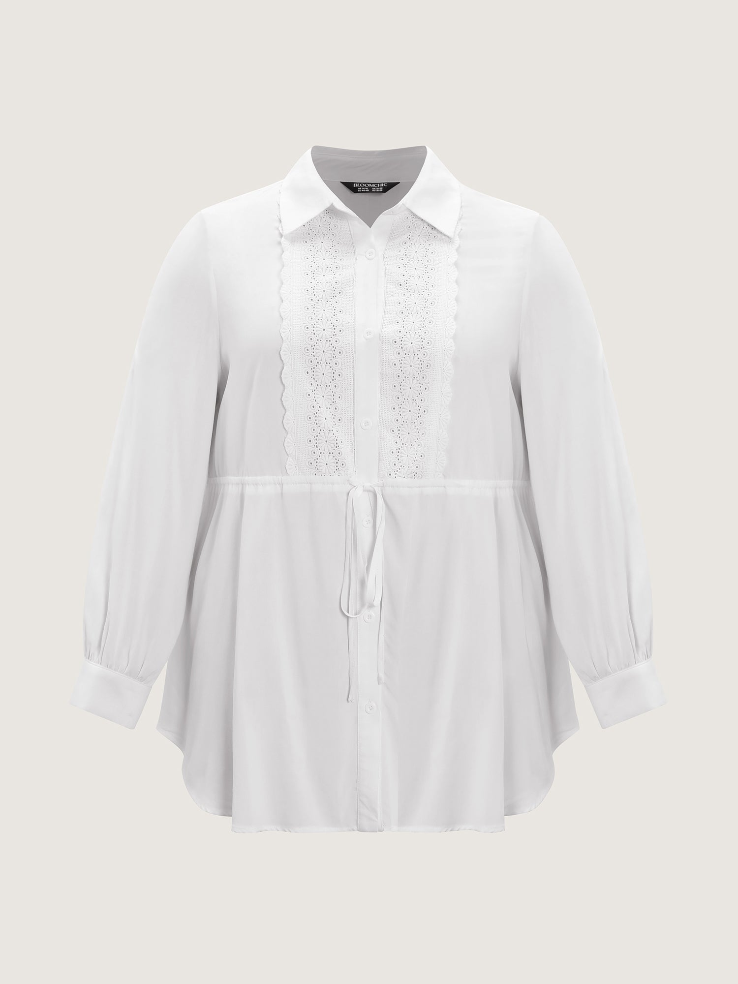 Shop Lace Cut-Out Drawstring Waist Blouse now and redefine your style with confidence at BloomChic. Tailored for mid and plus-size women. This trendy Tops Women, sizes 10-30. Color:White Smoke;Style:Timeless;Prints:Synthetic texture;Neckline:Shirt collar;Sleeve Type:Gathered cuff;Details:Texture, Drawstring, Patchwork;Pocket:No-pocket