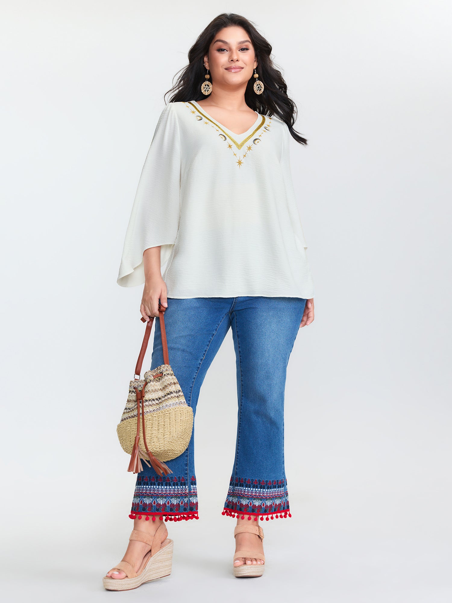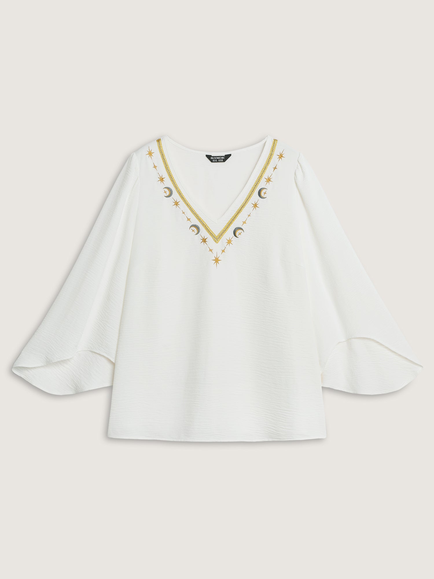 Shop Star Moon Embroidered Neckline Flared Blouse now and redefine your style with confidence at BloomChic. Tailored for mid and plus-size women. This trendy Tops Women, sizes 10-30. Color:Original White;Style:Boho;Prints:Stars and moons;Neckline:Deep V-neck;Sleeve Type:Ruffle Sleeve;Pocket:No-pocket