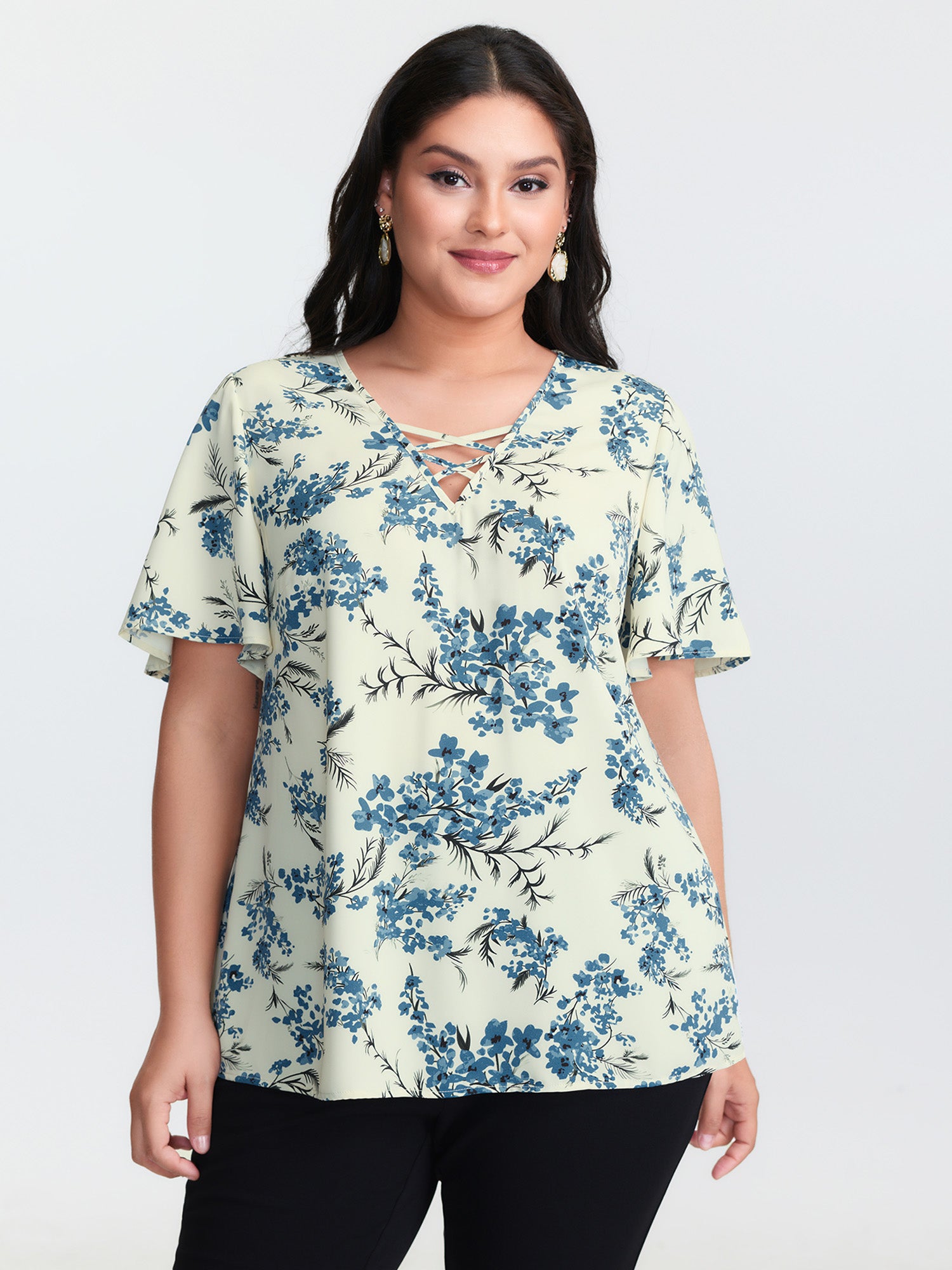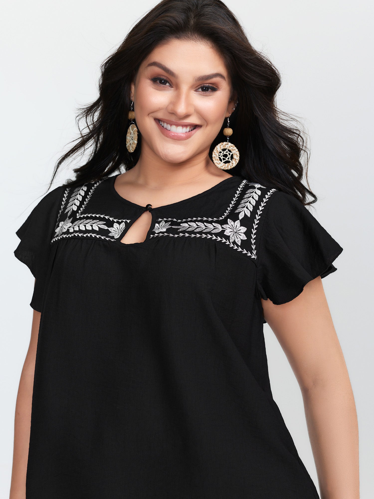 Embroidered Neckline Flutter Sleeve Blouse
