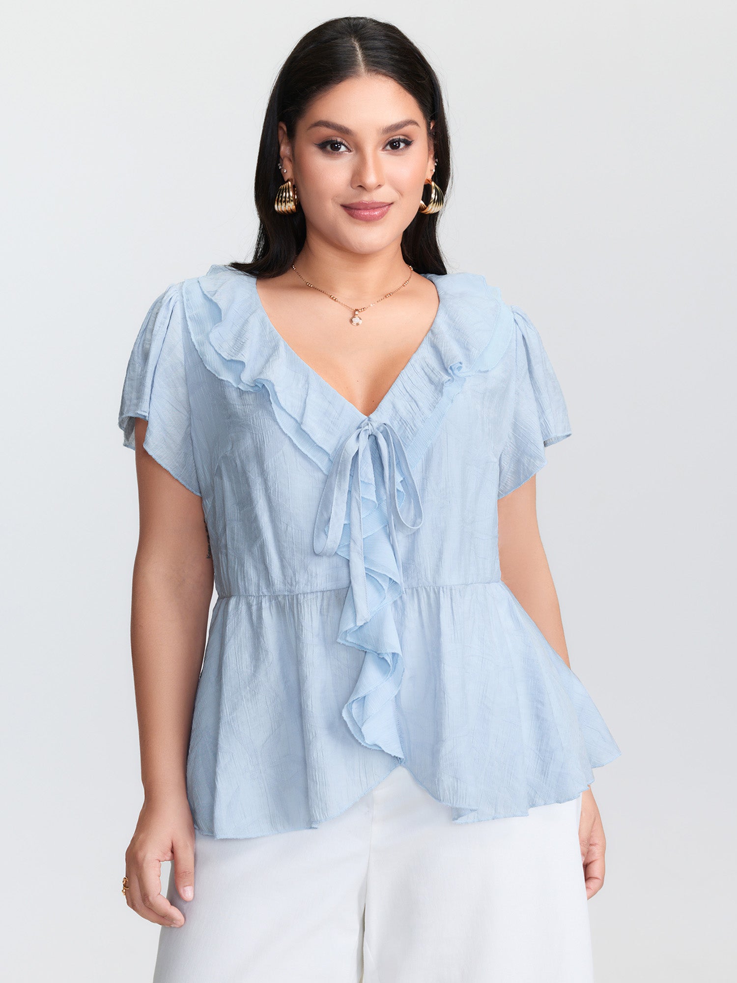 Ruffled Bow-Tie Neckline Textured Blouse