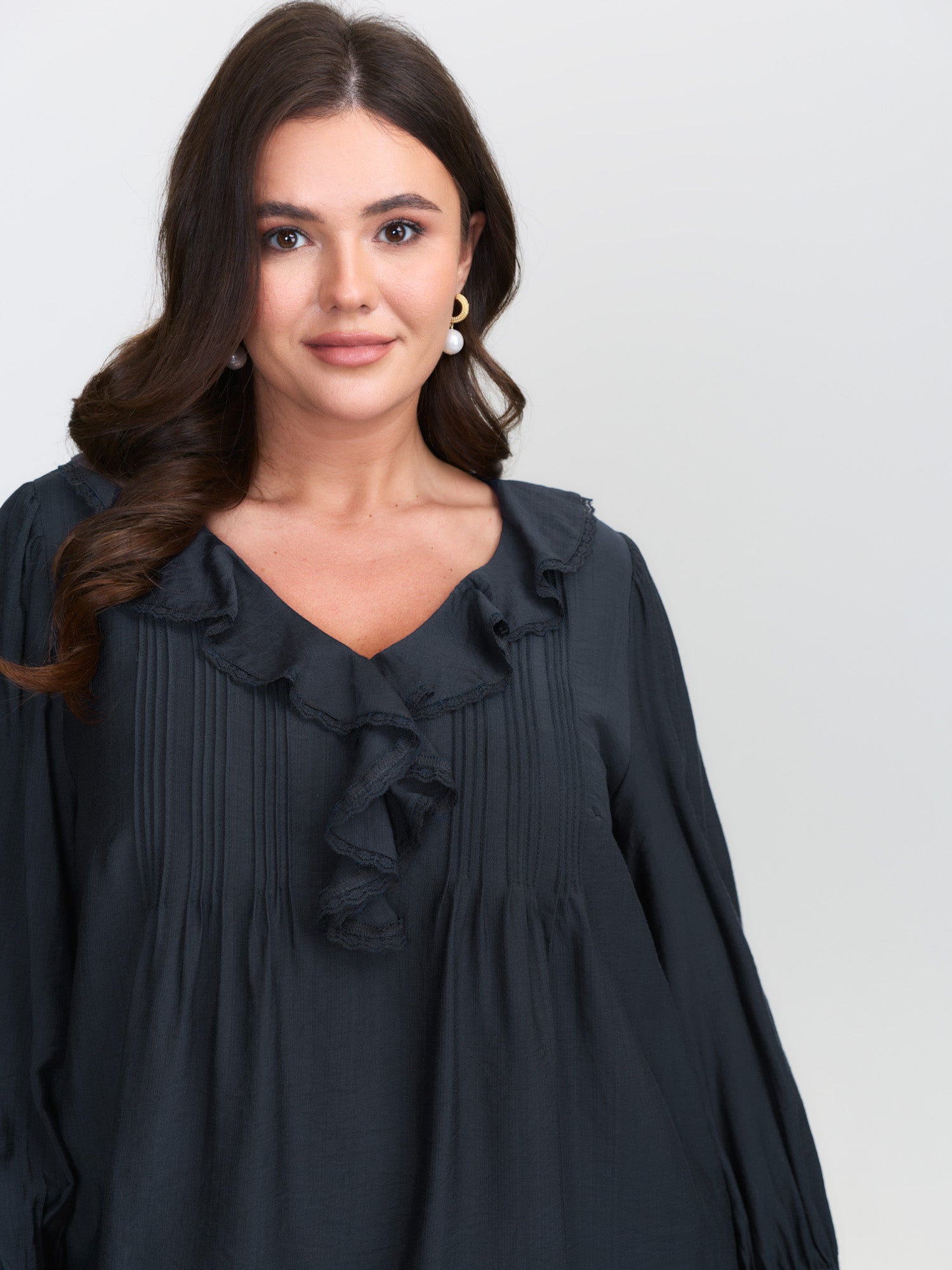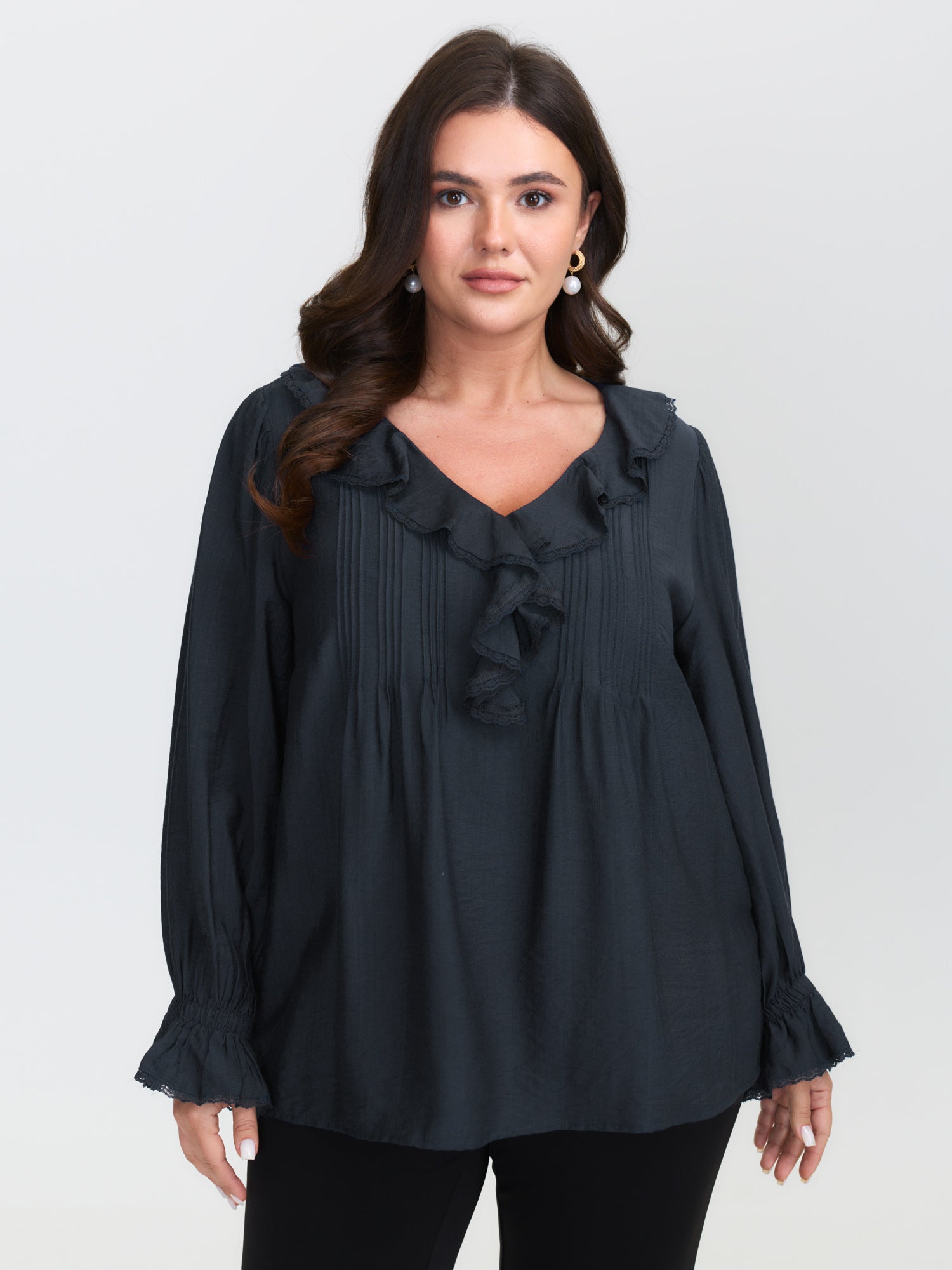 Ruffled Neckline Stretchy Cuffs Blouse