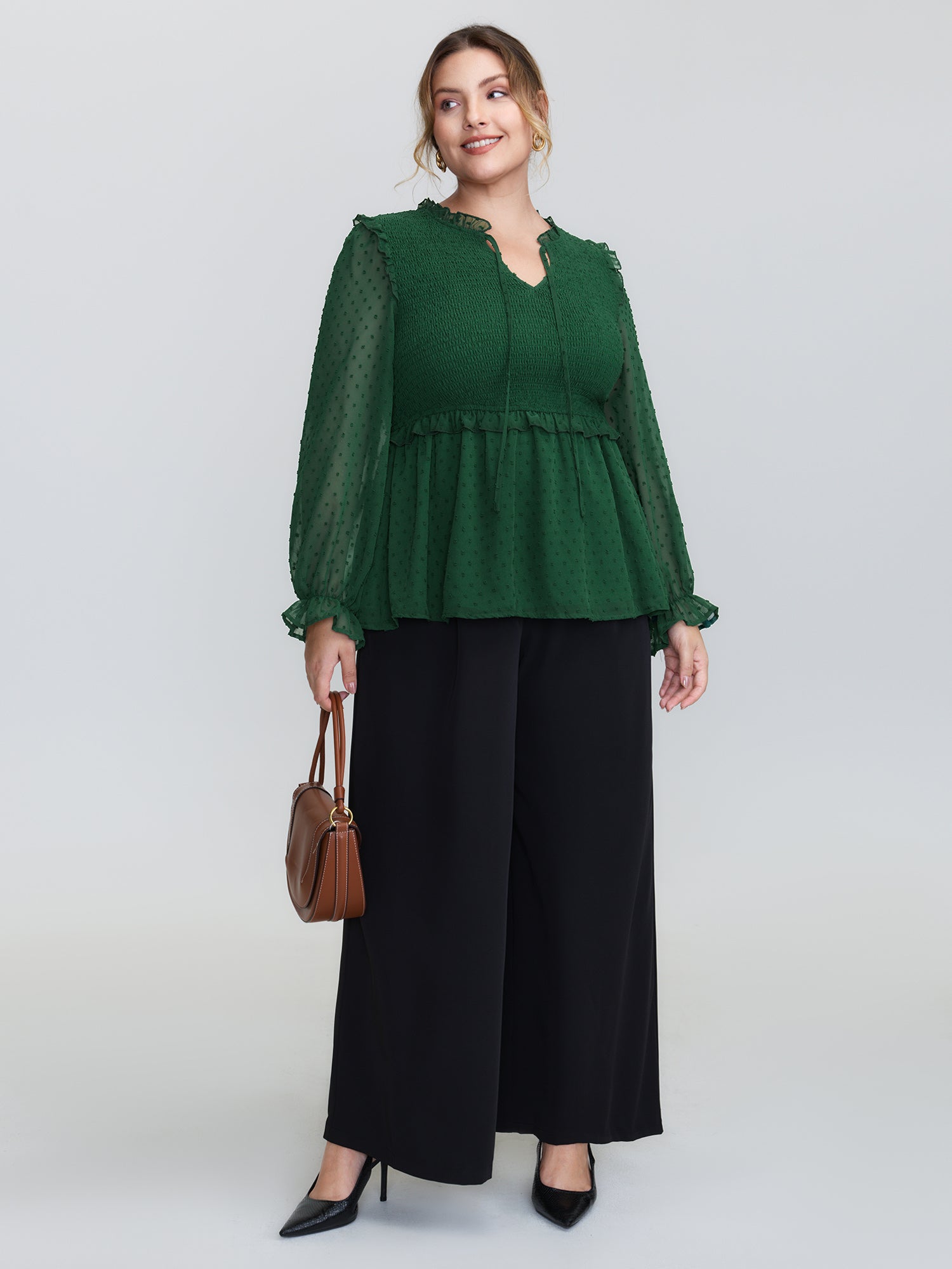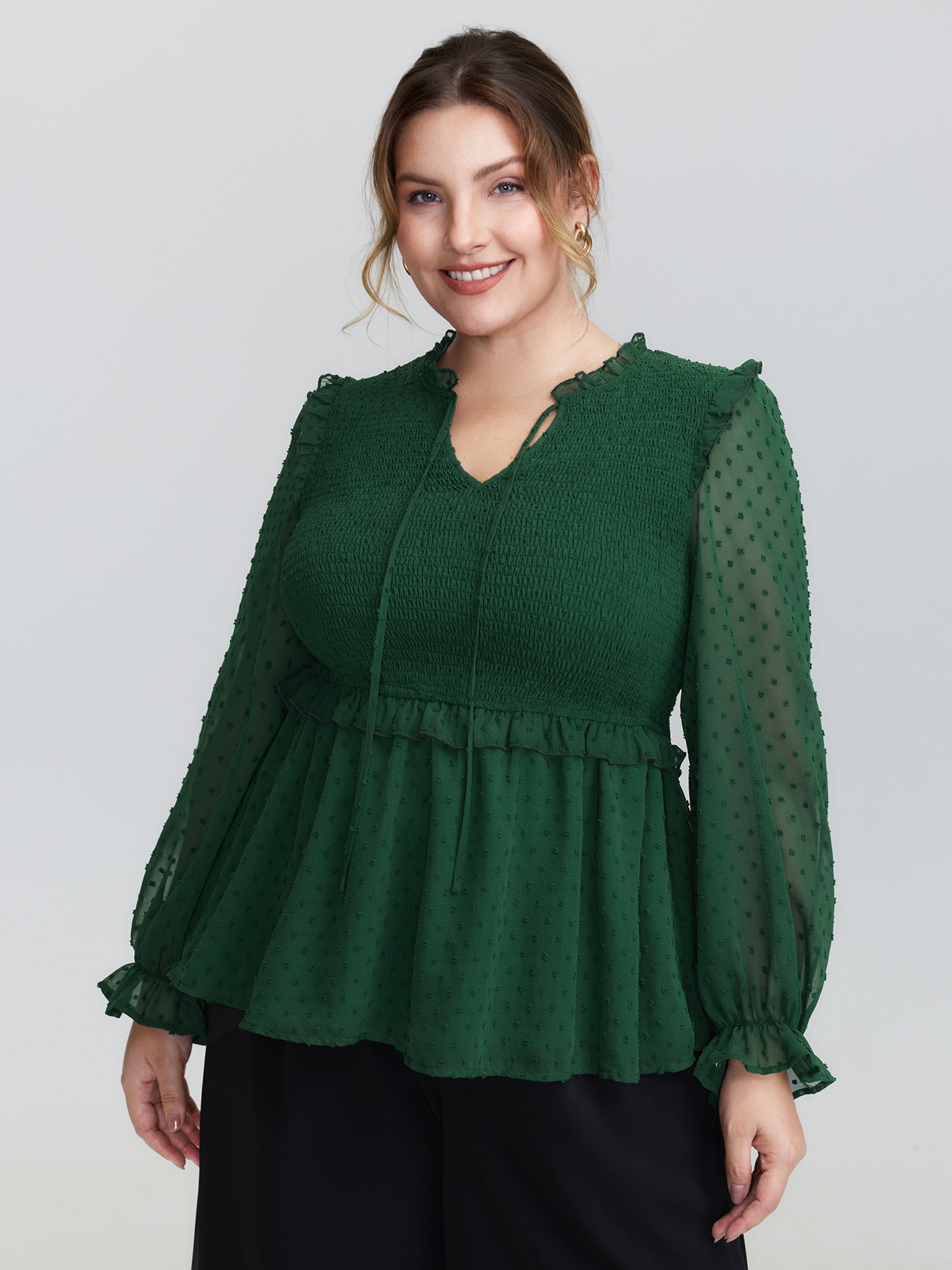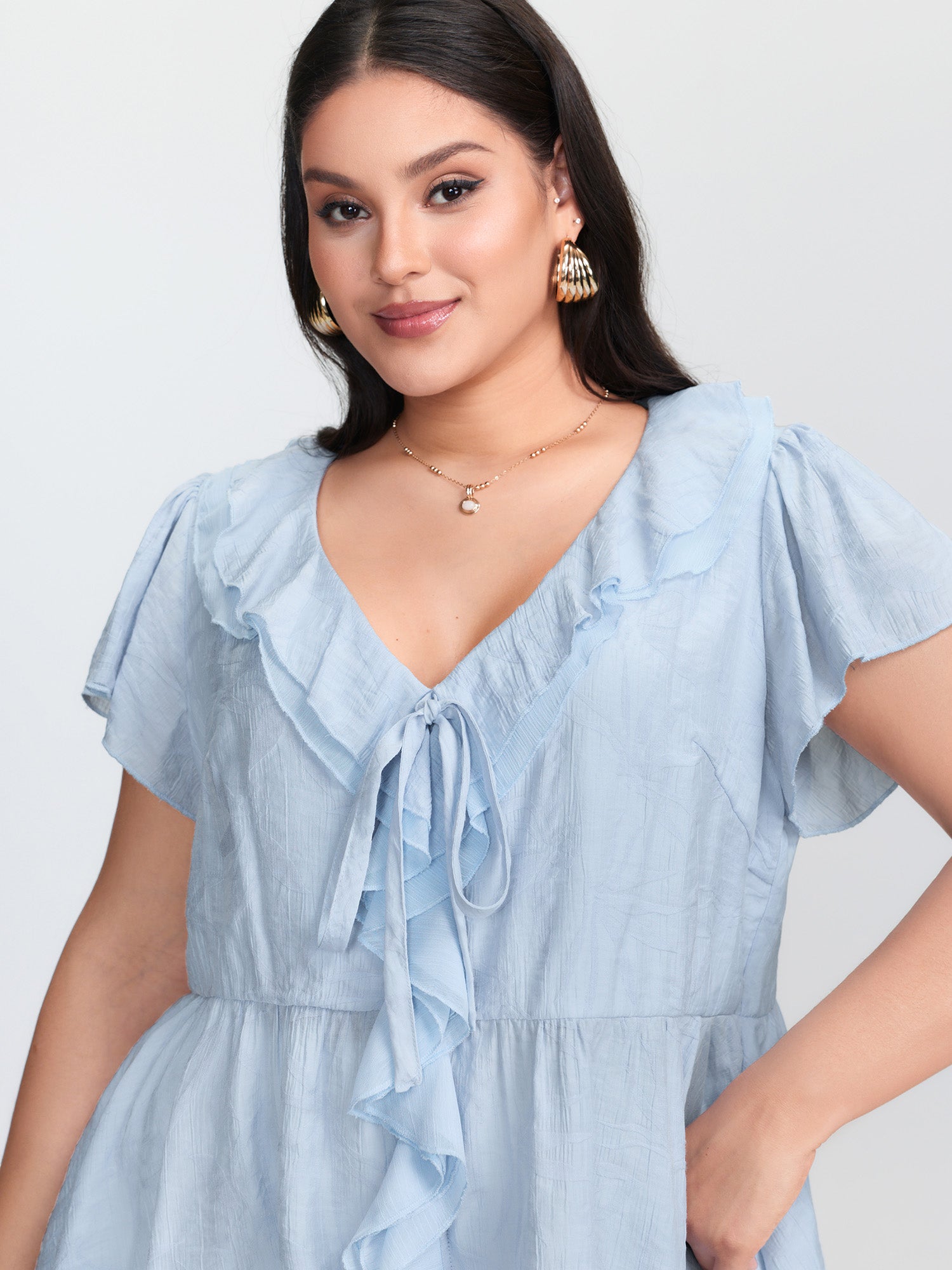 Lotus Leaf Neckline Textured Curvy Hem Blouse