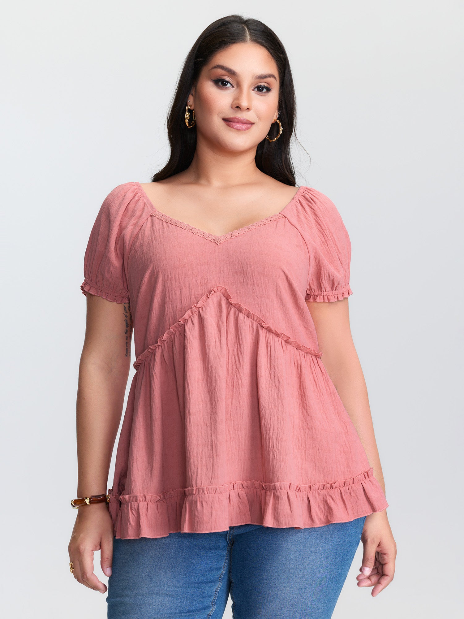 Lace Trim Ruffled Hem Plain Blouse