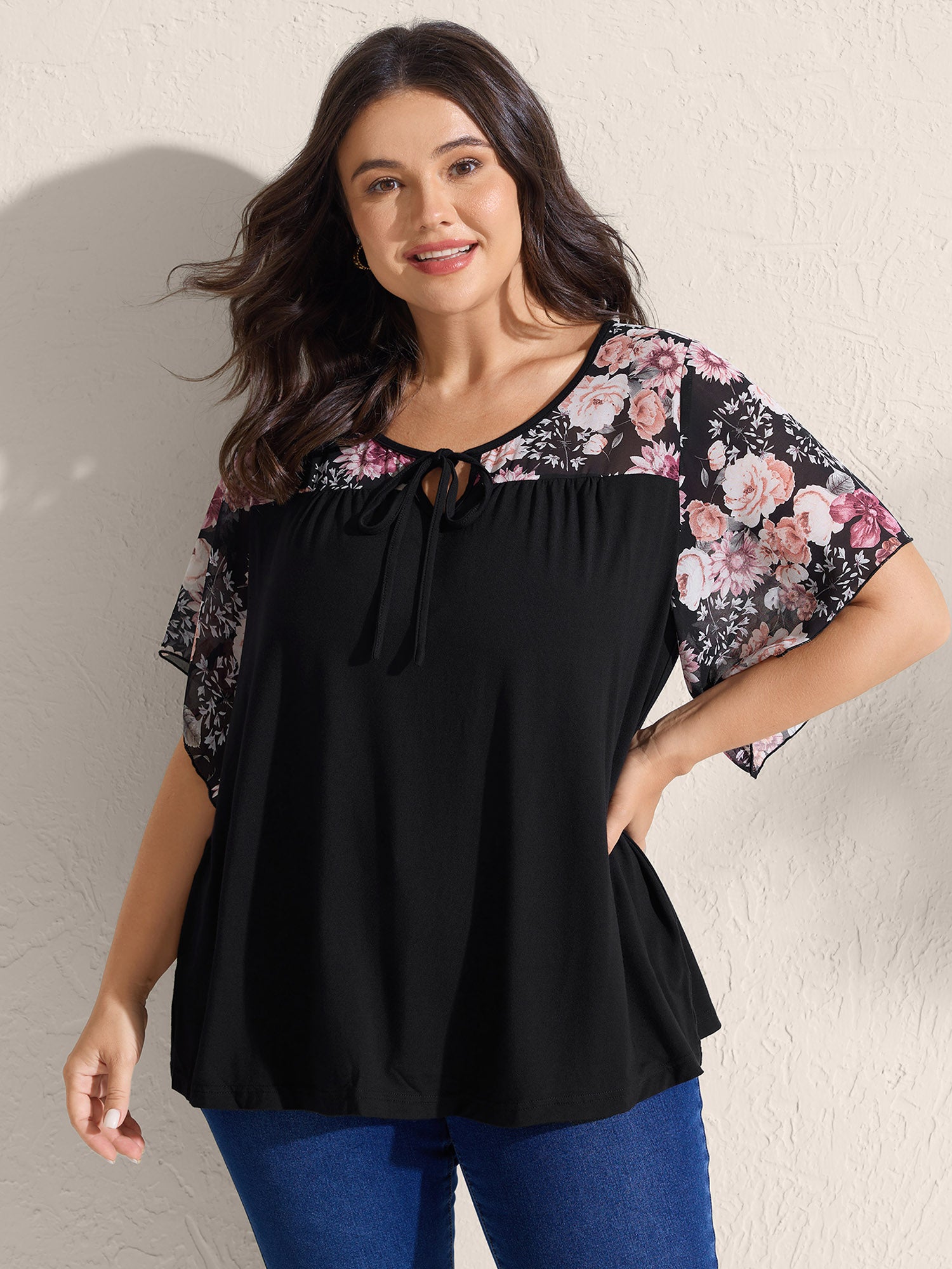 Supersoft Floral Ruffled Sleeve Neck Tie Knit Top