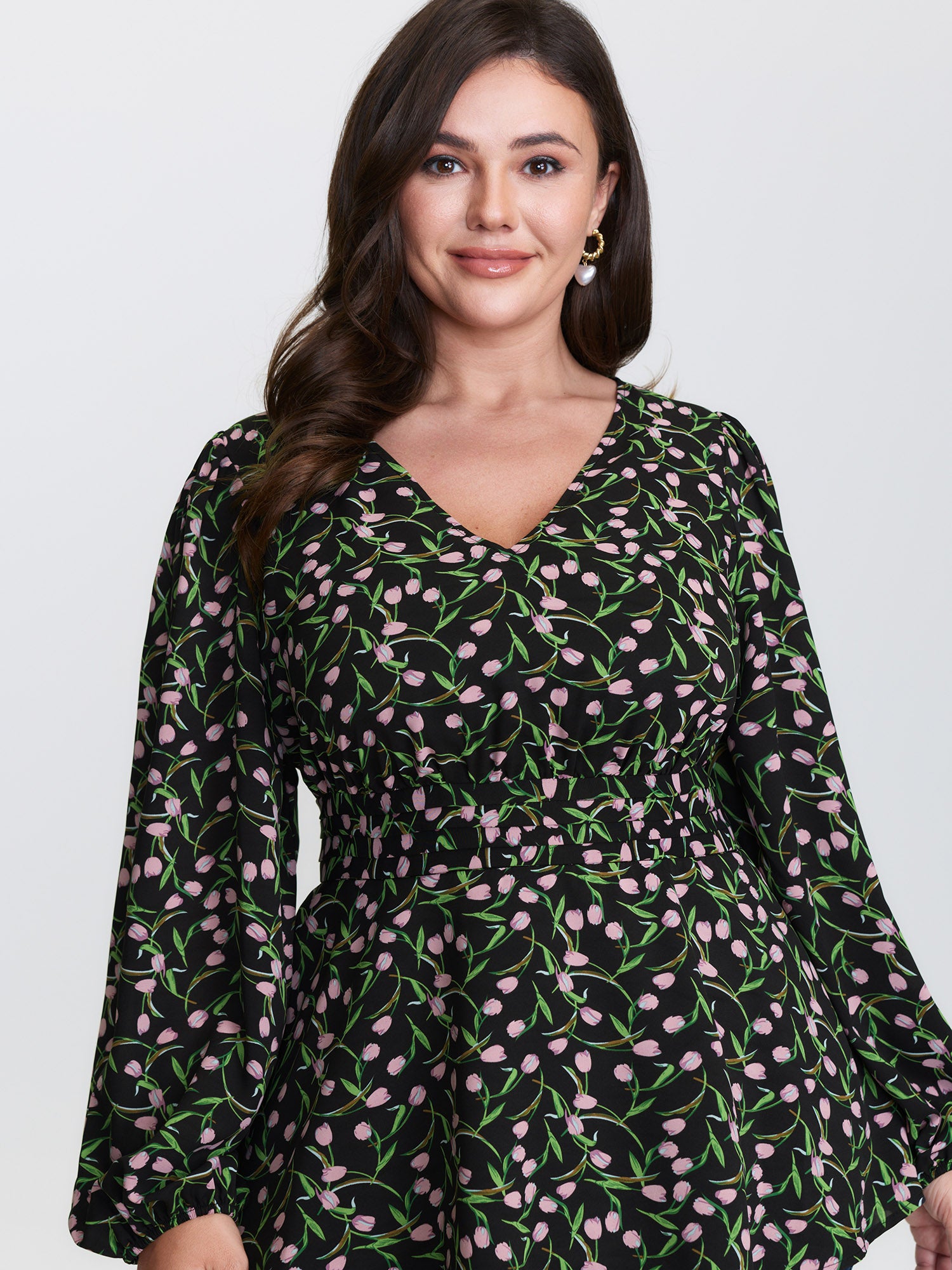 Tulip Print Cinched Flared Blouse