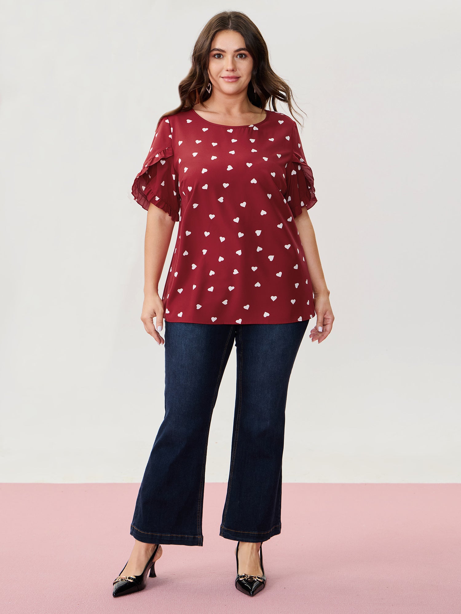 Ruffled Overlap Sleeve Heart Pattern Blouse