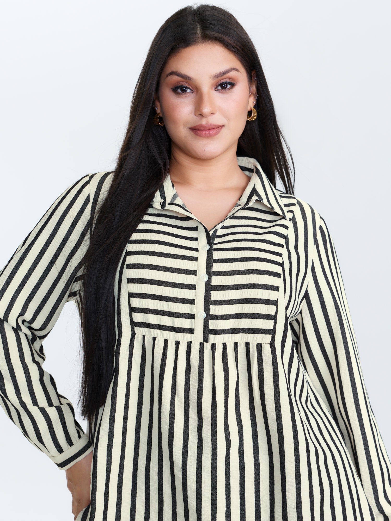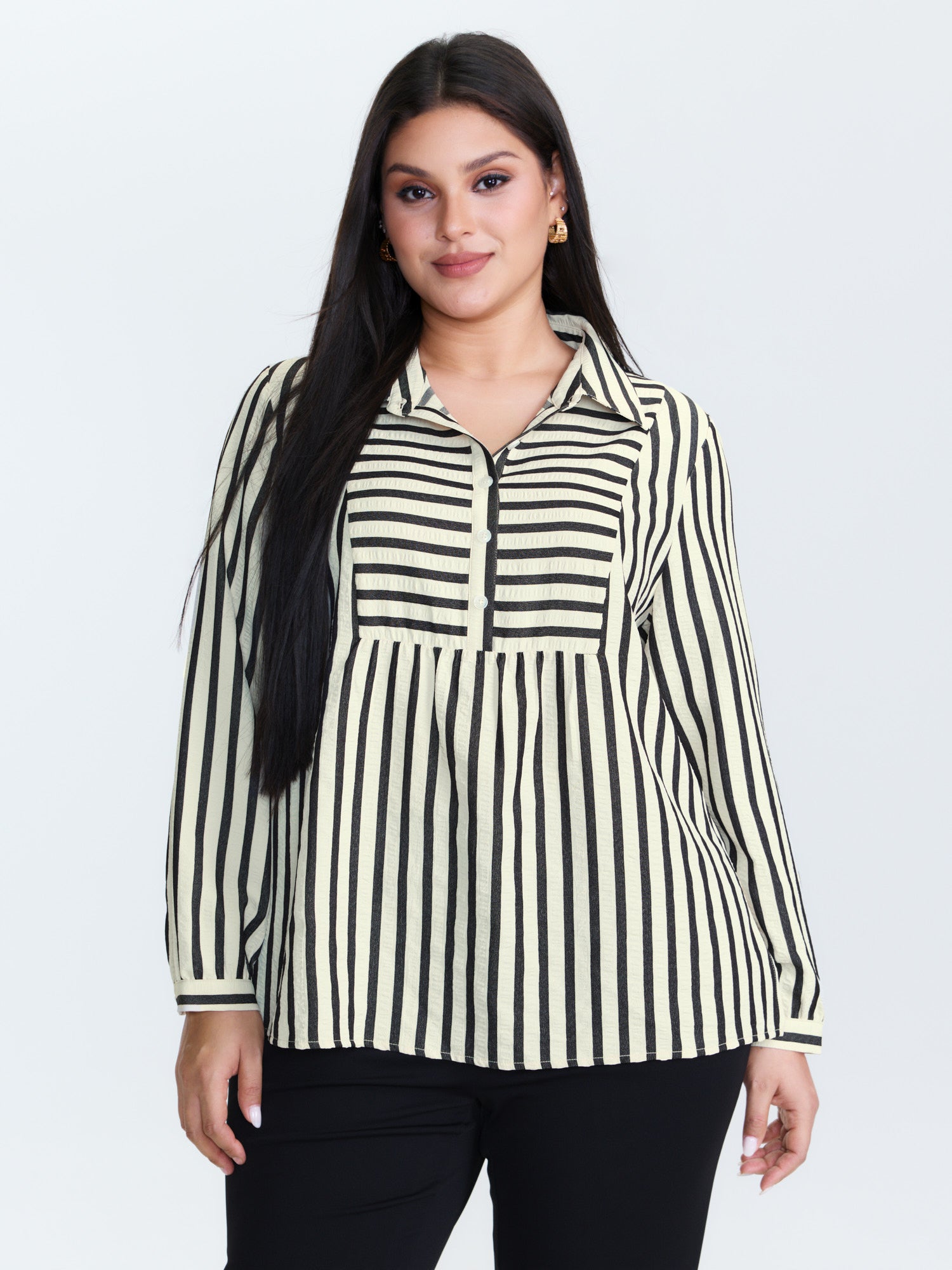 Striped Collar Textured Half-Placket Blouse