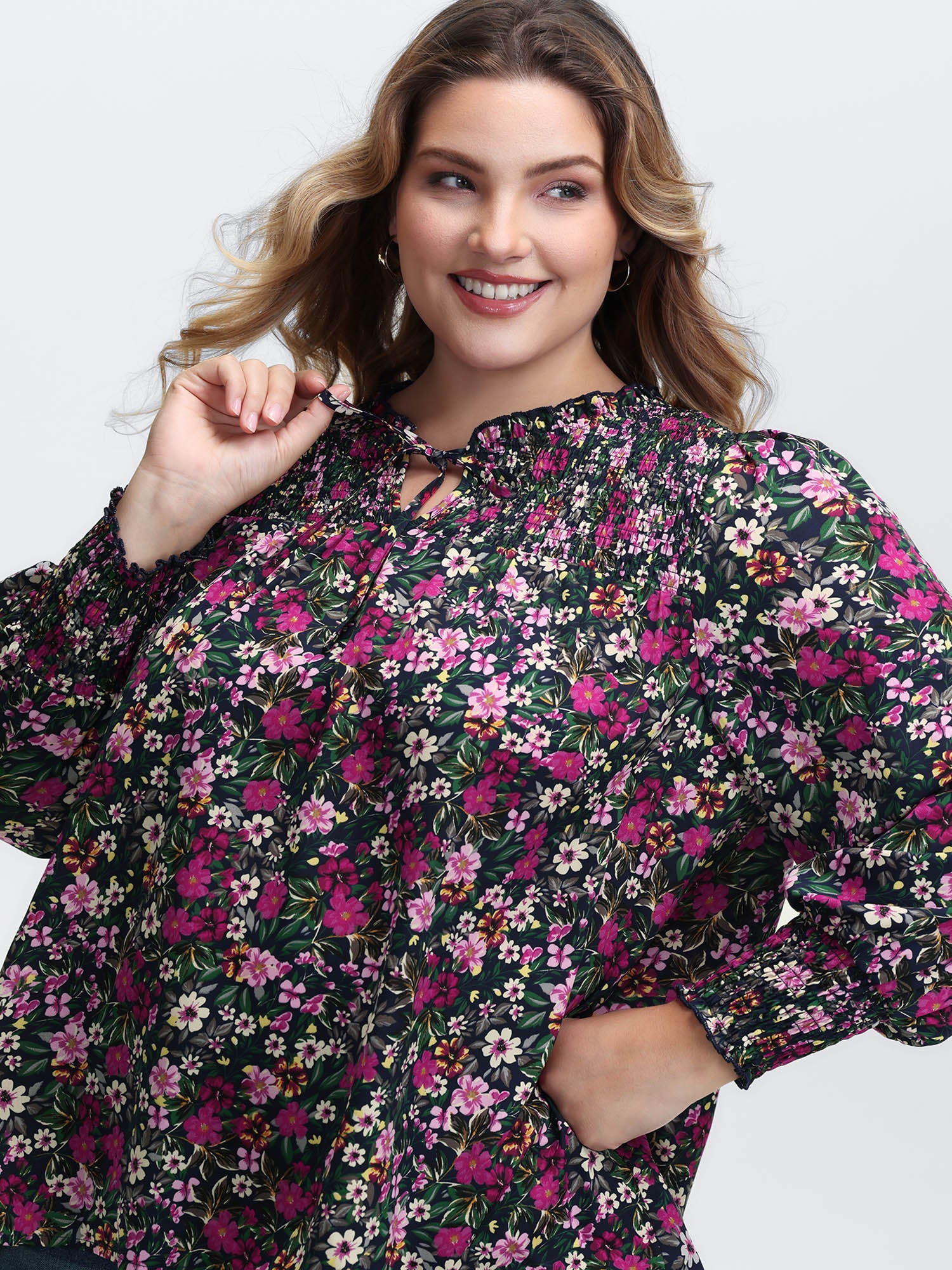 Ditsy Floral Shirred Neck Tie Blouse