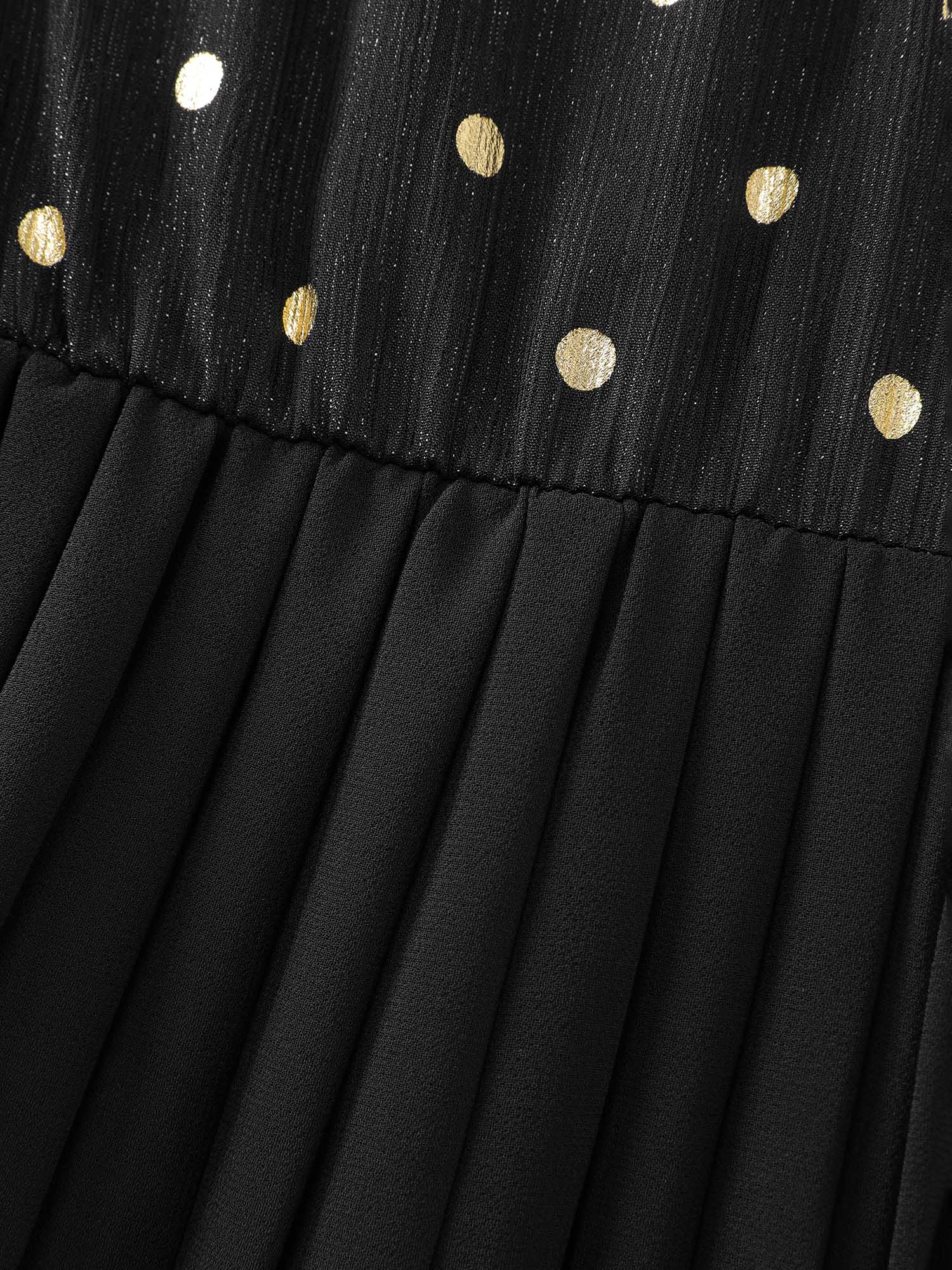 Shop Chiffon Gold Polka Dots Cinched-Waist Jumpsuit now and redefine your style with confidence at BloomChic. Tailored for mid and plus-size women. This trendy Jumpsuits Women, sizes 10-30. Color:Black;Style:Party&Cocktail;Neckline:V-neck;Sleeve Type:Elastic cuff;Prints:Polka dots;Pocket:Side seam pocket;Belt:Belt;Closure Type:Non