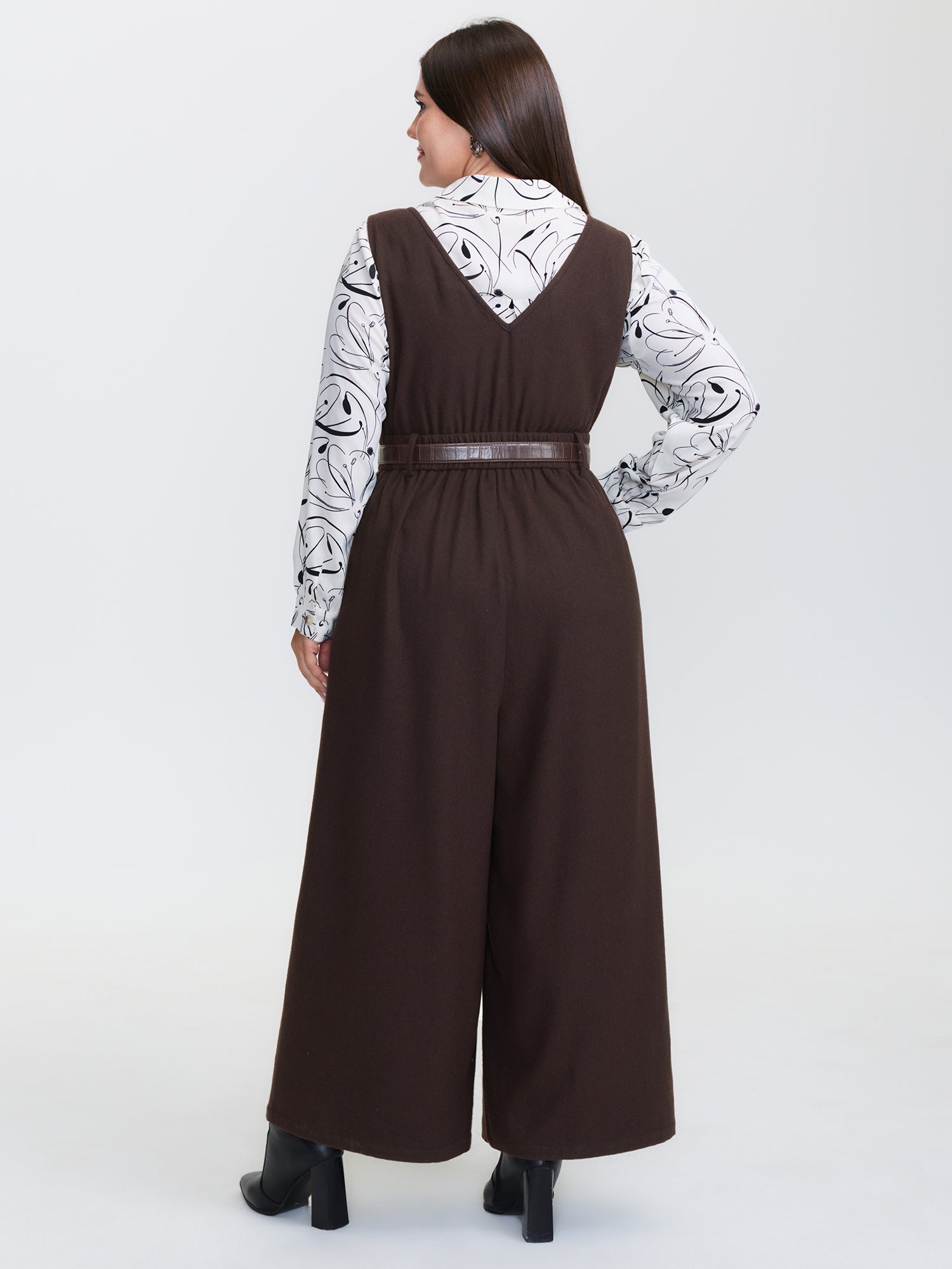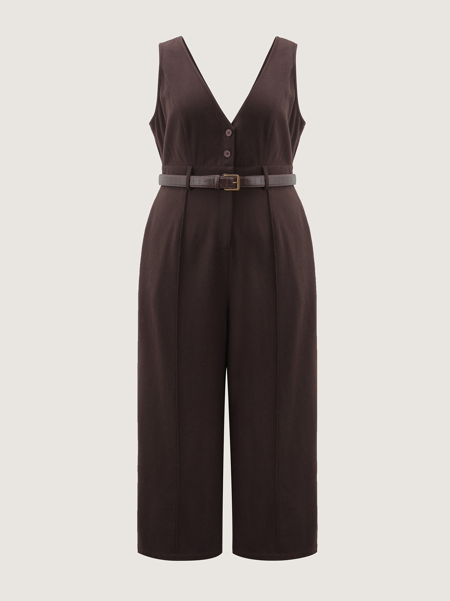 Shop Half Wool Blend Belted Overall Jumpsuit now and redefine your style with confidence at BloomChic. Tailored for mid and plus-size women. This trendy Jumpsuits Women, sizes 10-30. Color:DarkBrown;Style:Office;Neckline:V-neck;Sleeve Type:Sleeveless;Prints:Non;Pocket:Side seam pocket;Belt:Belt;Closure Type:Button