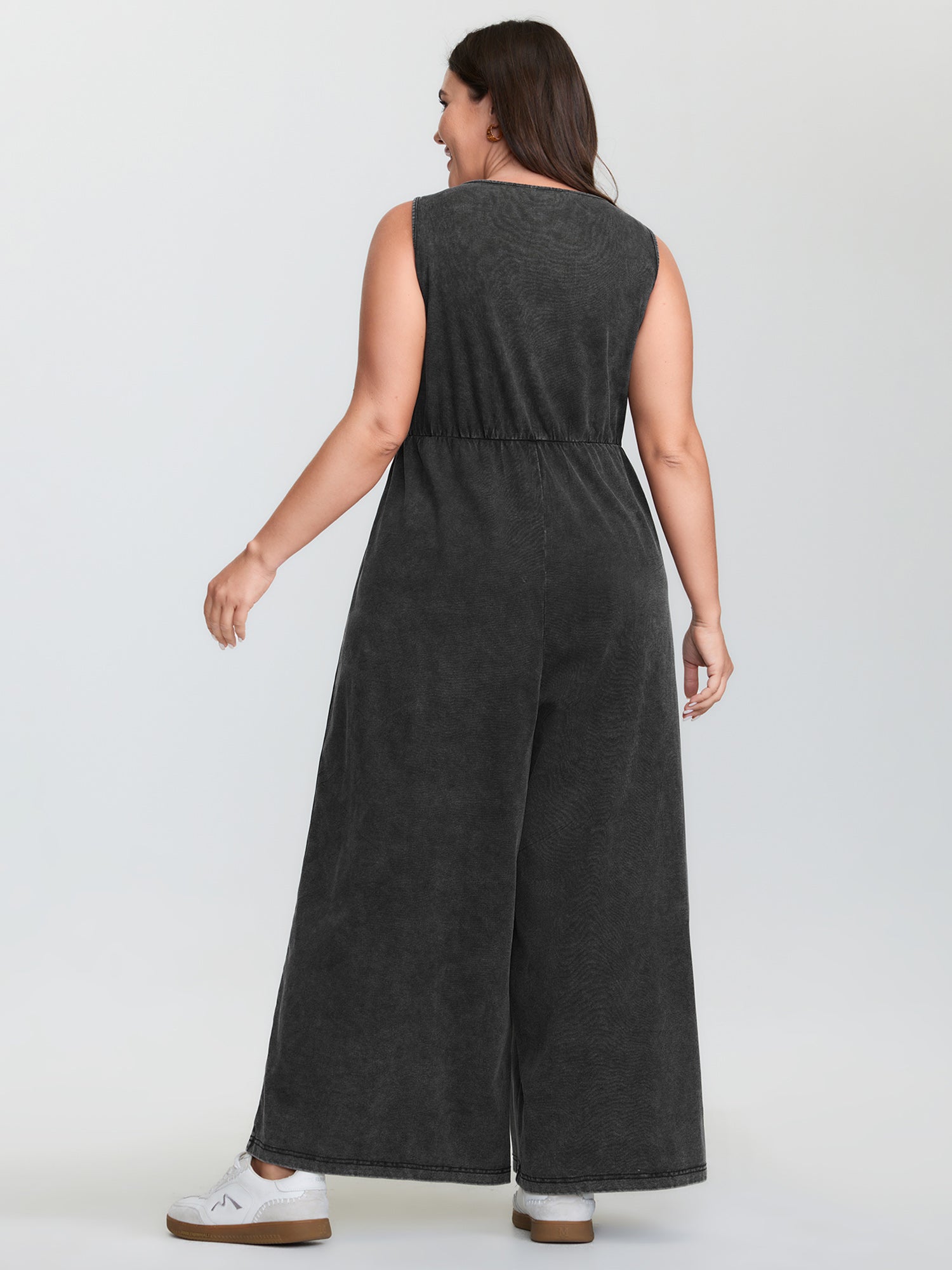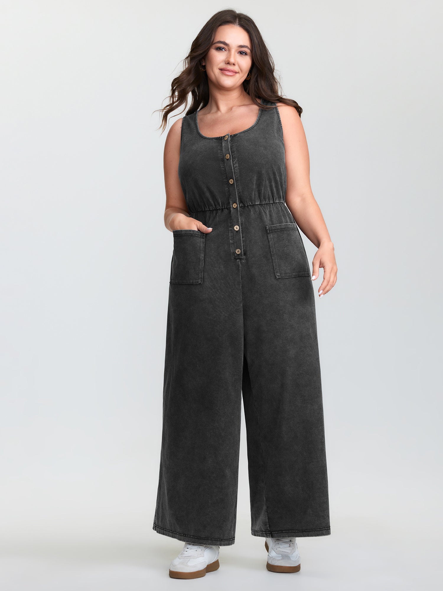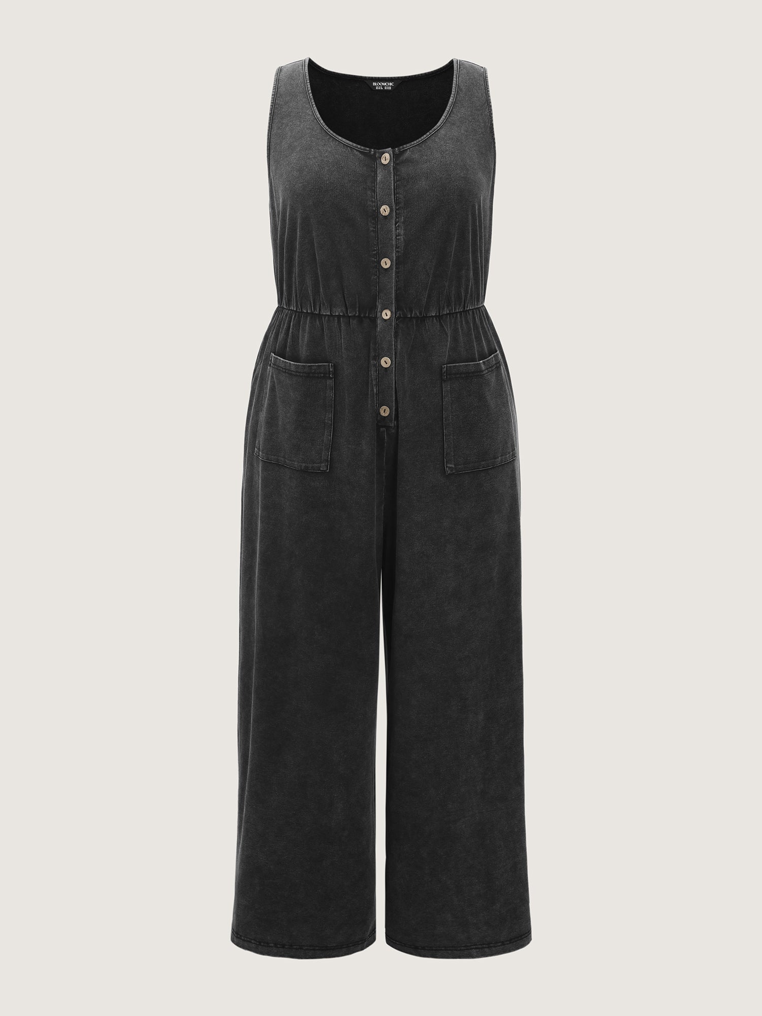 Shop Vintage Pockets Button-Front Jumpsuit now and redefine your style with confidence at BloomChic. Tailored for mid and plus-size women. This trendy Jumpsuits Women, sizes 10-30. Color:Acid Wash Black;Style:Leisure;Neckline:U-neck;Sleeve Type:Sleeveless;Prints:Non;Details:Button, Gathered, Texture;Pocket:Patch pocket;Belt:No-belt;Closure Type:Button