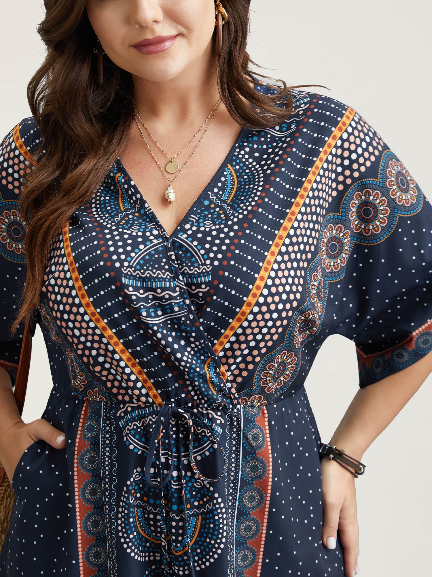 Boho Print V-Neck Pockets Midi Dress