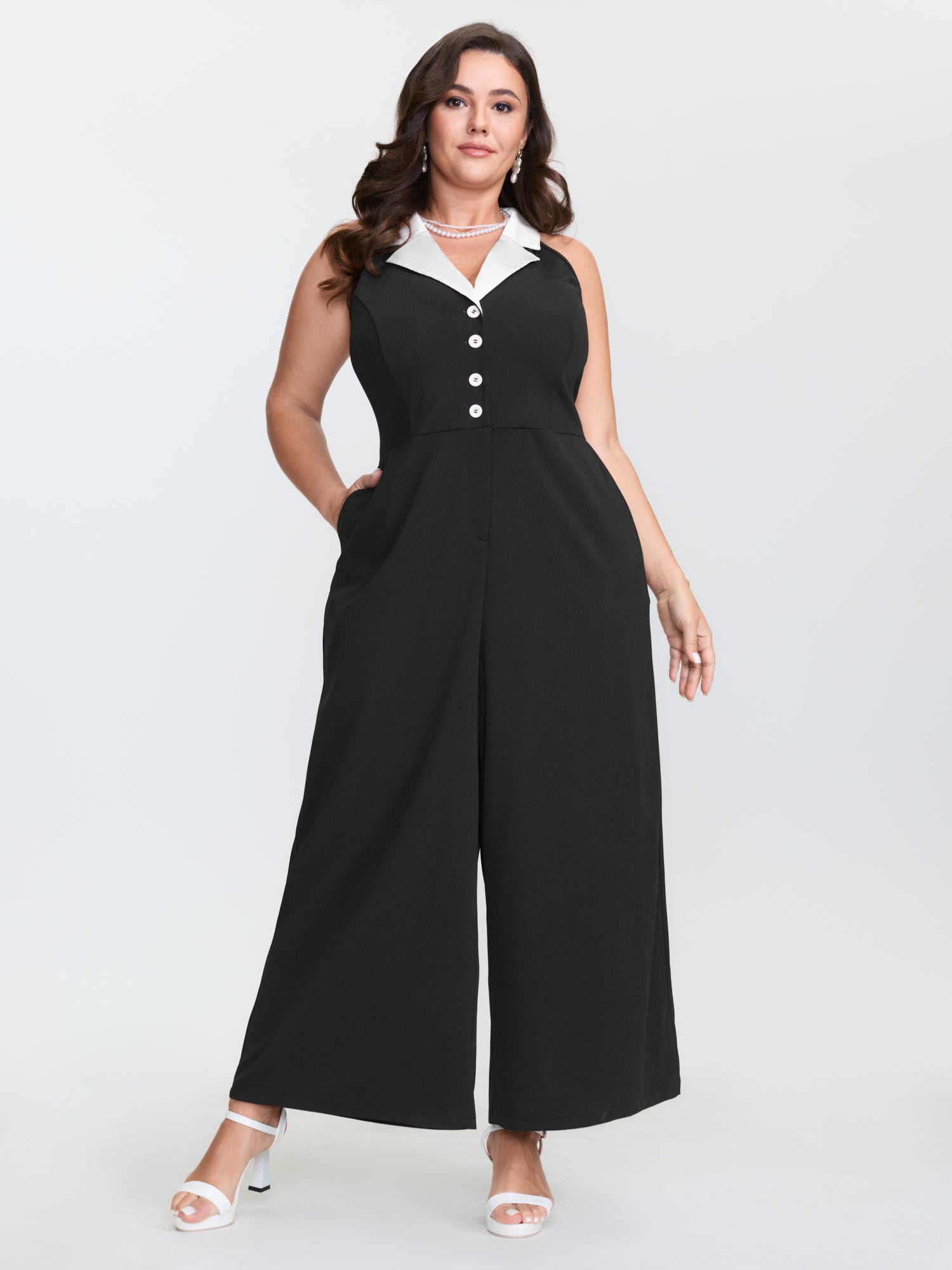 Color Contrast Lapel Collar Wide-Leg Jumpsuit