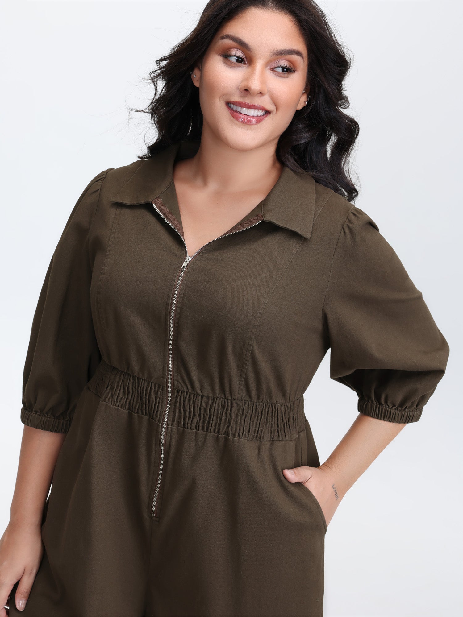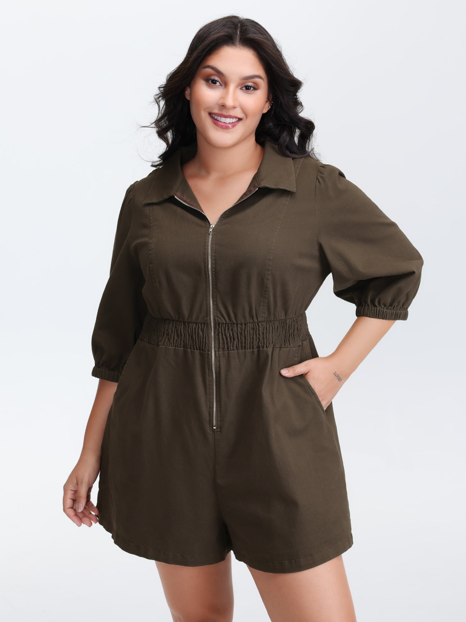 Lace Sleeve Stretchy Waist Pockets Romper