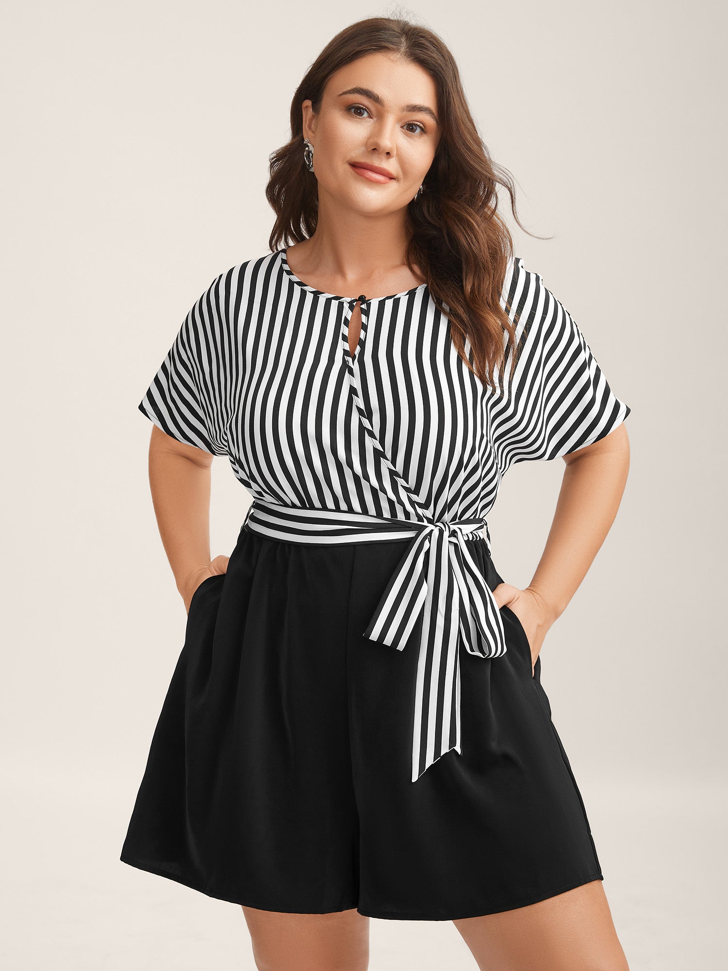 Stripe Print Belted Pockets Romper