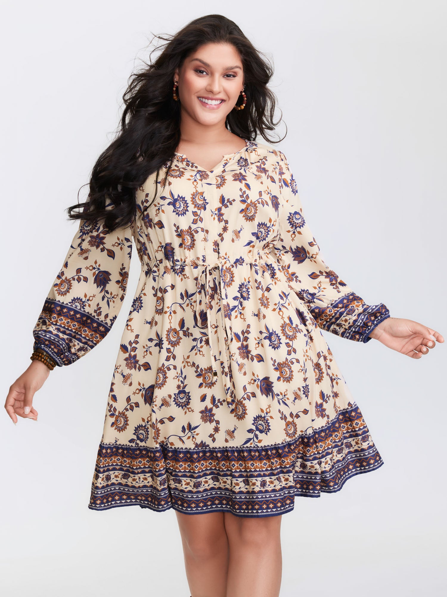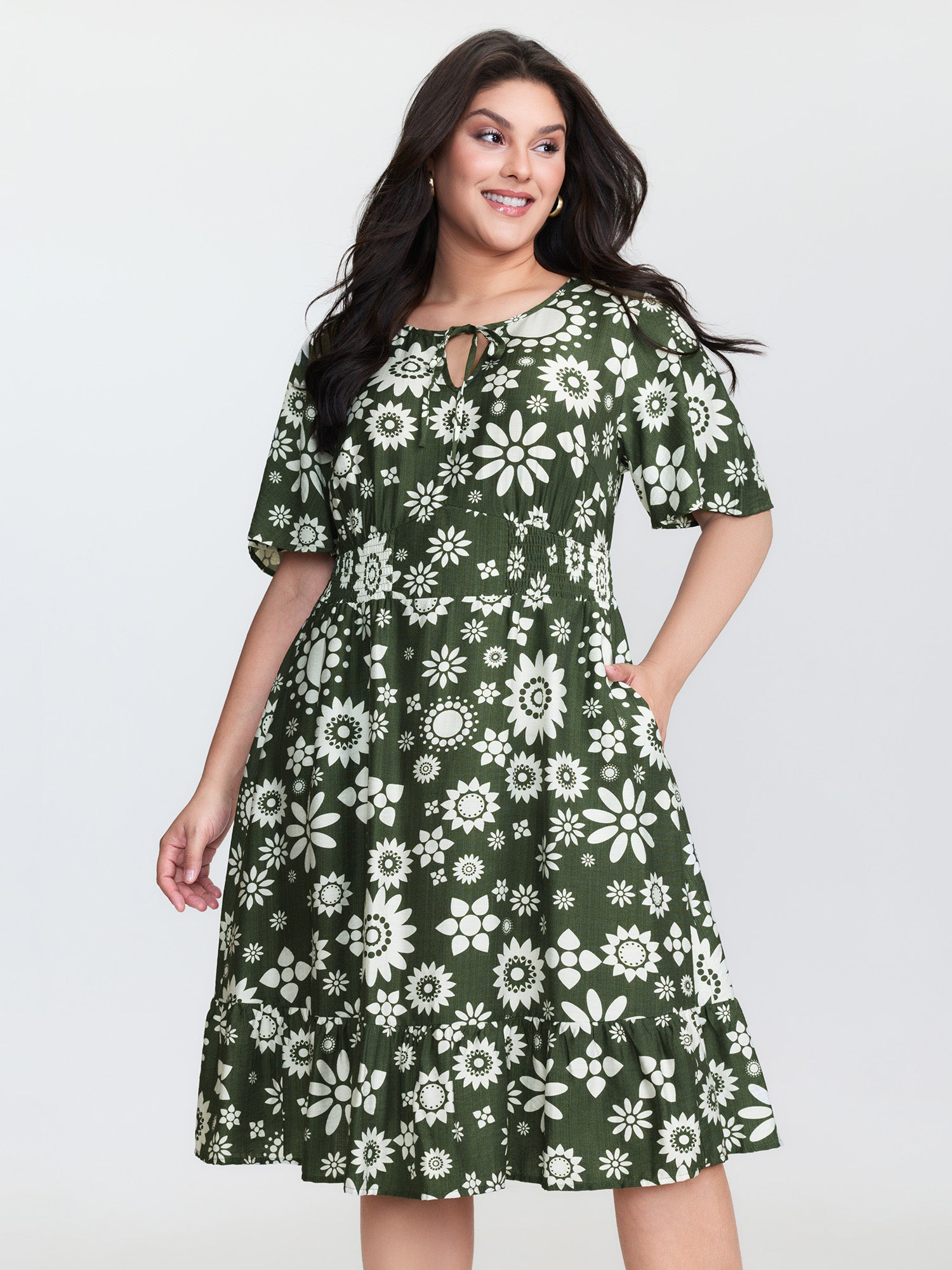 Floral Print Shirred Bodice Drawstring Midi Dress