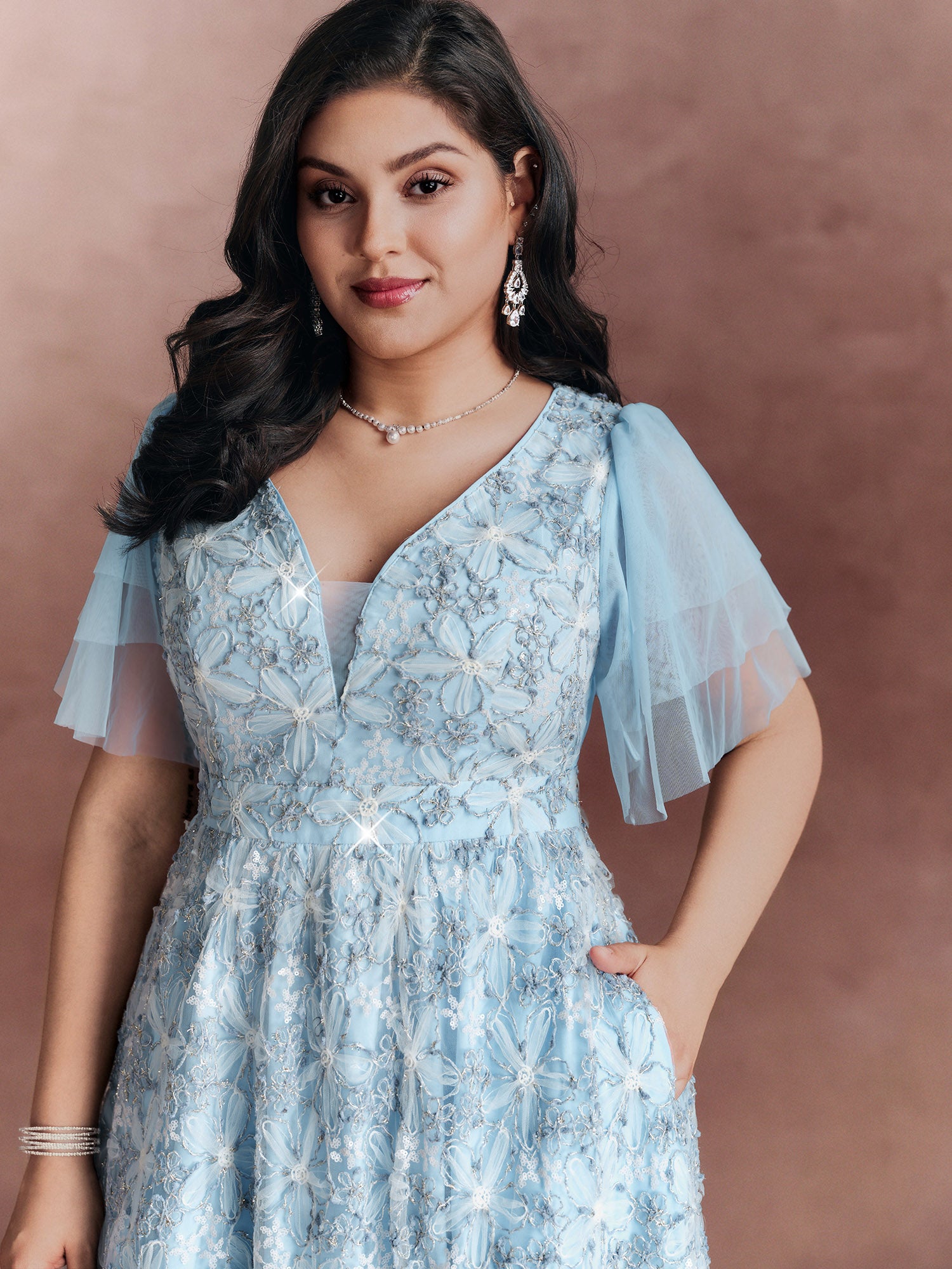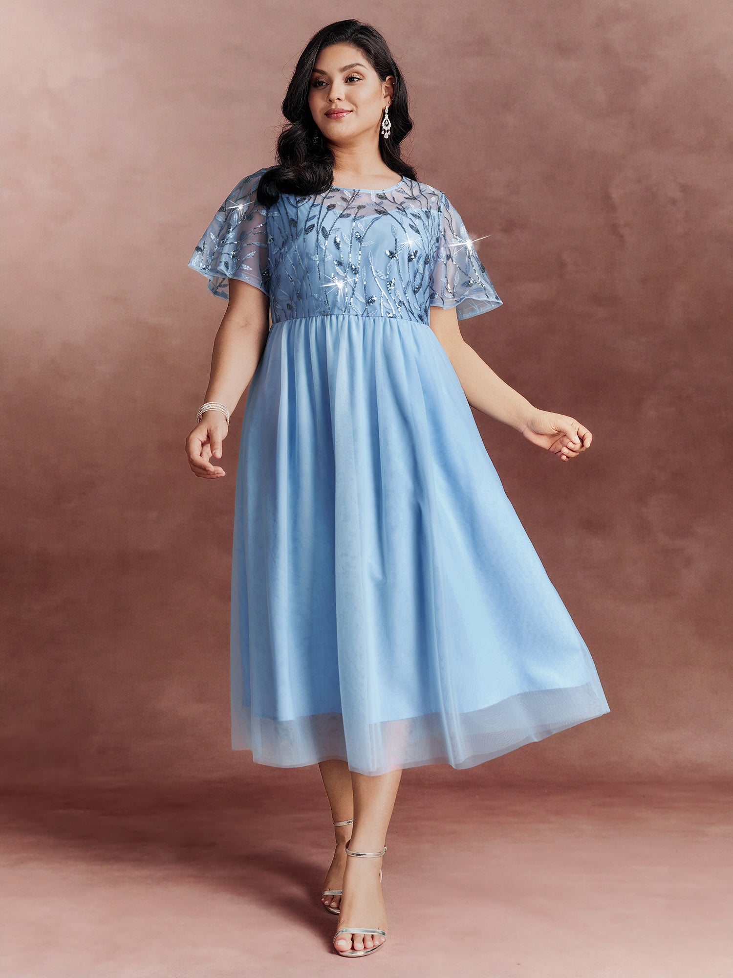 Floral Mesh Embroidered Lotus Leaf Sleeve Midi Dress