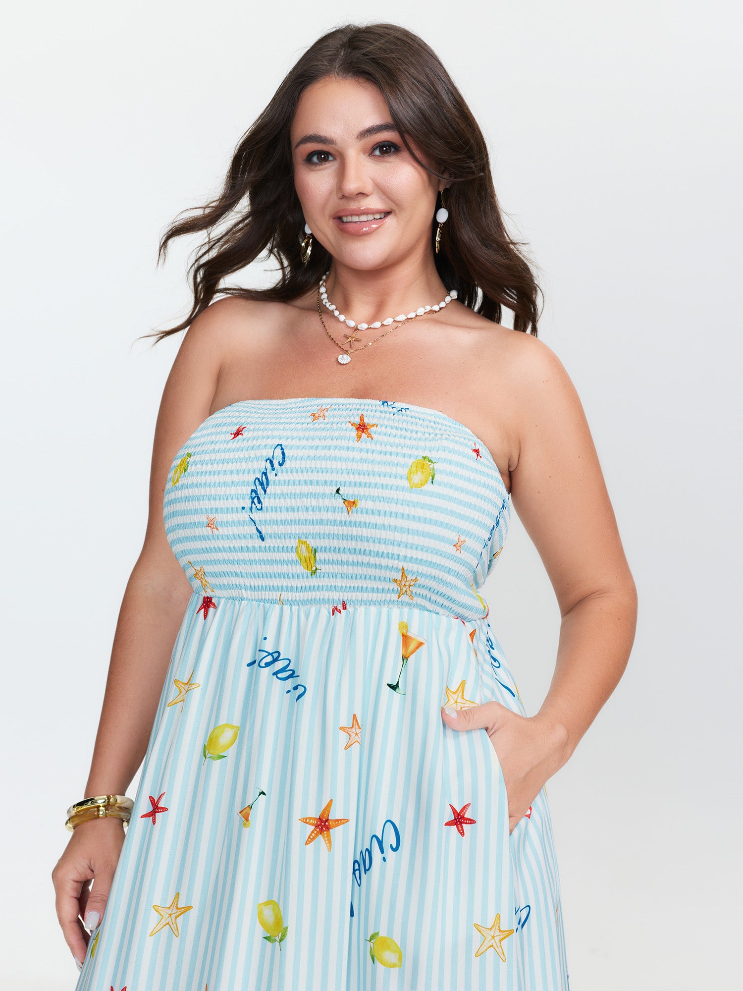 Cotton Textured Shirred Bodice Pleated Midi Dress