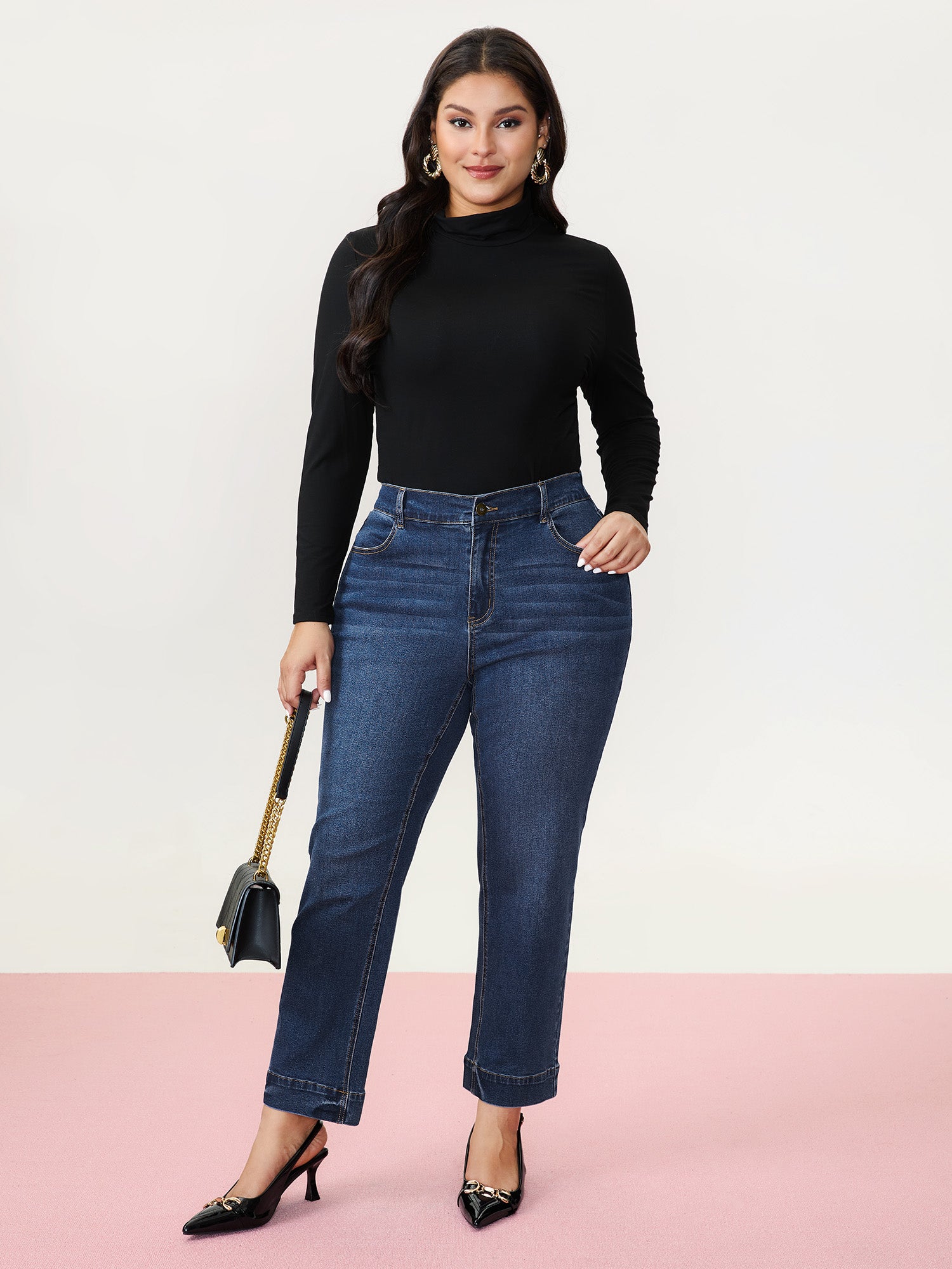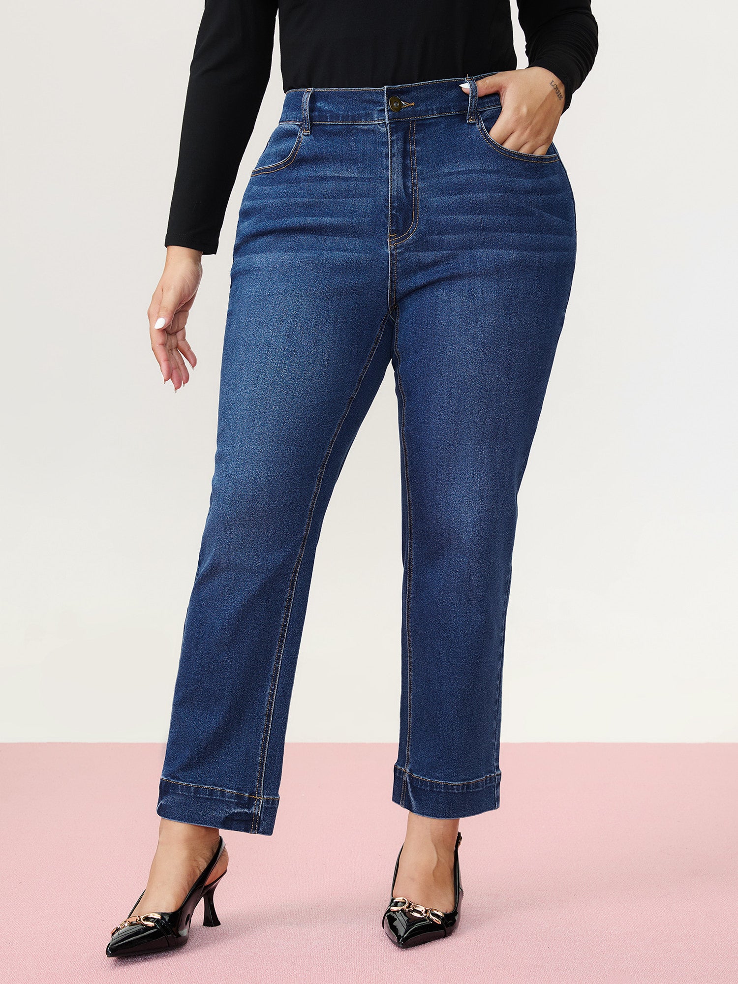 Stretch Rolled Hem Straight-Leg Jeans