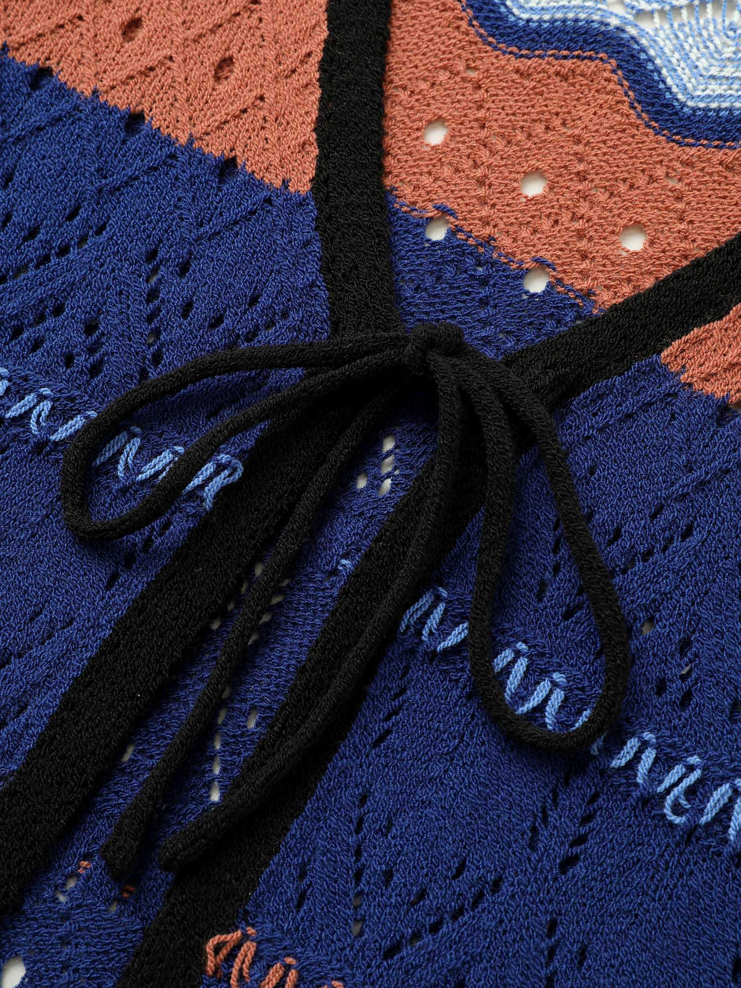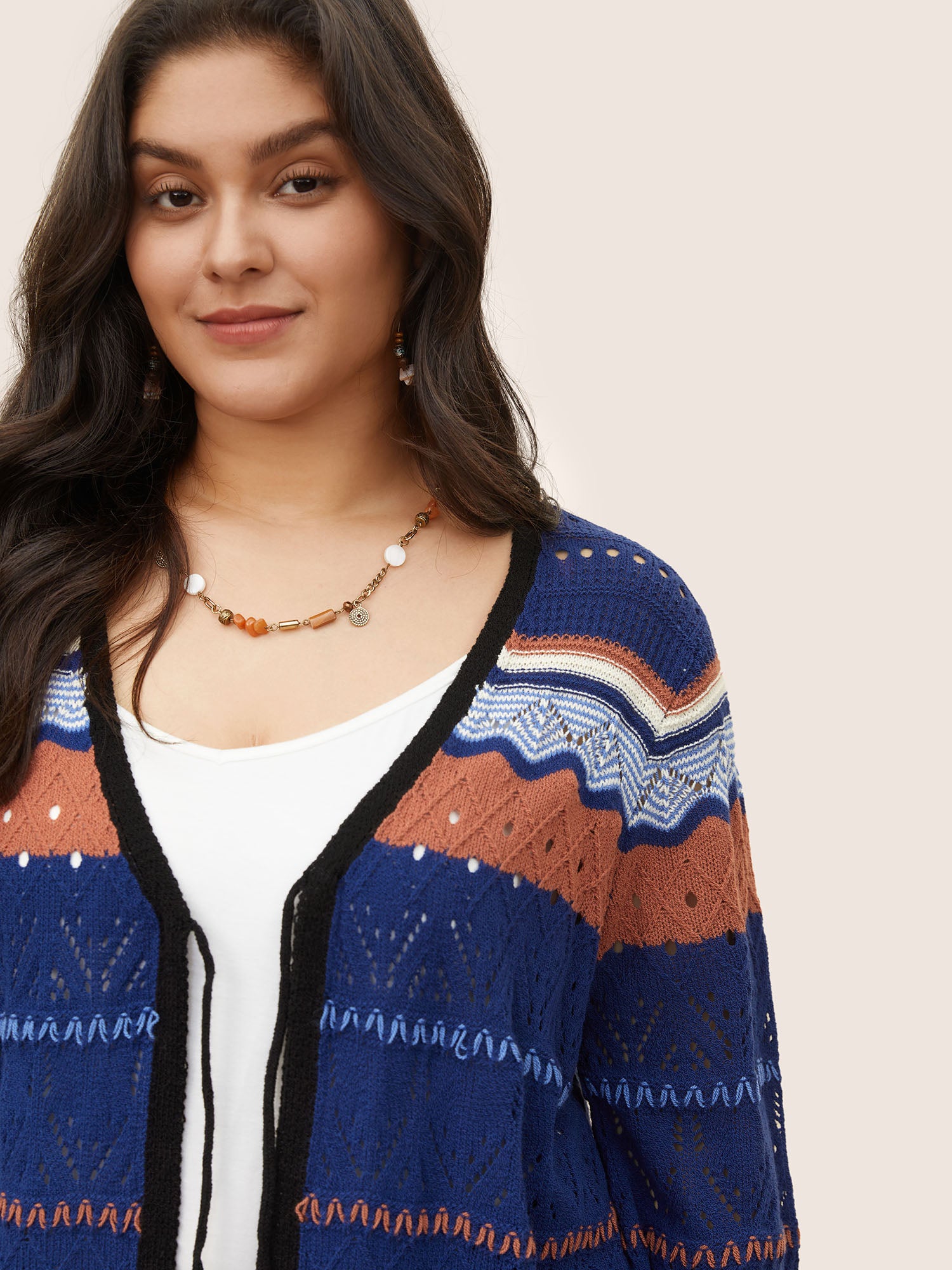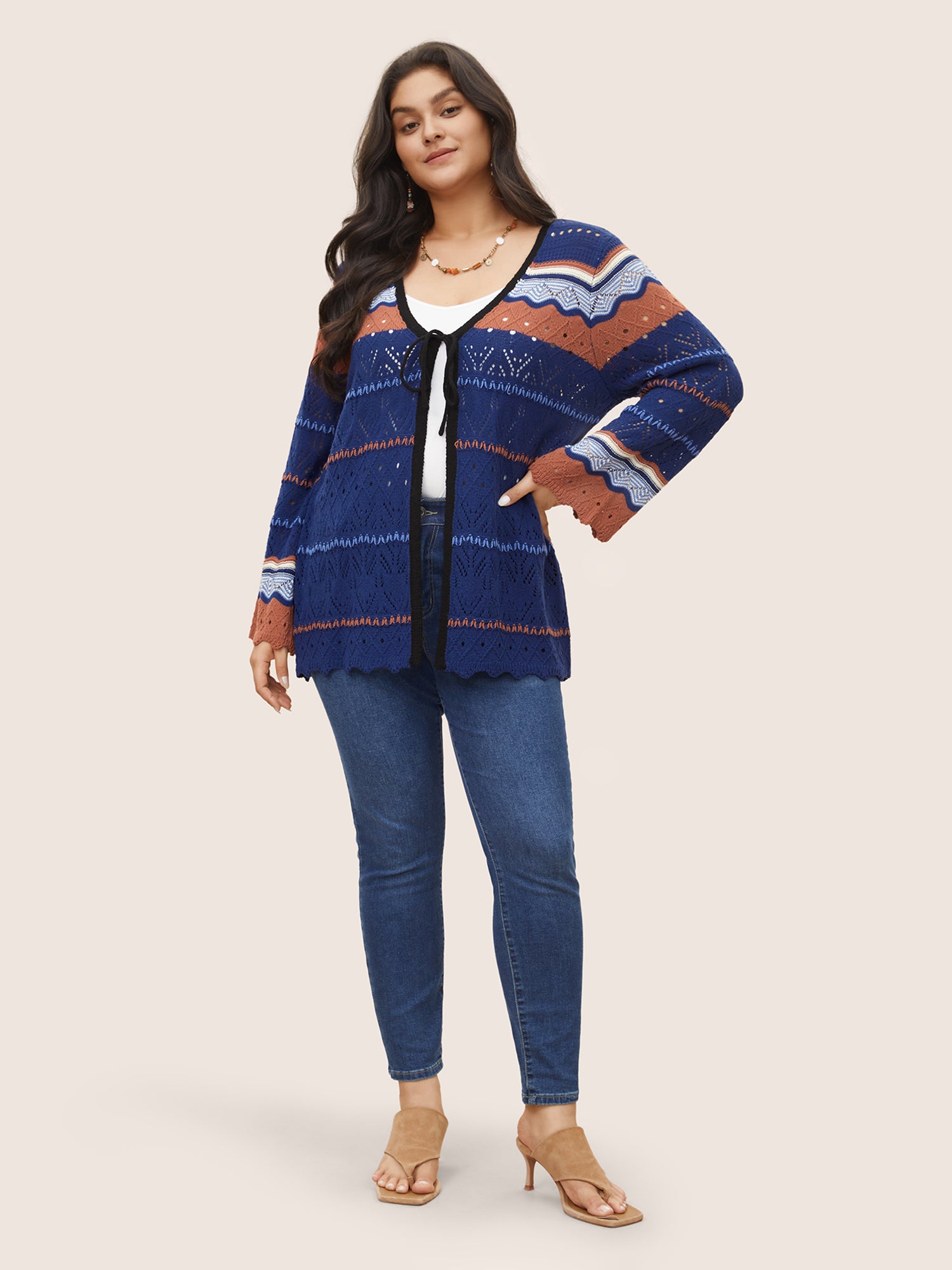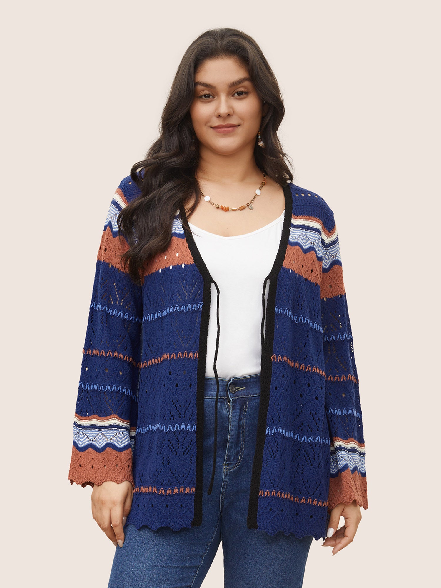 Shop Contrast Texture Hollow Out Ties Cardigan now and redefine your style with confidence at BloomChic. Tailored for mid and plus-size women. This trendy Outerwear Women, sizes 10-30. Color:Indigo;Neckline:Kimono collar;Sleeve Type:Bell Sleeve;Pattern Type:Striped;Details:Cut-Out, Contrast, Texture, Cross straps;Pocket:No-pocket;Belt:No-belt
