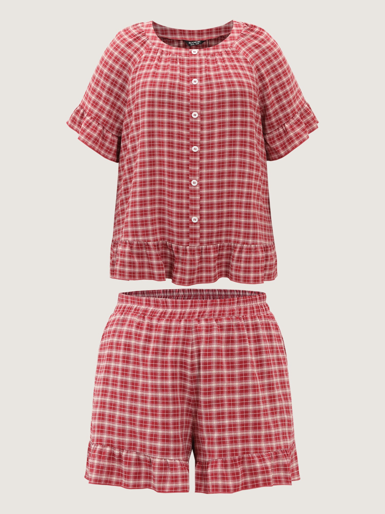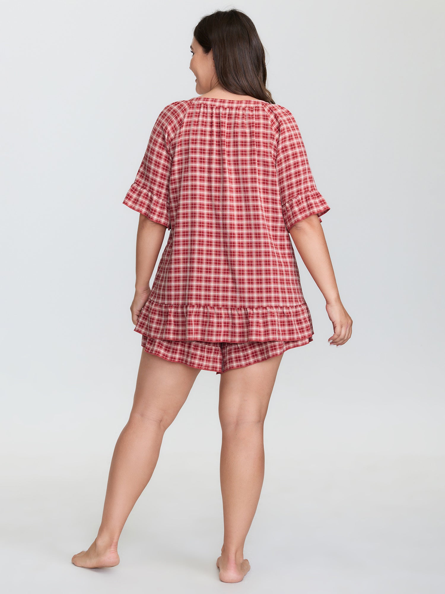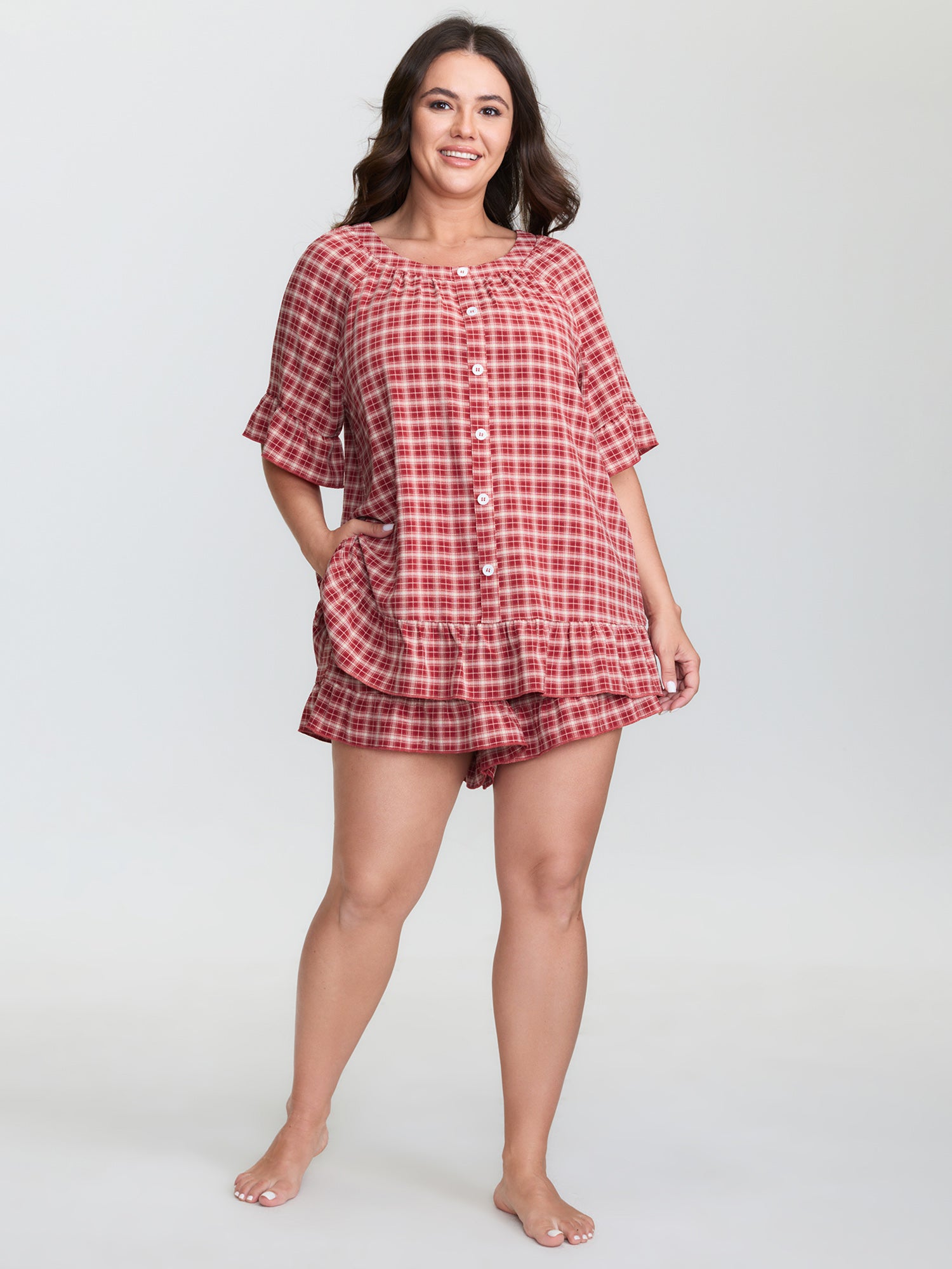 Shop Gingham Pattern Ruffled Hem Co-ord Lounge Set now and redefine your style with confidence at BloomChic. Tailored for mid and plus-size women. This trendy Loungewear Women, sizes 10-30. Color:Brightred;Style:Leisure;Neckline:Round Neck;Sleeve Type:Ruffle Sleeve;Prints:Plaid;Details:Button, Gathered;Pocket:Side seam pocket;Belt:No-belt;Closure Type:Non
