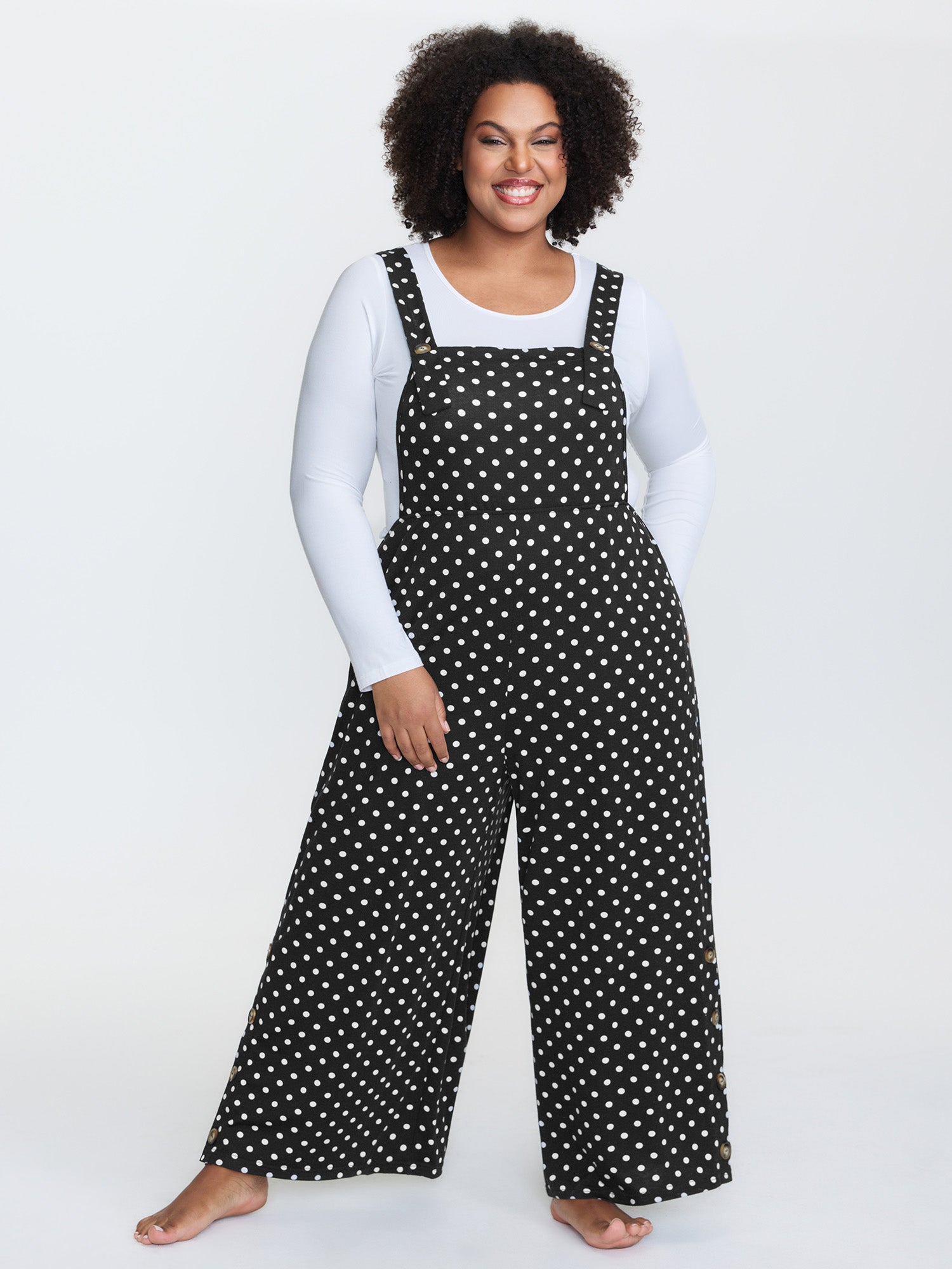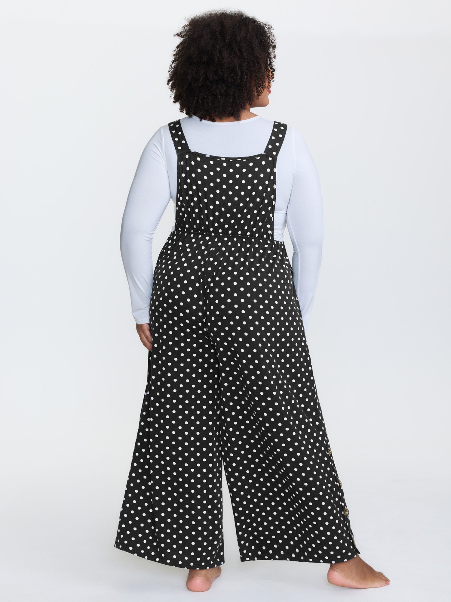 Shop Stretchy Polka Dots Lounge Jumpsuit now and redefine your style with confidence at BloomChic. Tailored for mid and plus-size women. This trendy Loungewear Women, sizes 10-30. Color:Black;Style:Leisure;Neckline:Non;Sleeve Type:Sleeveless;Prints:Polka dots;Details:Button, Contrast;Pocket:Side seam pocket;Belt:No-belt;Closure Type:Non