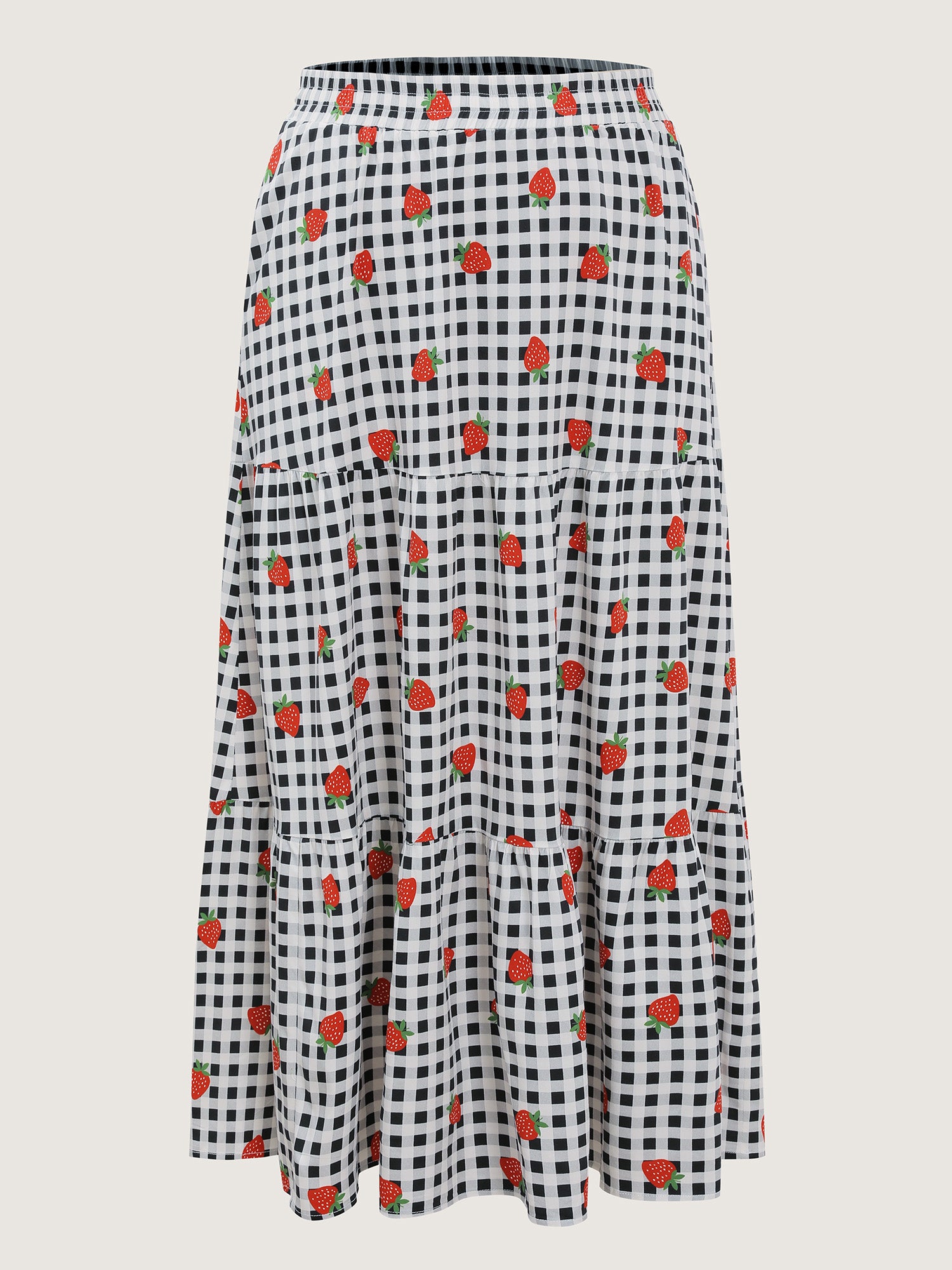 Shop Checkered Fruity Print Tiered Maxi Skirt now and redefine your style with confidence at BloomChic. Tailored for mid and plus-size women. This trendy Bottoms Women, sizes 10-30. Color:Black;Style:Playful;Pattern Type:Fruit;Prints:Fruit and vegetable print;Pocket:Side seam pocket;Belt:No-belt;Closure Type:Non