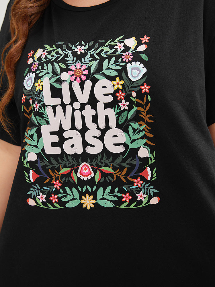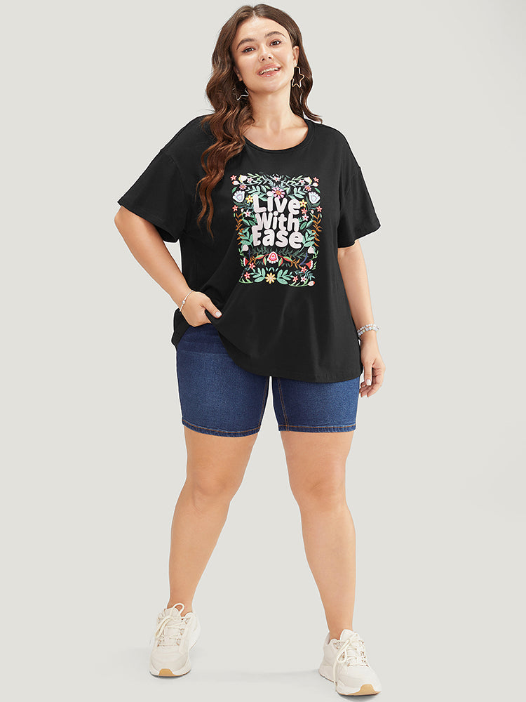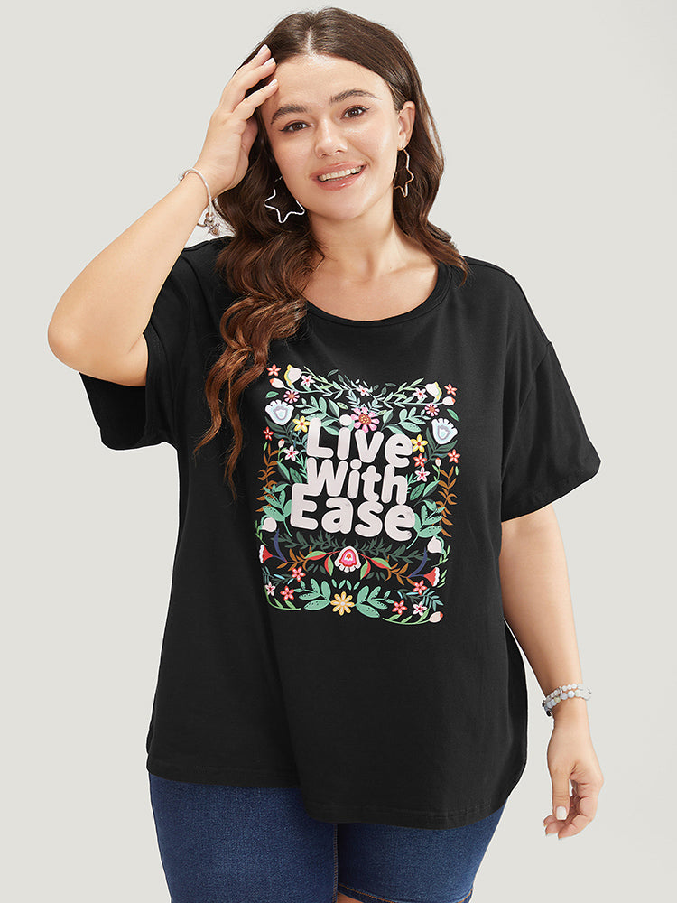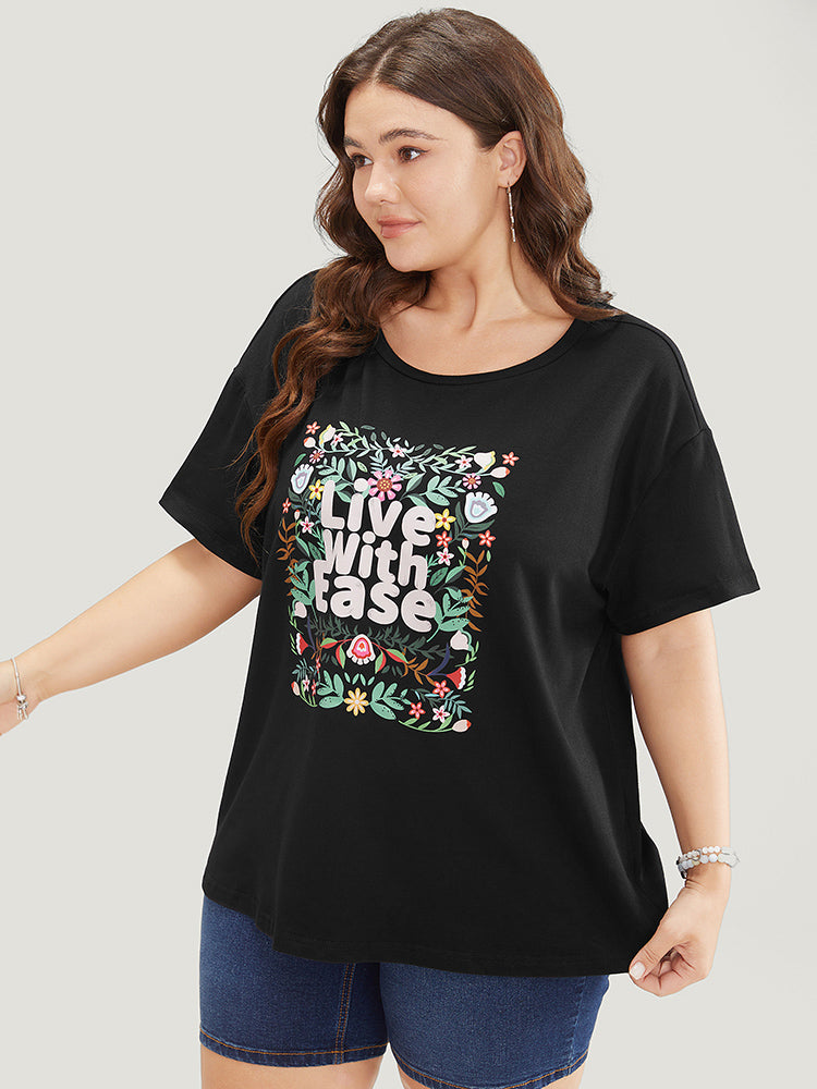 Shop Floral & Slogan Print Slightly Stretchy Casual T-shirt now and redefine your style with confidence at BloomChic. Tailored for mid and plus-size women. This trendy Tops Women, sizes 10-30. Season:Summer;Color:Black;Style:Casual;Pattern Type:Letter, Positive slogan, Natural Flowers;Details:Printed, Plain