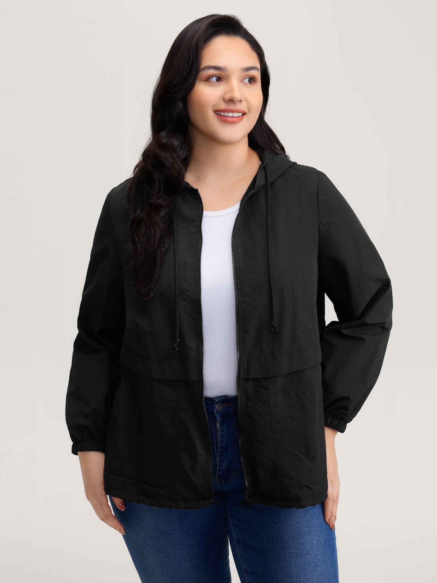 Plain Hooded Drawstring Gathered Zipper Jacket