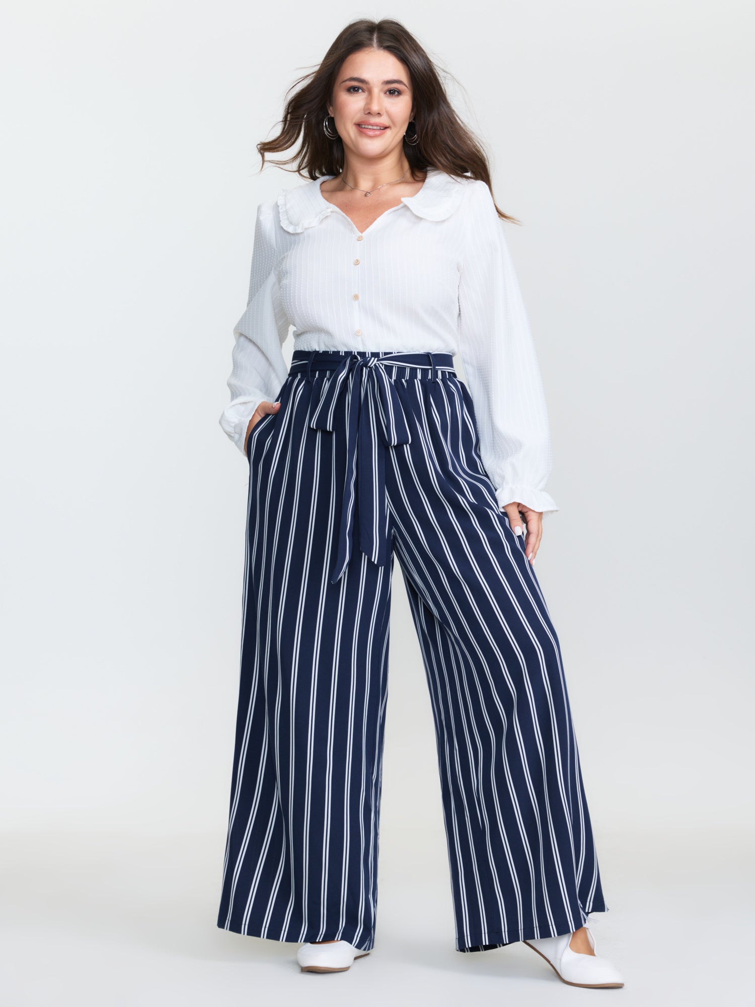 Striped Belted Straight-Leg Pants