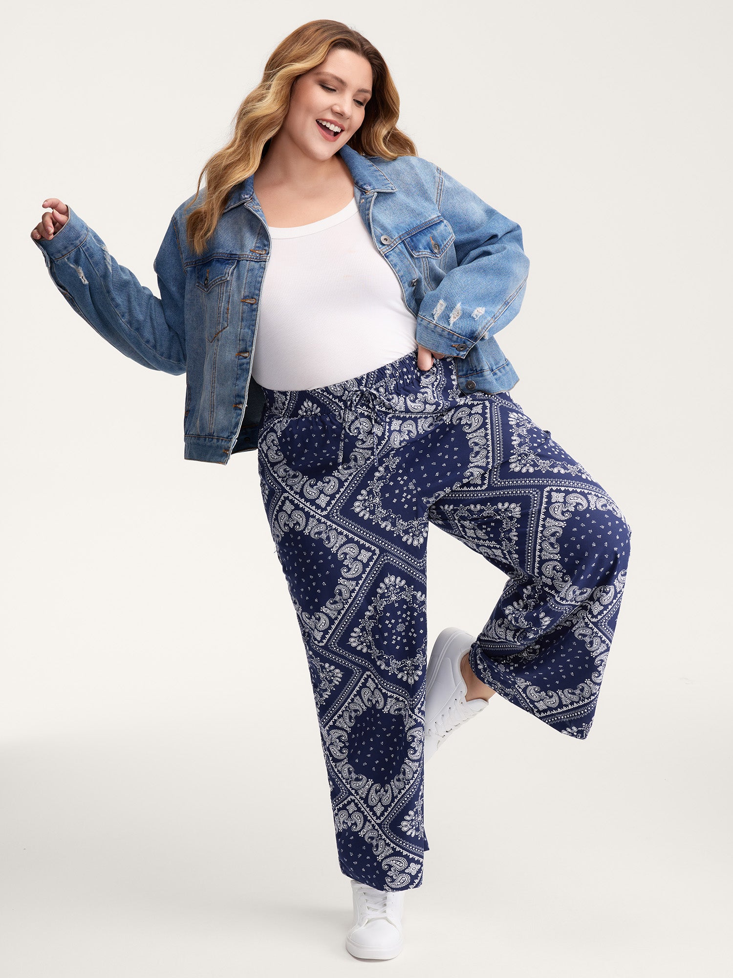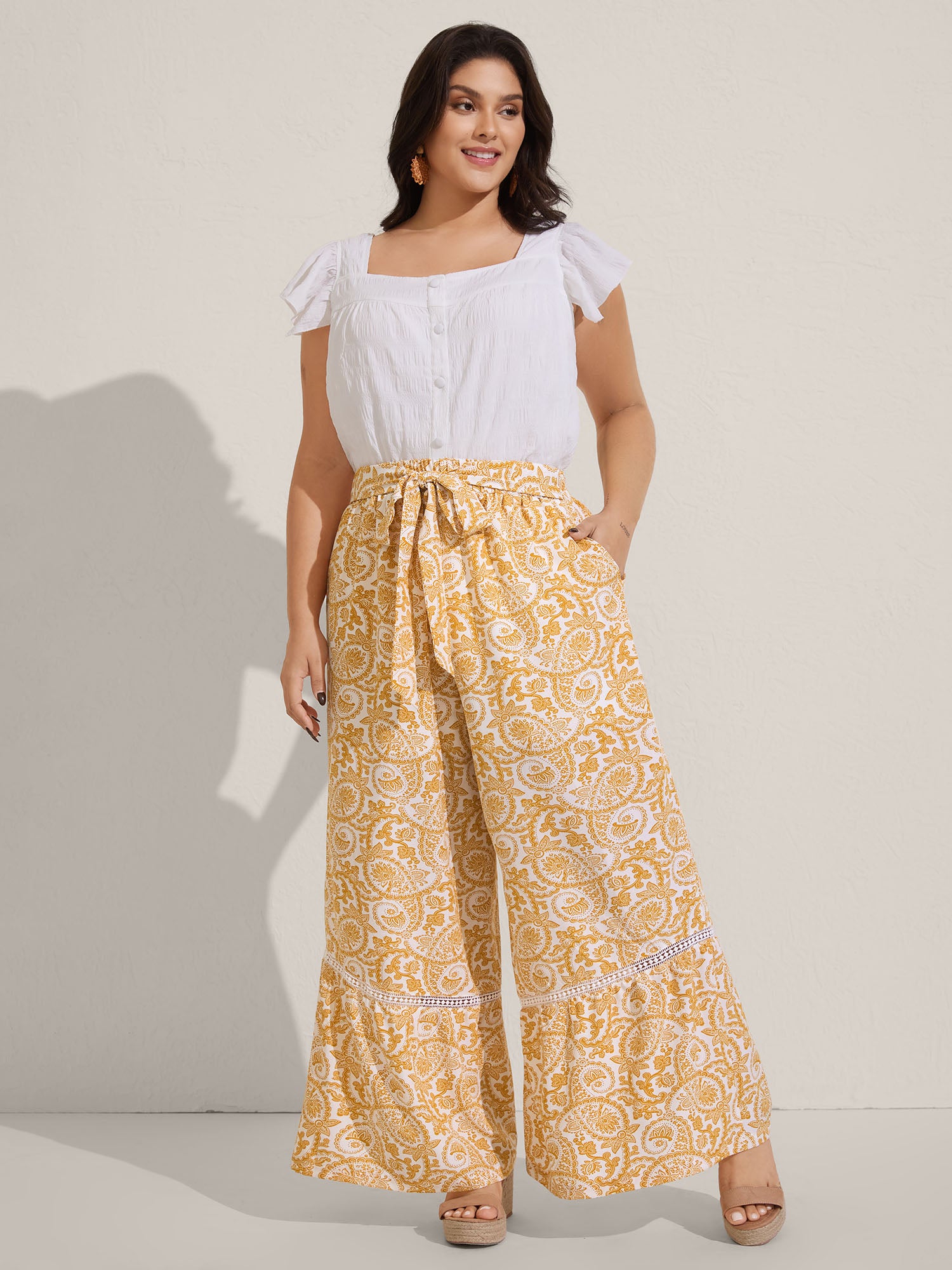Paisely Print Lace Trim Wide-Leg Pants