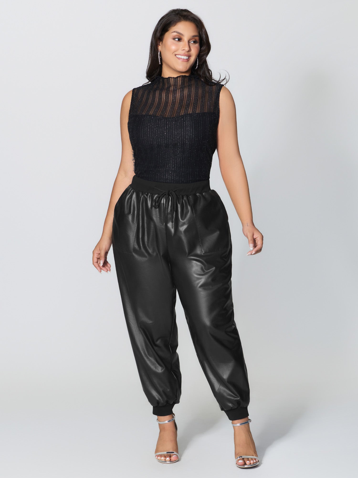 Ribbed Trim Spliced Leather Drawstring Pants