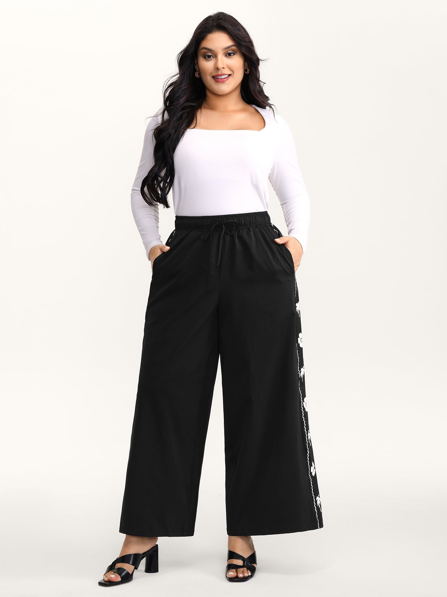 Floral Side Drawstring Wide-Leg Pants