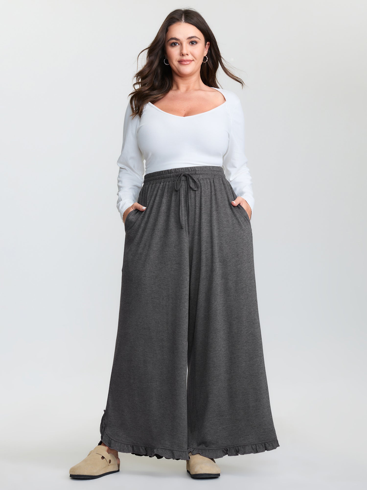 Stretchy Ruffled Trim Wide-Leg Pants