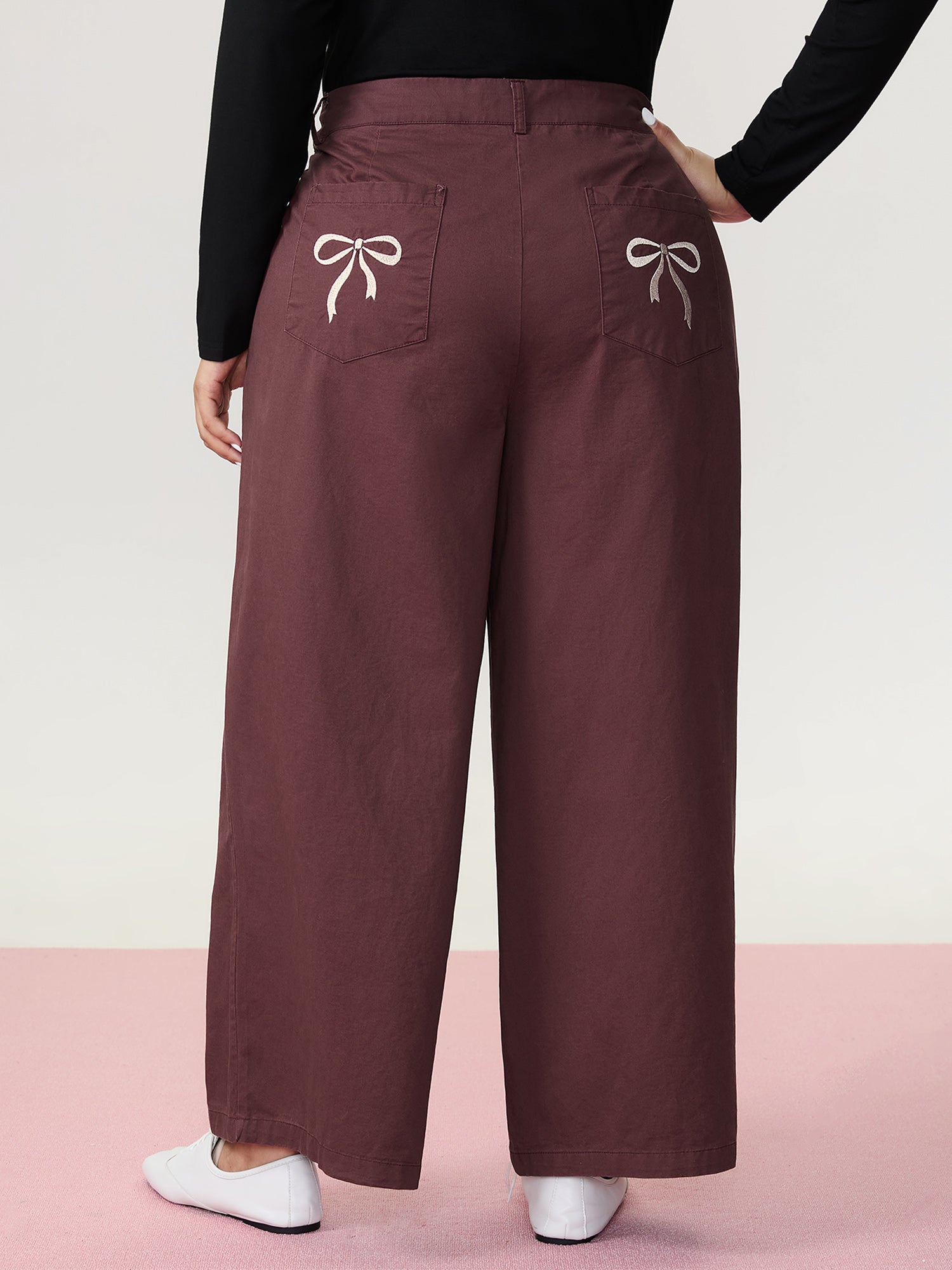 Bow Embroidery Pockets Plain Pants