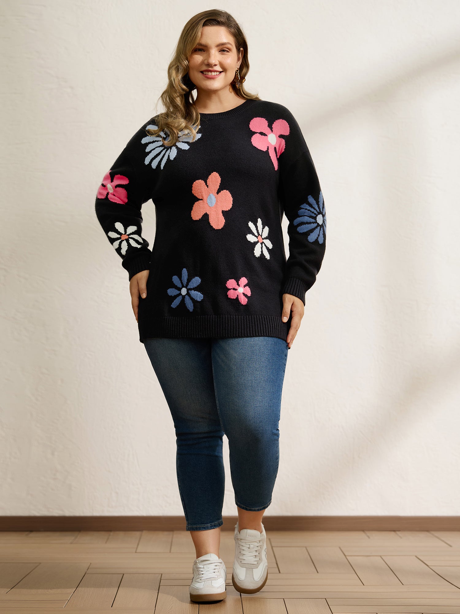 Shop Supersoft Large Flower Jacquard Pattern Pullover now and redefine your style with confidence at BloomChic. Tailored for mid and plus-size women. This trendy Sweaters Cardigans Women, sizes 10-30. Color:Black;Style:Playful;Neckline:Round Neck;Sleeve Type:Drop shoulder sleeve;Prints:Floral;Details:Contrast;Pocket:No-pocket;Belt:No-belt;Closure Type:Non