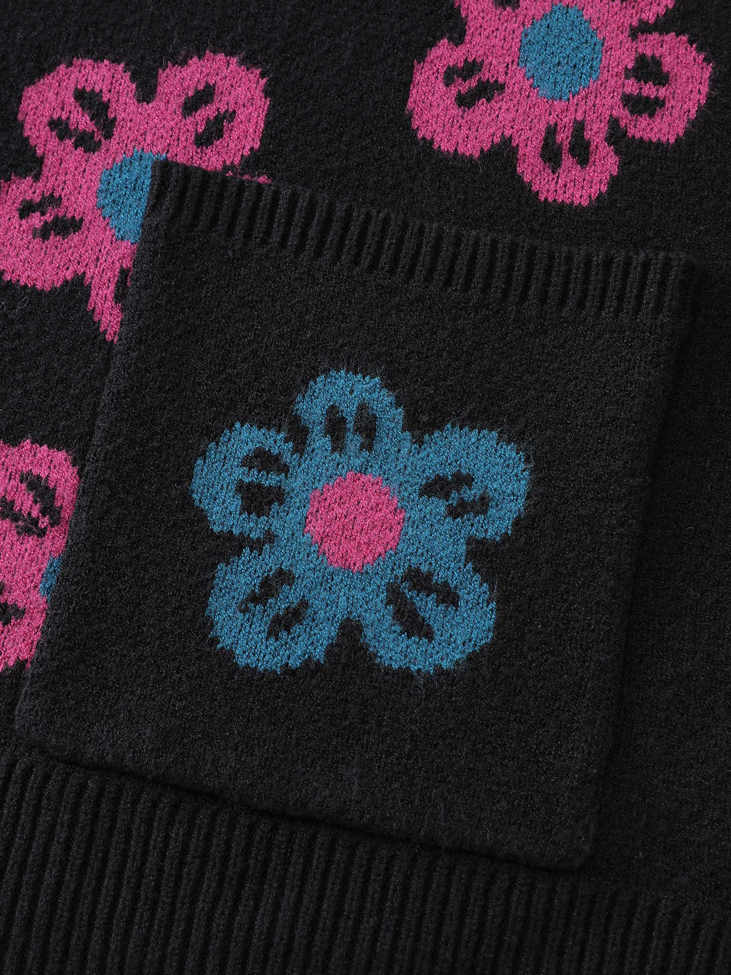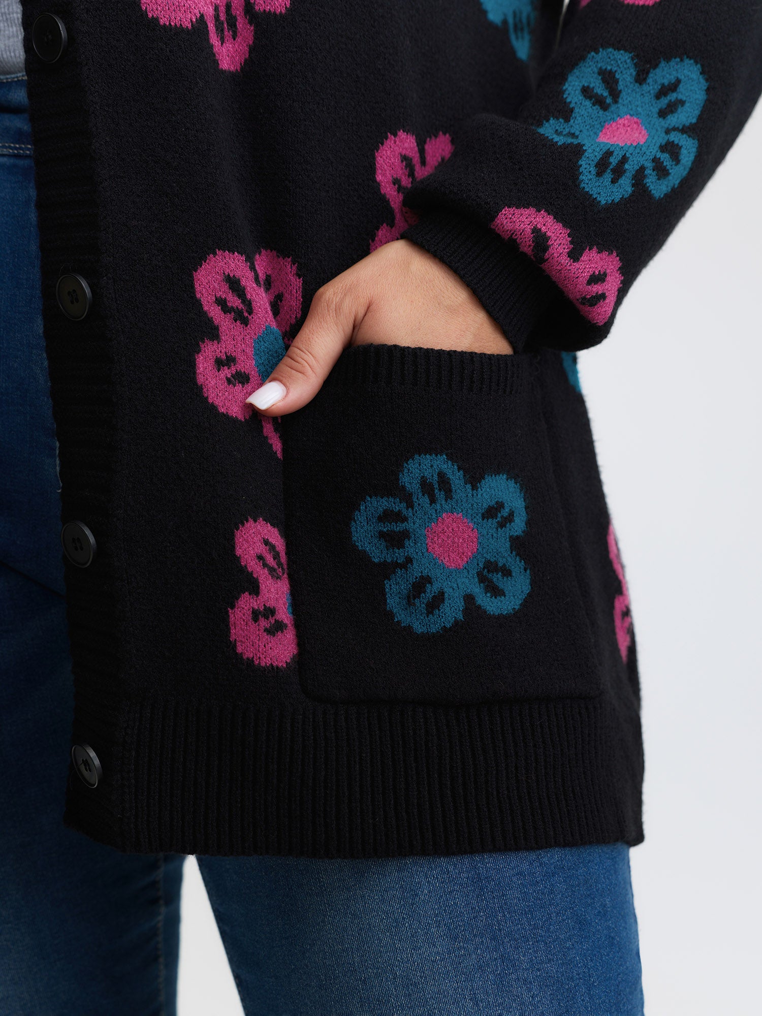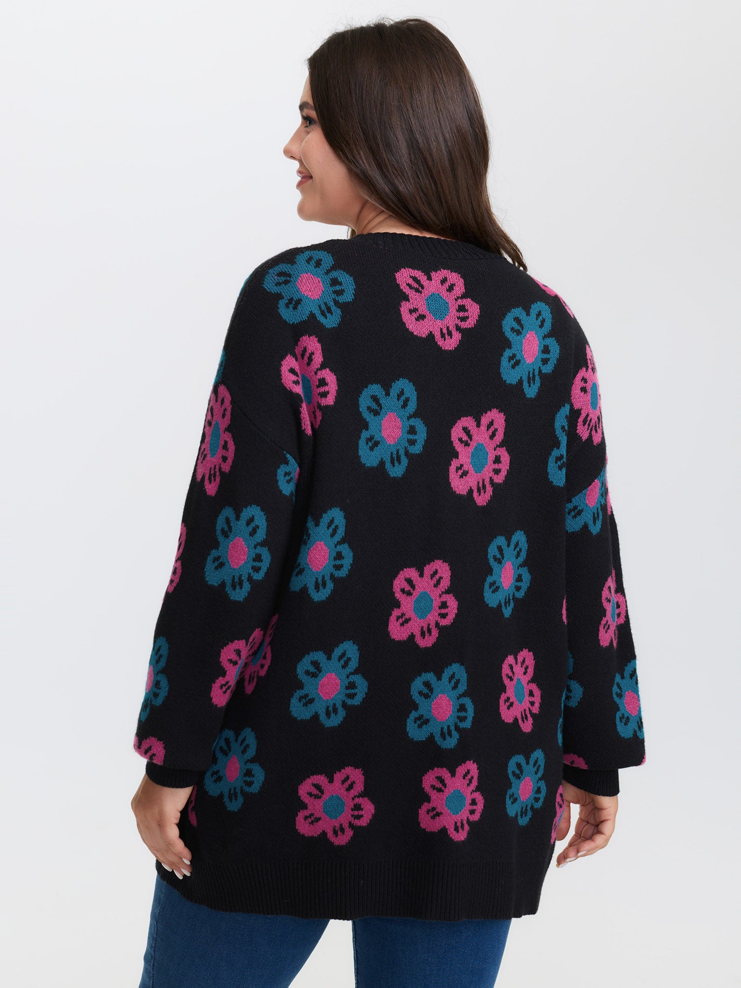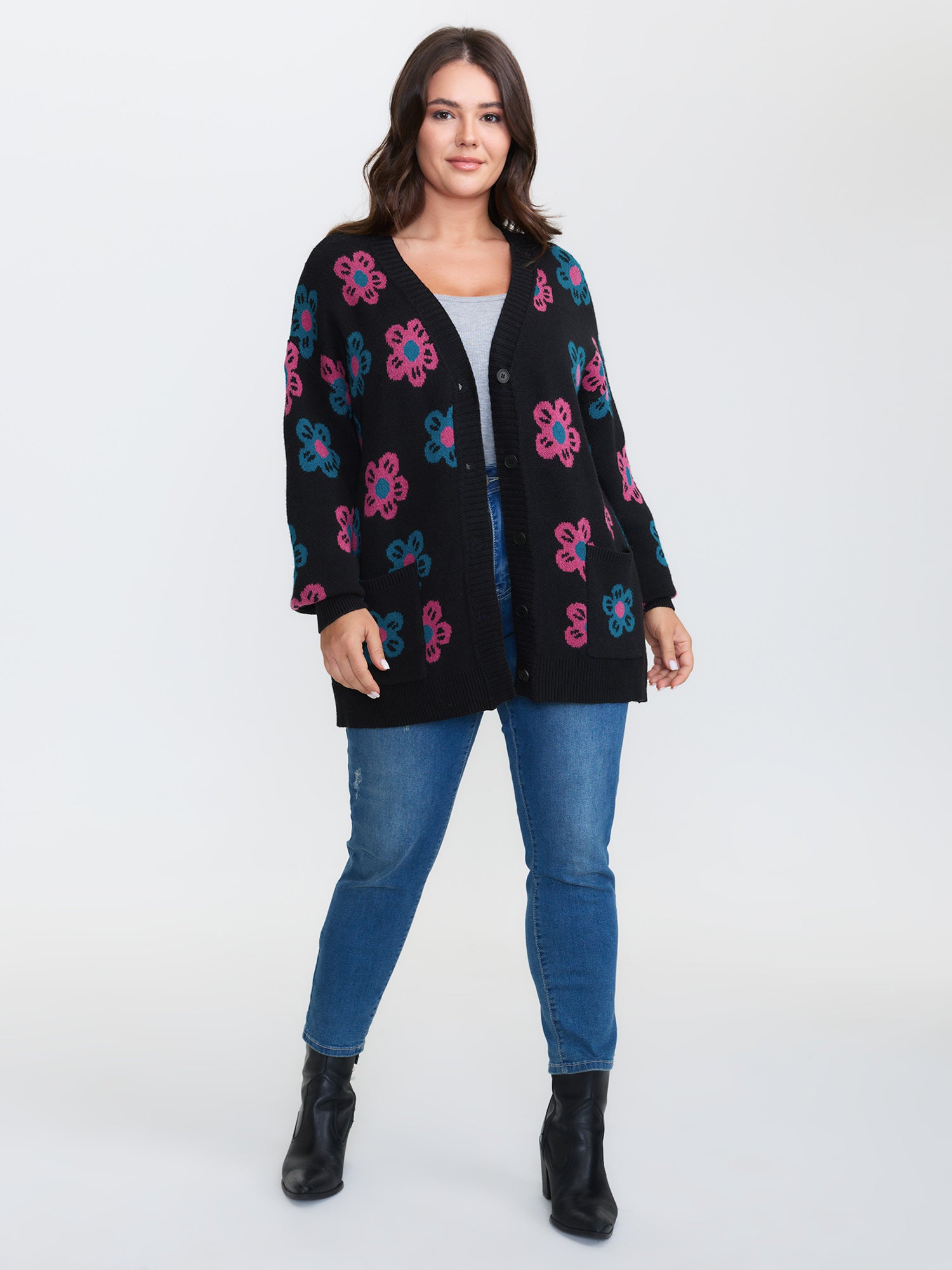 Shop Supersoft Colorful Floral Drop Shoulder Knit Cardigan now and redefine your style with confidence at BloomChic. Tailored for mid and plus-size women. This trendy Sweaters Cardigans Women, sizes 10-30. Color:Black;Style:Playful;Neckline:V-neck;Sleeve Type:Drop shoulder sleeve;Prints:Floral;Details:Contrast, Button;Pocket:Patch pocket;Belt:No-belt;Closure Type:Button