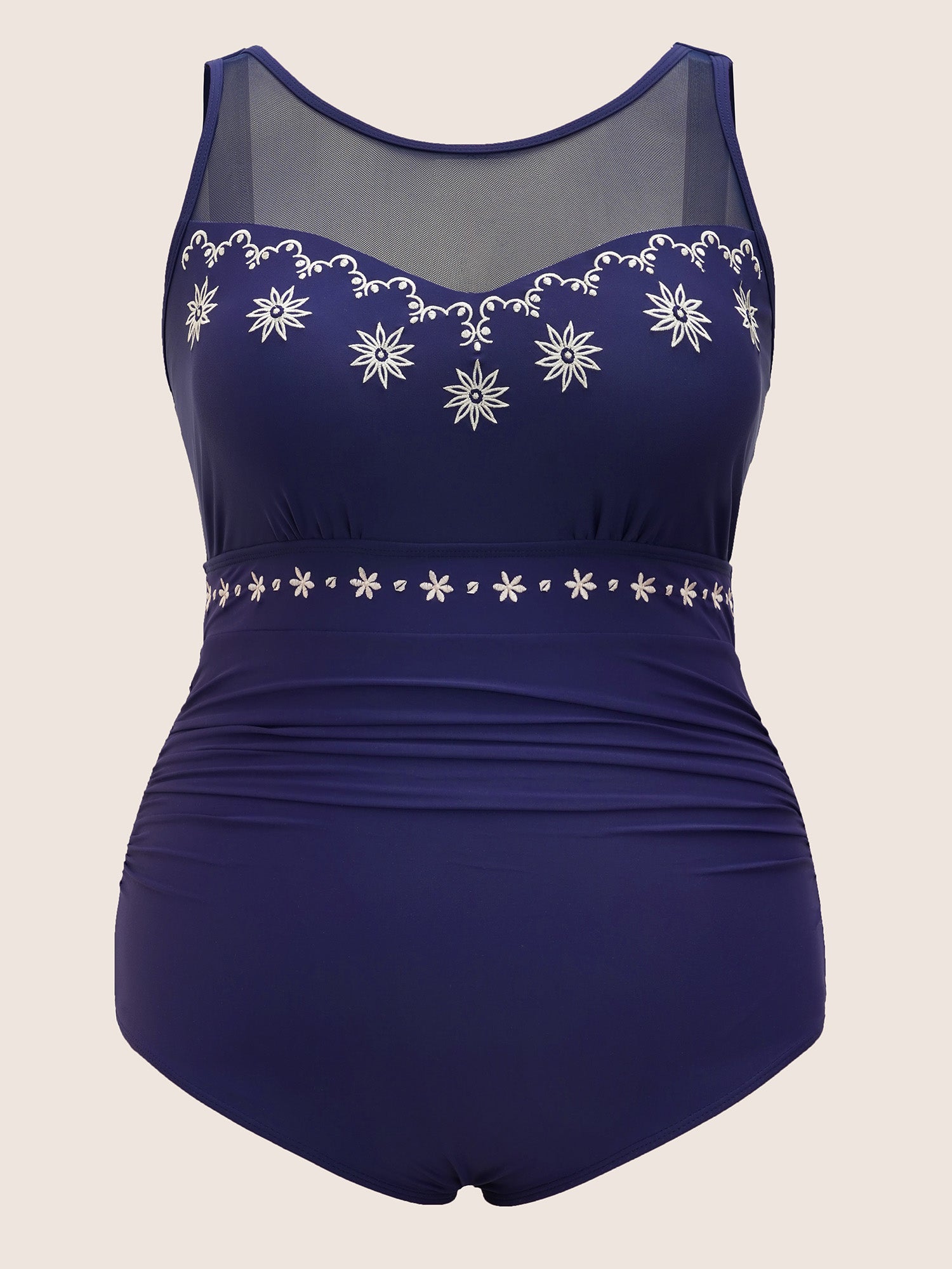 Shop Floral Embroidered Mesh Patchwork Ruched One Piece Swimsuit now and redefine your style with confidence at BloomChic. Tailored for mid and plus-size women. This trendy Swimwear Women, sizes 10-30. Season:Summer;Color:Indigo;Style:Beach;Cup Type:Removable cups;Waist Design:High Rise;Neckline:Round Neck;Sleeve Type:Sleeveless;Pattern Type:Natural Flowers;Prints:Floral;Details:Embroidered, Patchwork, See through, Gathered;Pocket:No-pocket;Belt:No-belt;Chest pad:Removable Padding;Lining:Lining;Closure Type:Non