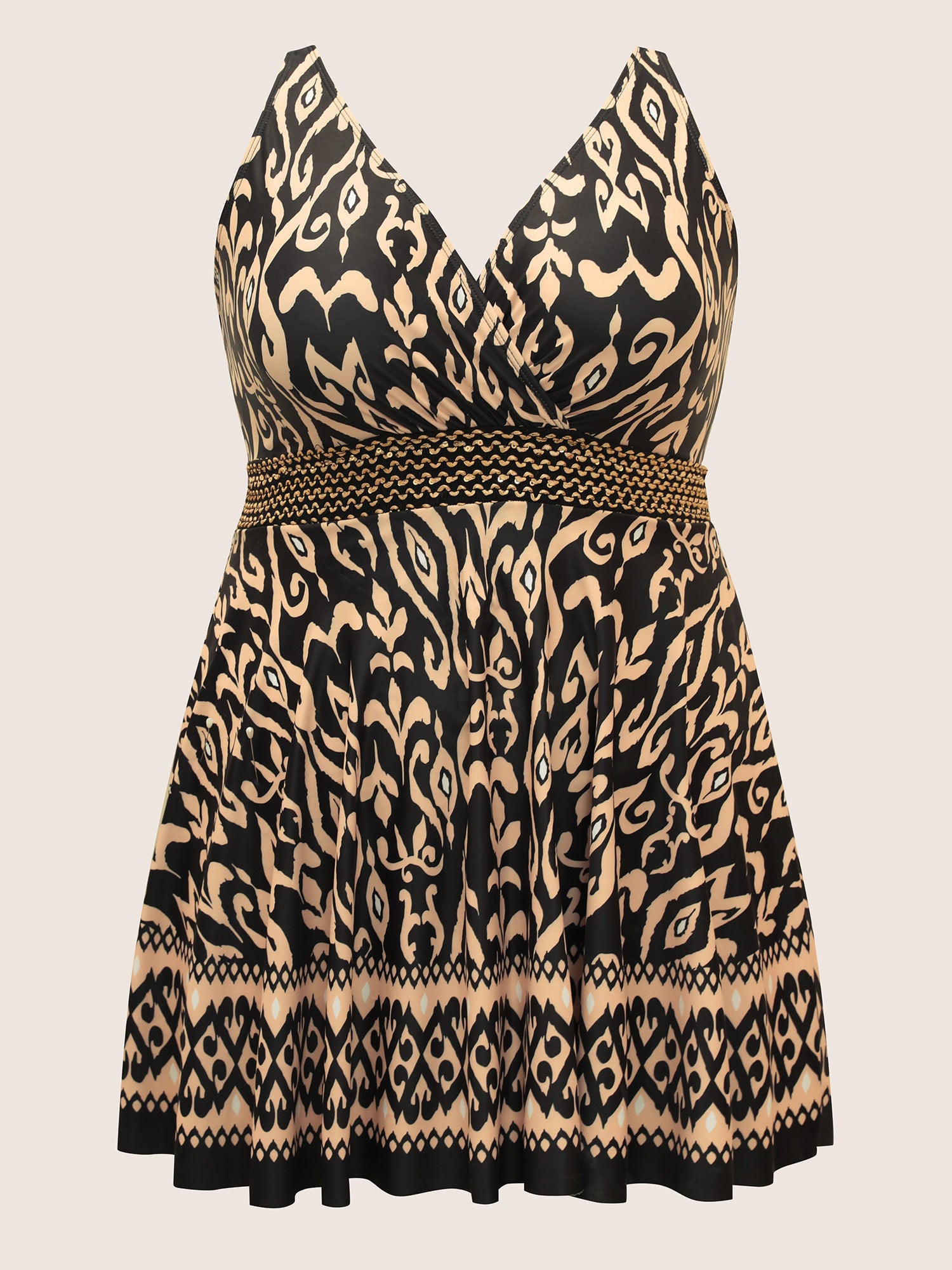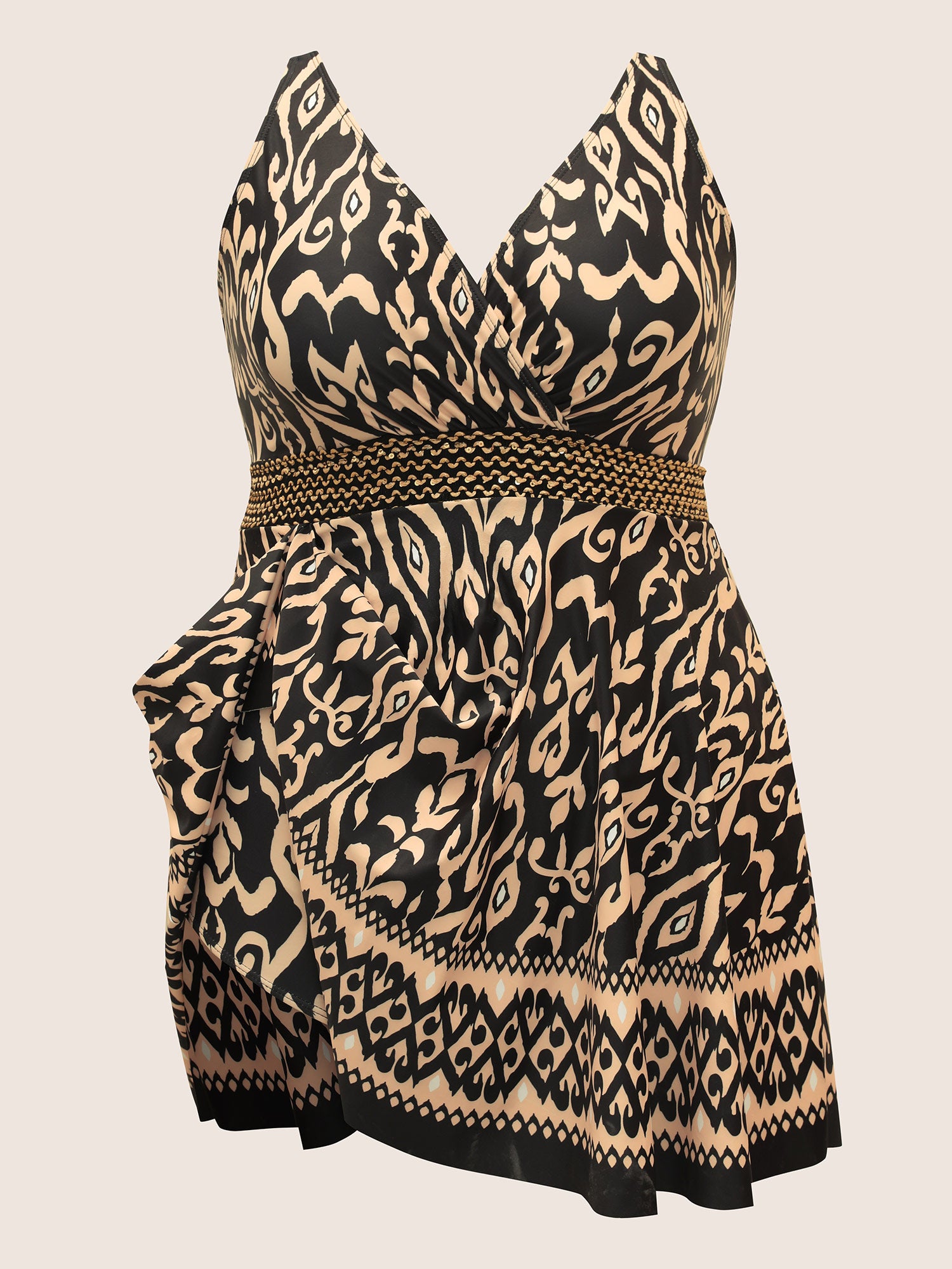 Shop Boho Print Overlap Collar Woven Ribbon Swim Dress now and redefine your style with confidence at BloomChic. Tailored for mid and plus-size women. This trendy Swimwear Women, sizes 10-30. Color:Black,Indigo;Style:Beach Vacation;Cup Type:Removable cups;Waist Design:High Rise;Neckline:Overlap Collar;Sleeve Type:Sleeveless;Prints:Bohemian print;Details:Woven ribbon&lace trim, Patchwork;Pocket:No-pocket;Belt:No-belt;Chest pad:Removable Padding;Lining:Lining;Closure Type:Non