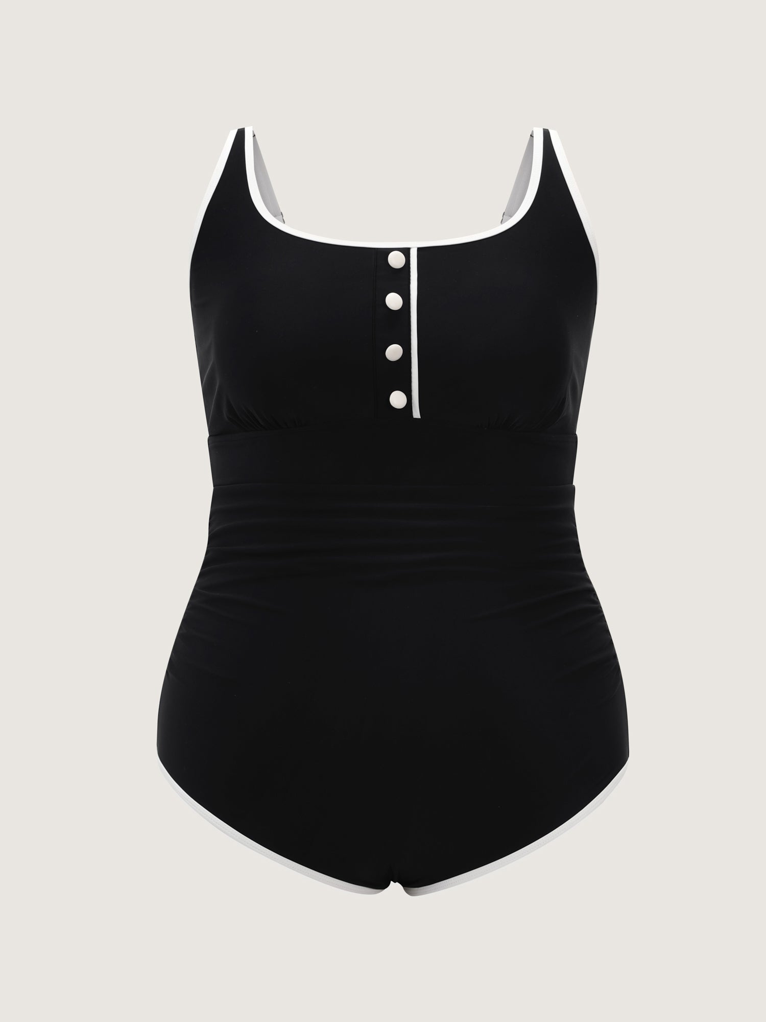 Shop Button Detail Color Contrast One-Piece Swimsuit now and redefine your style with confidence at BloomChic. Tailored for mid and plus-size women. This trendy Swimwear Women, sizes 10-30. Color:Black;Style:Resort;Cup Type:Removable cups;Coverage:Full;Neckline:U-neck;Sleeve Type:Sleeveless;Prints:Non;Details:Button, Contrast, Gathered;Pocket:No-pocket;Belt:No-belt;Chest pad:Removable Padding;Lining:Lining;Closure Type:False placket;Structural function:Tummy-Sculpt,Adaptive-Fit;Swimsuit types:One-Piece Triangle Swimsuit