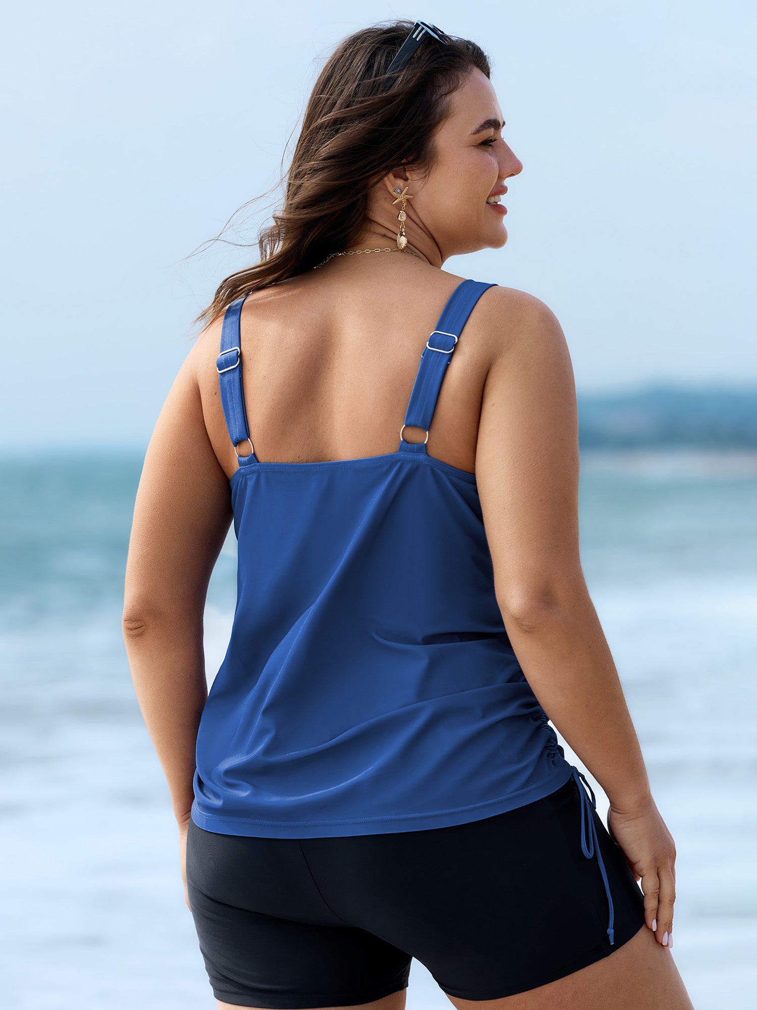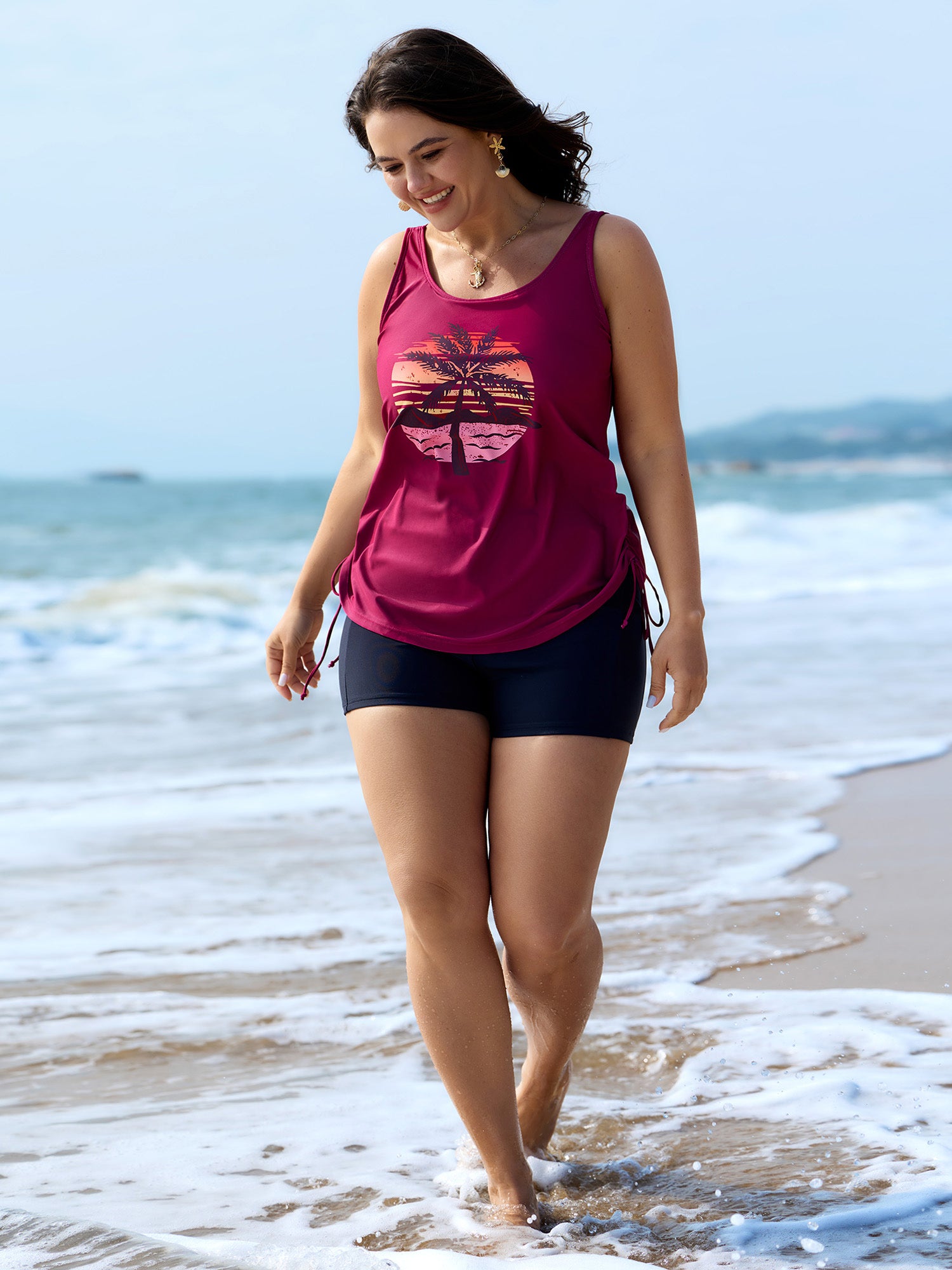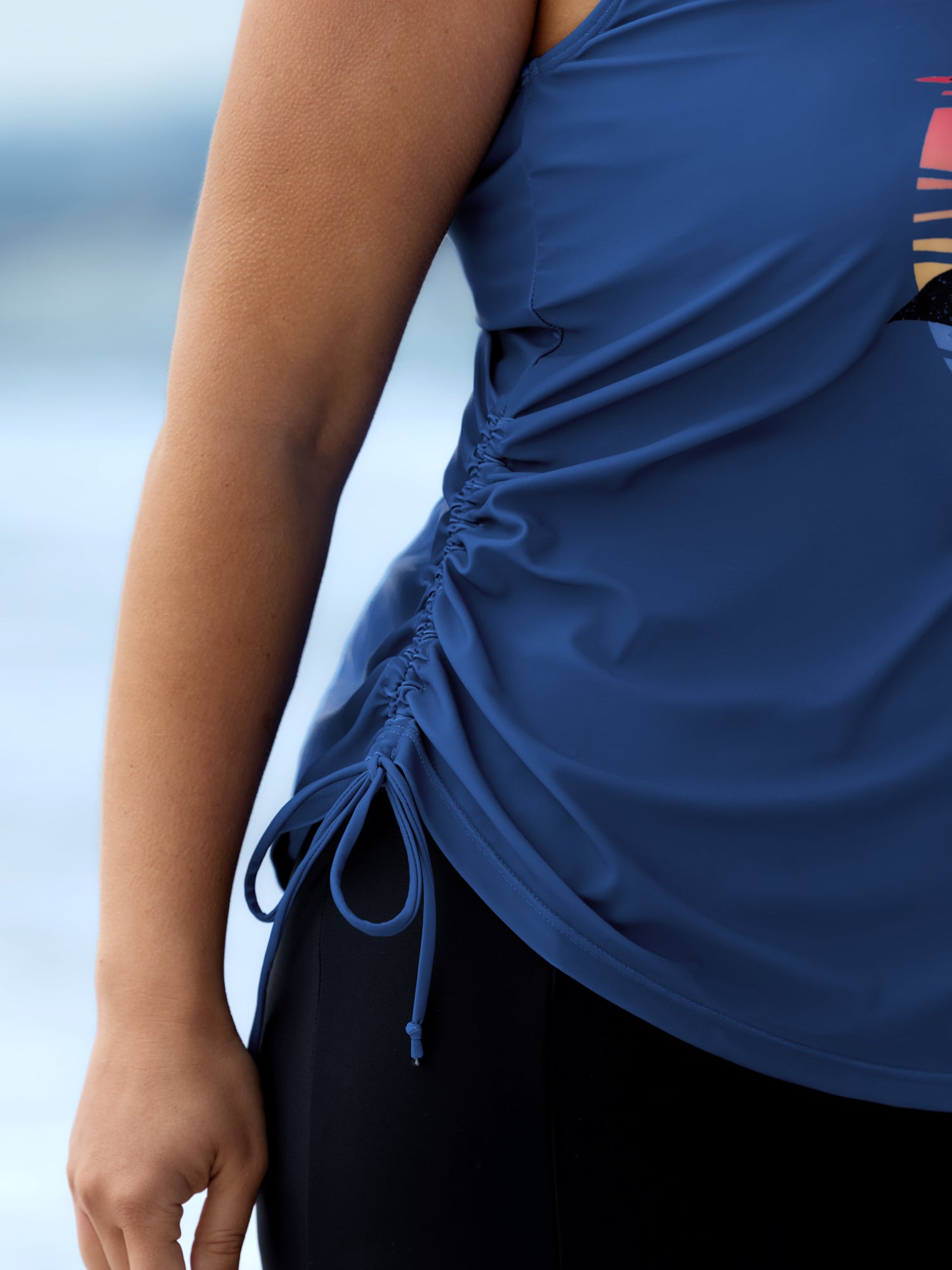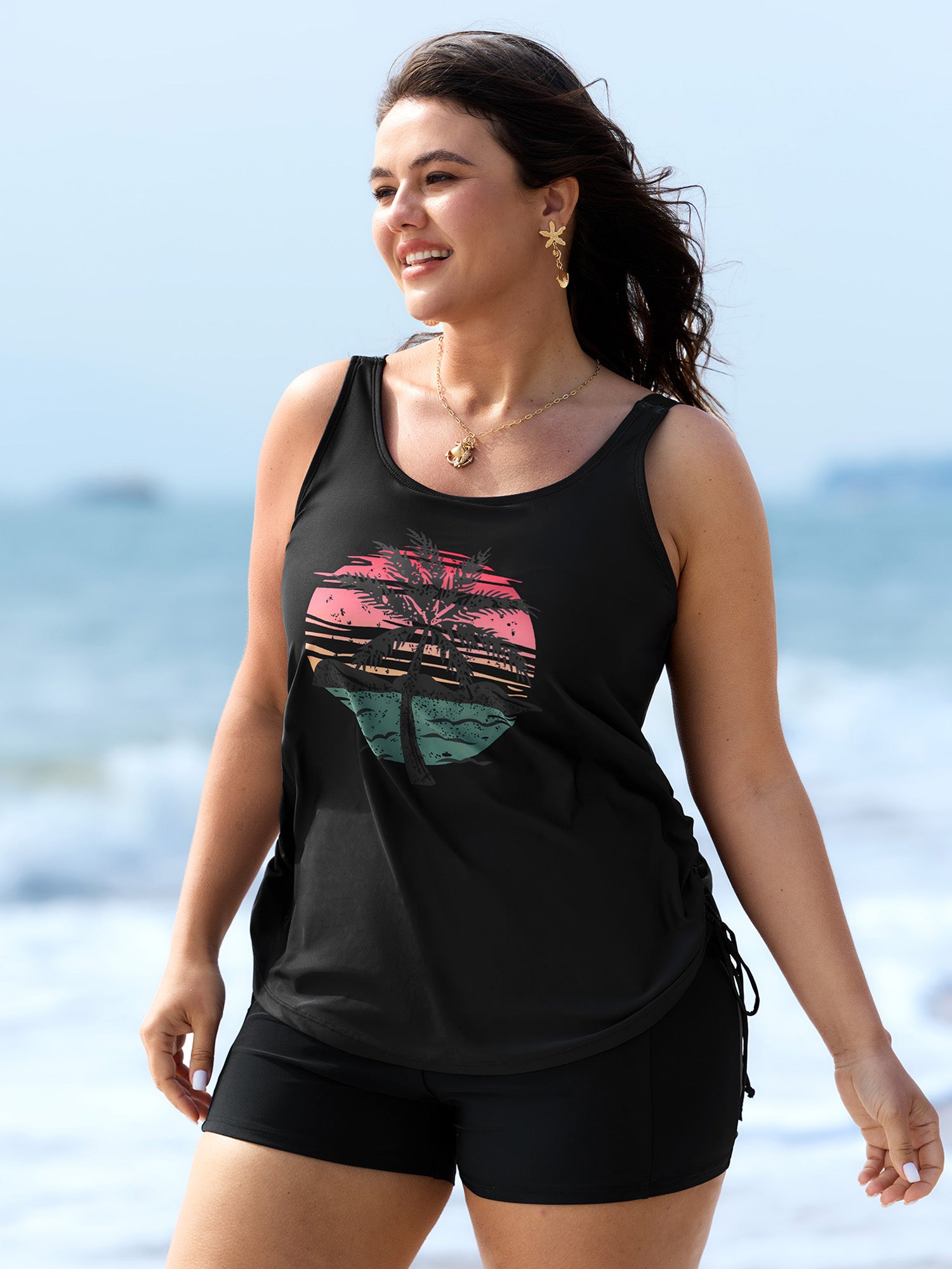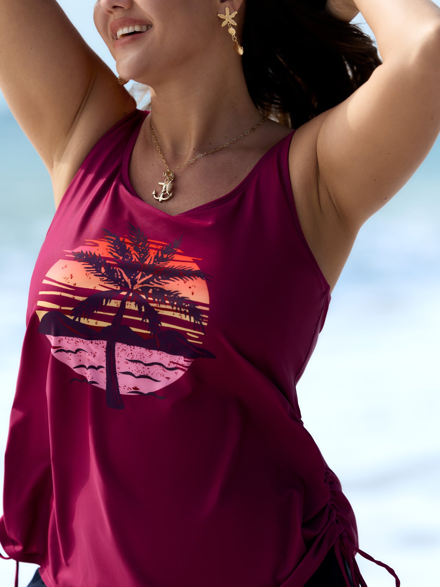 Shop Island Print Drawstring Adjustable Swim Top now and redefine your style with confidence at BloomChic. Tailored for mid and plus-size women. This trendy Swimwear Women, sizes 10-30. Color:Teal, Black, Indigo, Emerald, Eggplant, Mauve, Army Green, Midnight, Rosered, Sky Blue, Lilac;Style:Resort Vacation;Cup Type:Fixed cups;Pattern Type:Tropical;Prints:Landscape pattern;Details:Drawstring, Contrast;Pocket:No-pocket;Belt:No-belt;Chest pad:Non-removable padding